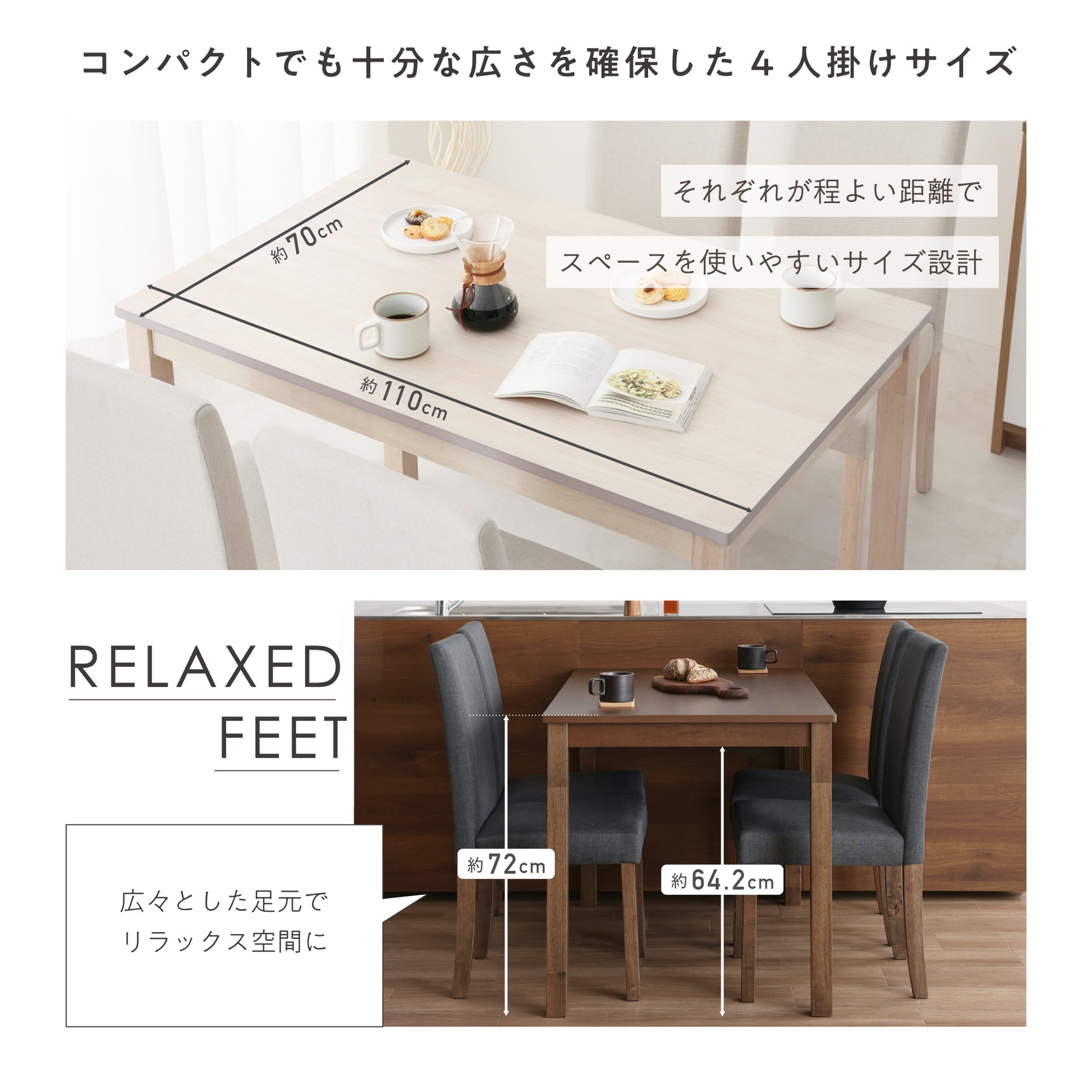限られたスペースの中でも、4人でゆったり使える広さを確保しました。程良い距離感でスペースを使いやすく、家族や友人との食事を楽しく演出します。足元がすっきりとしたシンプルな構造で、広々とした空間を確保し快適に過ごせます。使わない時はチェアをテーブル下に収納できるので、すっきりした印象のダイニング空間に。
