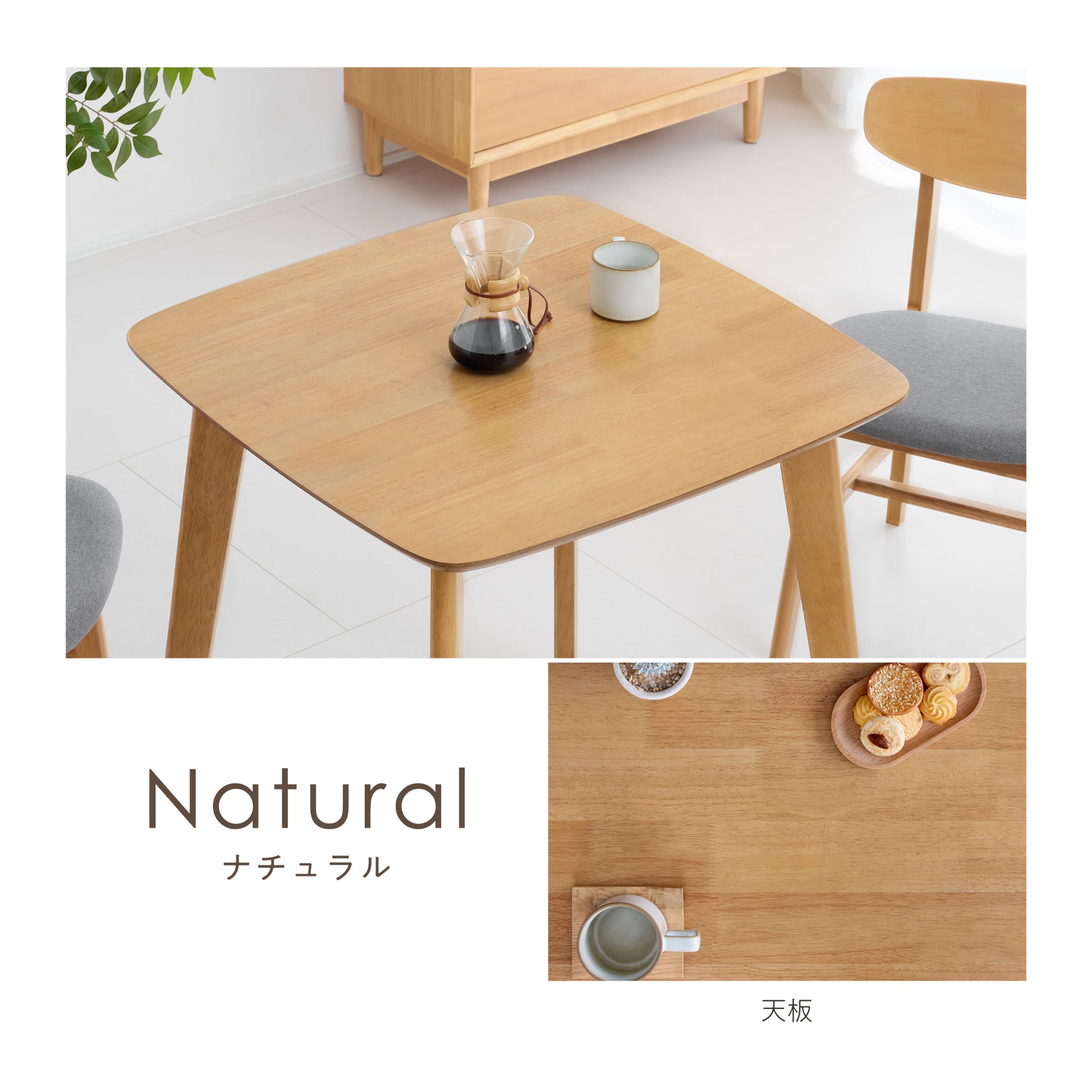 天然木ラバーウッドの持つ自然な木肌の温もりと柔らかな曲線フォルムが調和し、穏やかで美しい佇まいを実現します。柔らかさを持たせたフォルムにより、省スペースでも圧迫感なく空間になじみます。75cm×75cmの天板は日常使いに取り入れやすいサイズで、一人暮らしや二人の食卓にも程良く収まります。シンプルな中に木の表情を感じられ、食事の時間に心地良さを添えてくれるダイニングテーブルです。