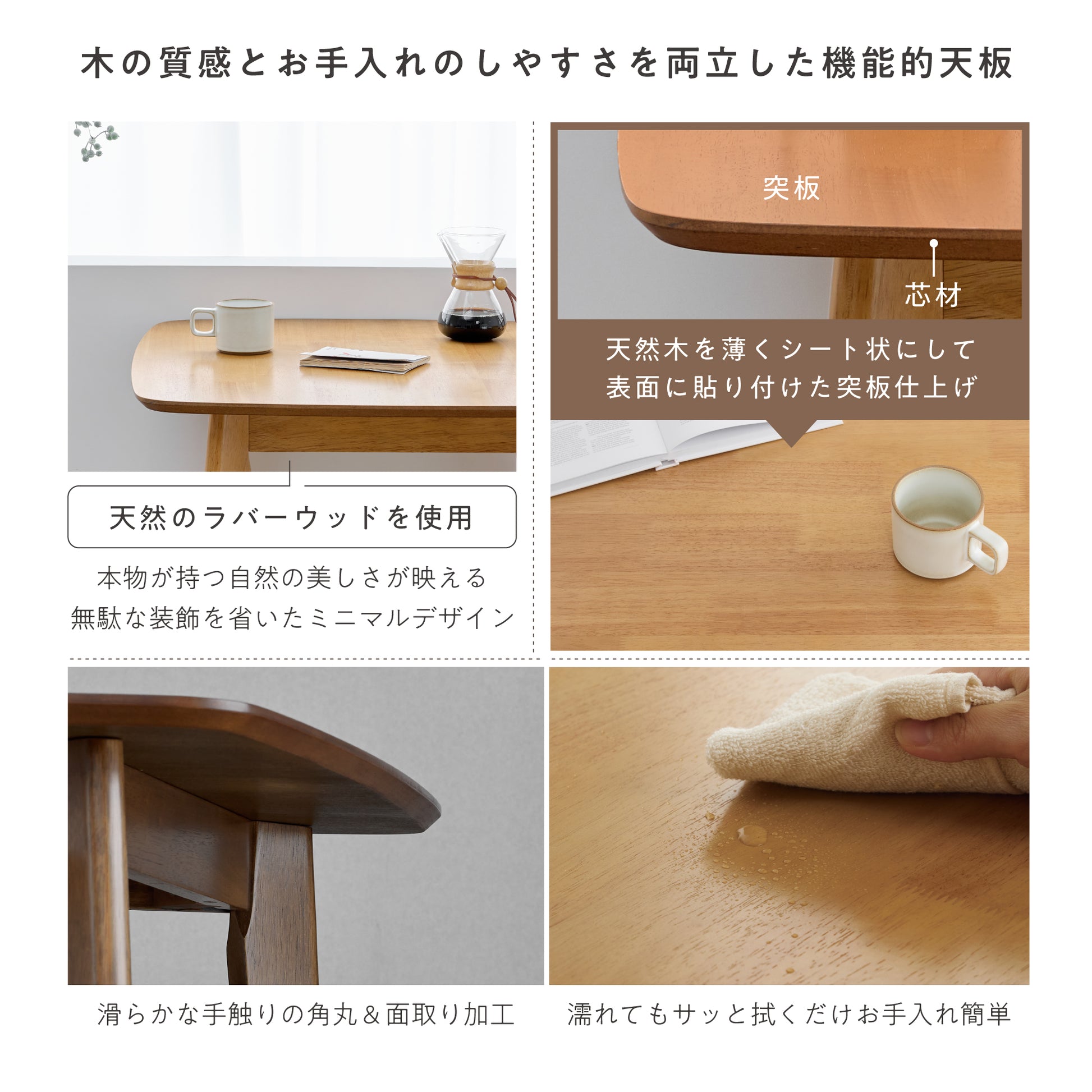 天然木ラバーウッドの美しい木目と温もりを活かした天板を、化粧MDFに張り合わせることで無垢材の質感を保ちつつ、反りや割れに強い安定性を実現。高品質ウレタン塗装により水や汚れに強く、お手入れも簡単です。角は面取り加工で丸く仕上げ、小さなお子様のいるご家庭でも安心。日々の食事やくつろぎに快適に対応できる、使いやすさと美しさを両立した天板です。