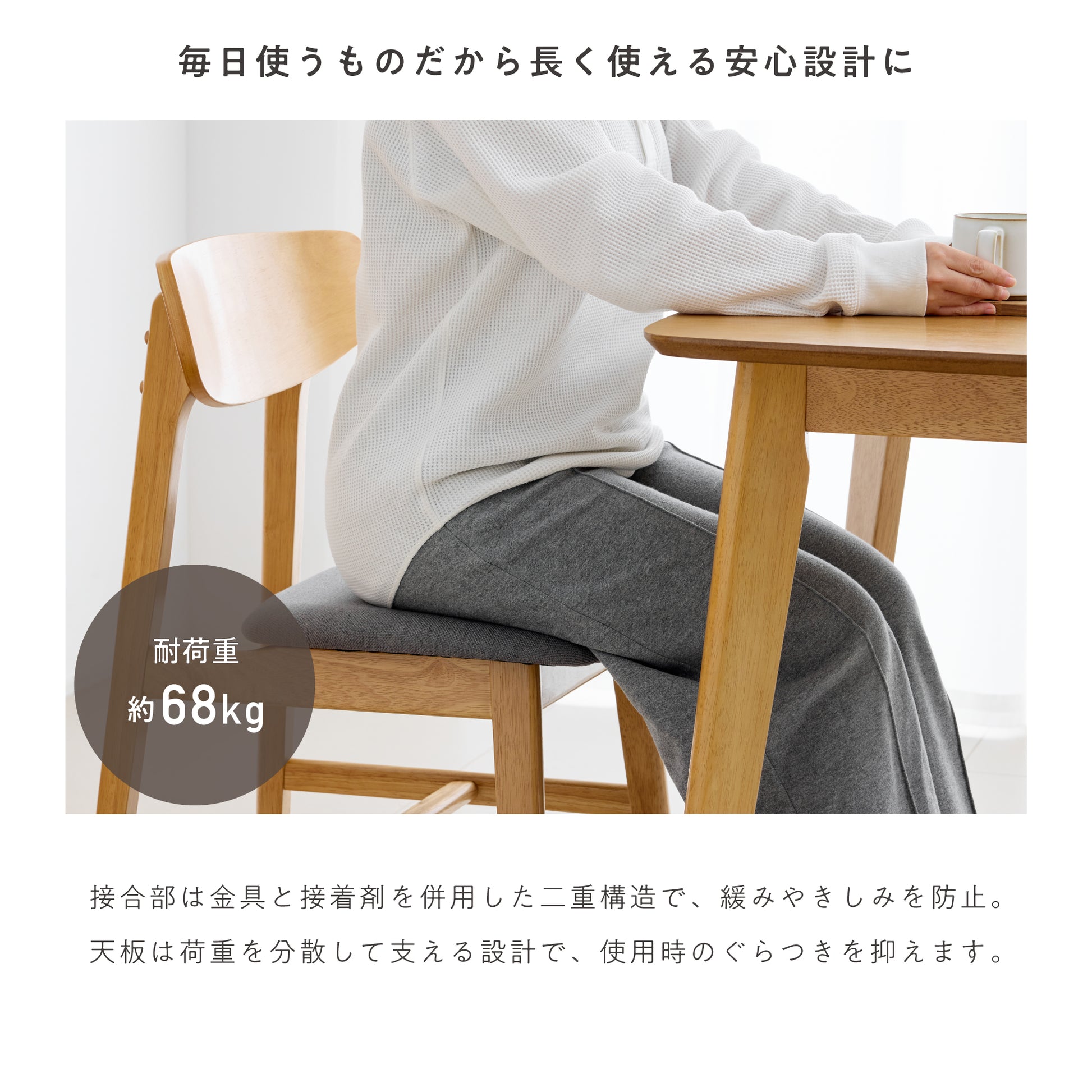 約68kgの耐荷重を確保した構造設計で、日常でも安心してお使いいただけます。接合部には金具と接着剤を併用した二重構造を採用し、長期間の使用でも緩みやきしみが起こりにくい設計に。天板は荷重を分散して支える構造とし、使用時のぐらつきを抑えています。安定感のある設計で、家族みんなが安全で快適に使えるダイニングテーブルです。