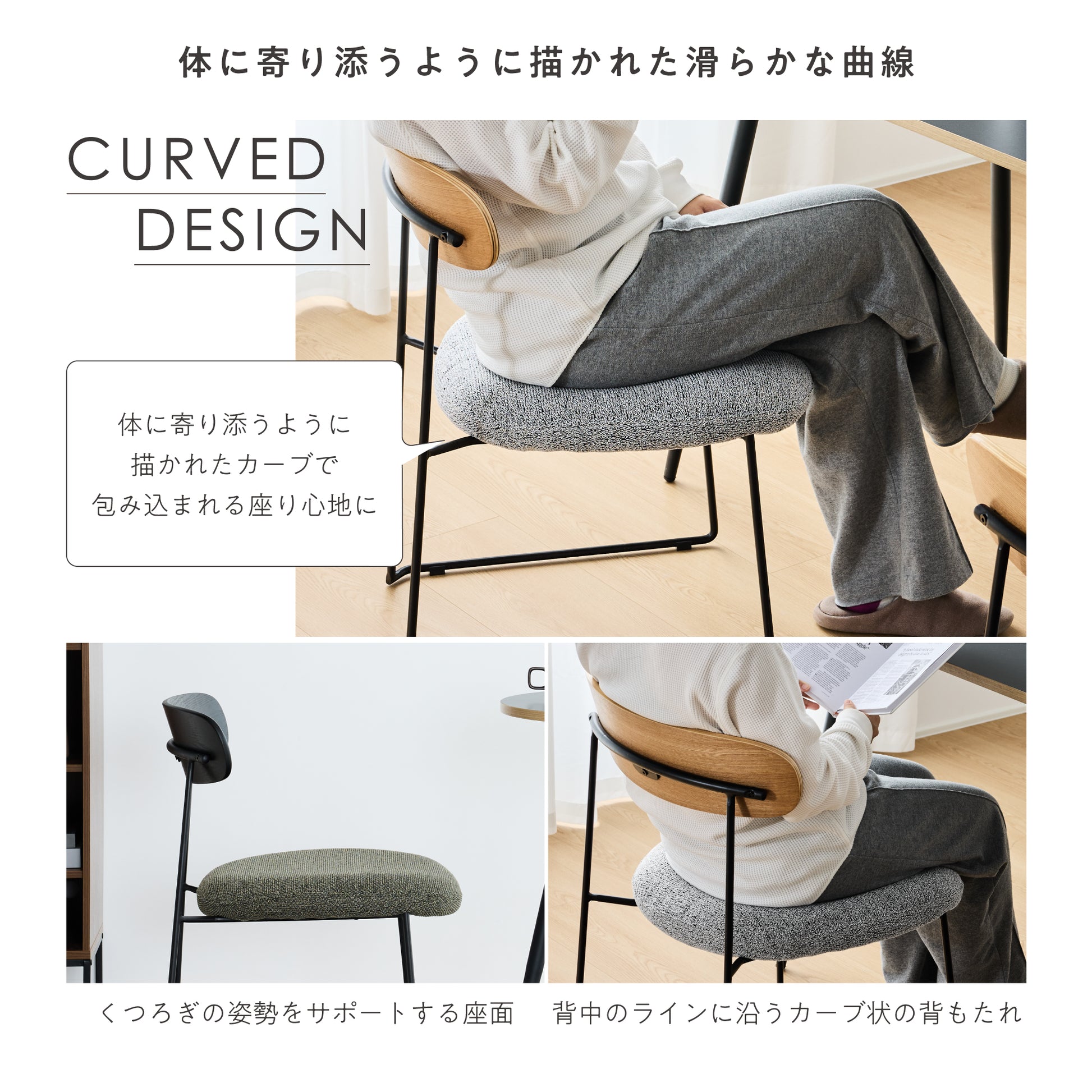 背中のラインに寄り添うように描かれた滑らかなカーブが、まるで包み込まれるような安心感をもたらし、長時間の食事や語らいの時間も快適に。上質な曲線美と座り心地が調和したデザインは、空間に洗練された雰囲気を添えながら、毎日のひとときをより豊かに彩ります。