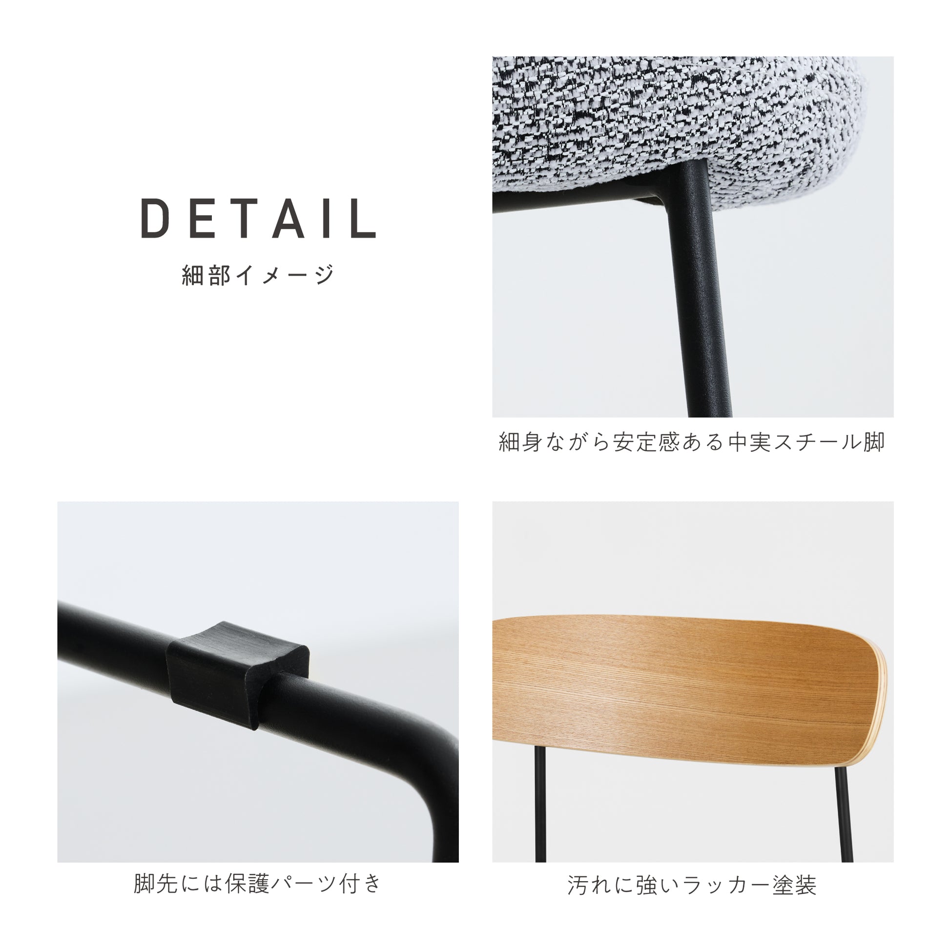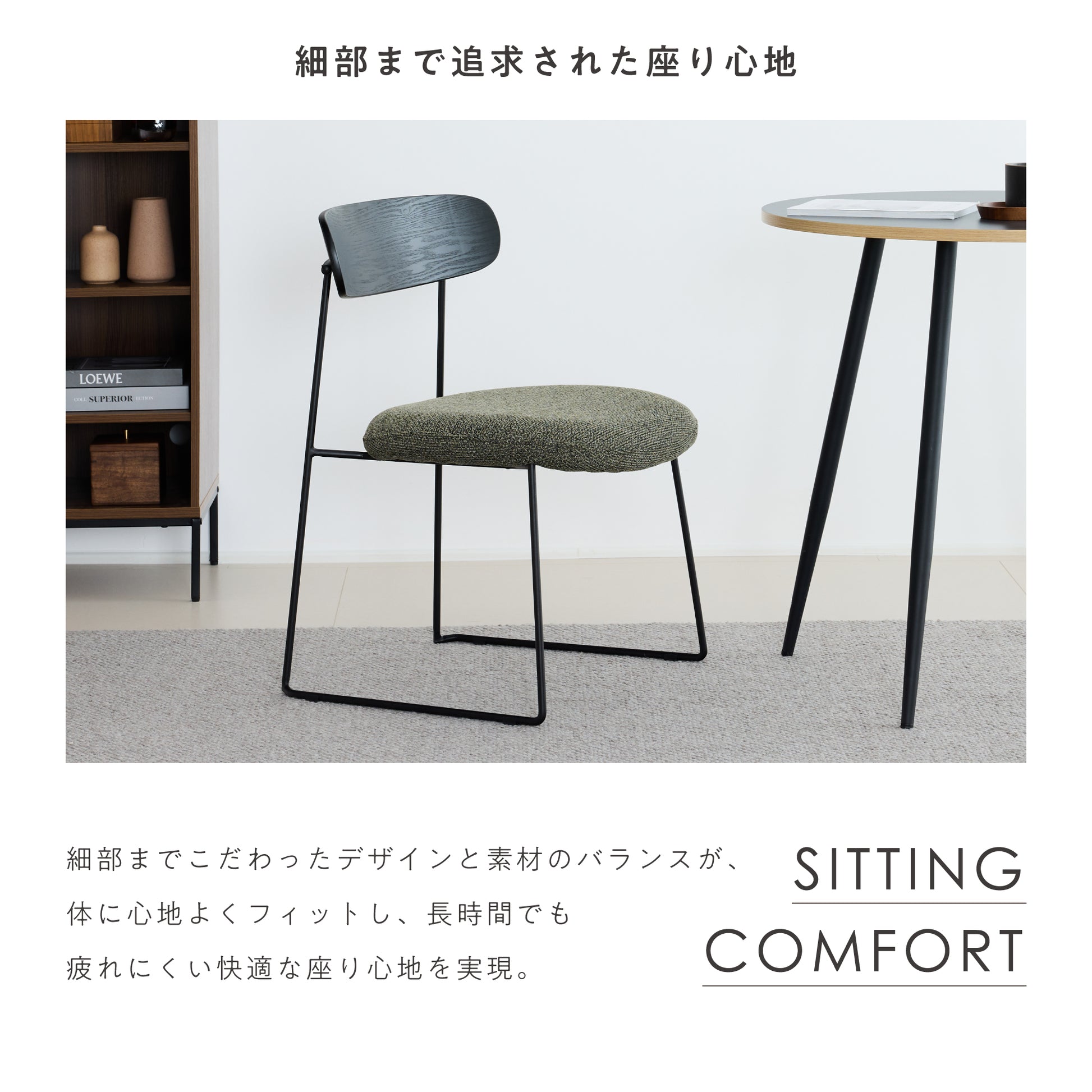 スリムなブラックスチール脚が、チェアのデザインを引き締めながら、全体のバランスをセンス良くまとめています。ツヤを抑えた質感が上品なマット仕上げで、よりスタイリッシュな印象に仕上げました。
