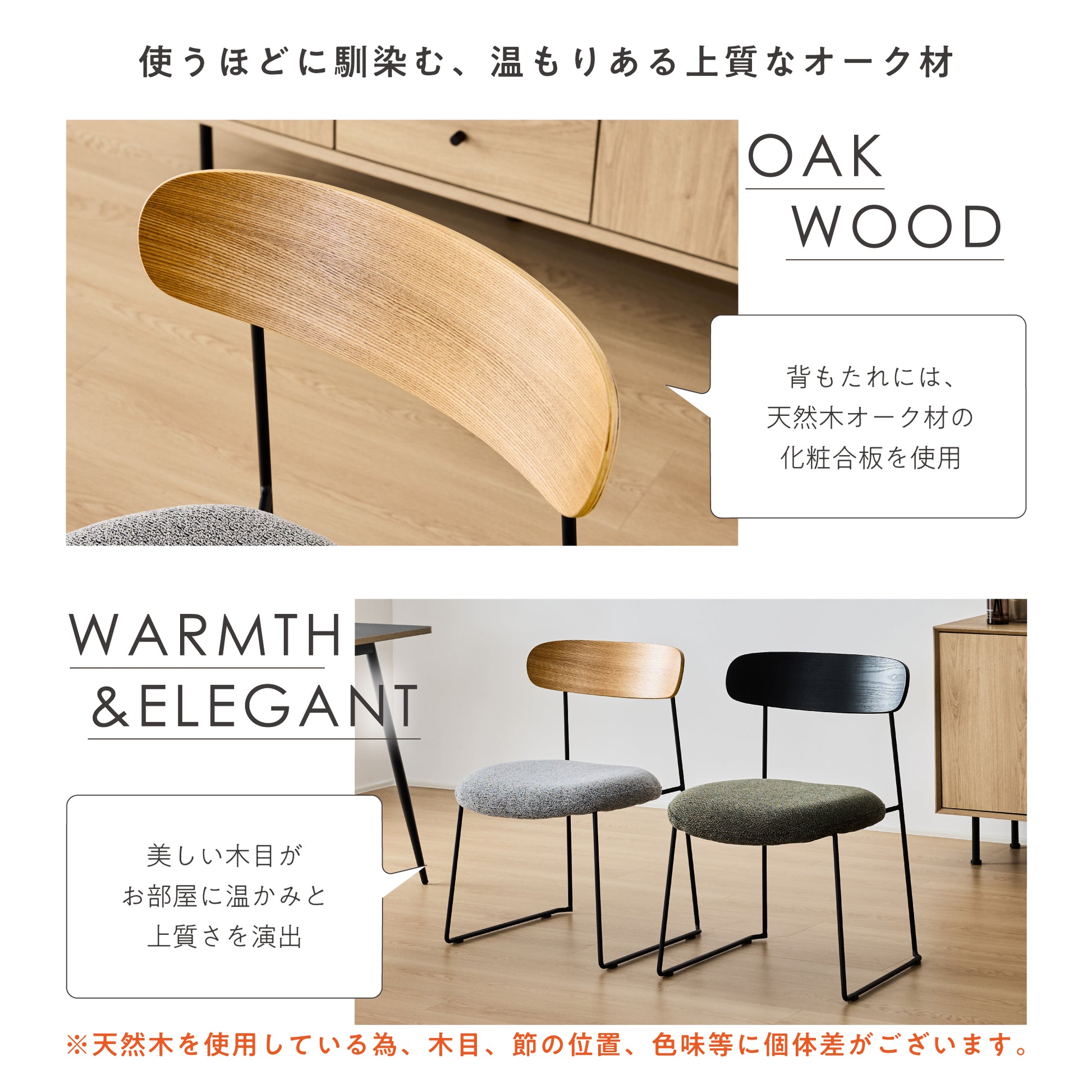 ダイニングチェアLizon(リゾン)は、洗練されたデザインと快適な座り心地を兼ね備えた特別なチェアです。オーク材とスチールの異素材が調和し、空間に品格と温もりをもたらします。美しい木目とマットなブラックスチールが織りなすモダンな造形美は、どんなインテリアにも自然に溶け込みます。座面はふっくらとした厚みがあり、体をしっかり支えるクッション性に優れたウレタンフォームを採用。体に寄り添う計算されたカーブが、長時間座っても疲れにくい快適さを提供します。耐荷重130kgの頑丈設計で、安心してお使いいただけます。工具不要で組み立ても簡単にしていただけます。どんな空間にも調和するナチュラルとブラックのカラー展開。ダイニングチェアLizonは、日々の暮らしに安らぎとモダンな雰囲気をプラスする、特別なダイニングチェアです。