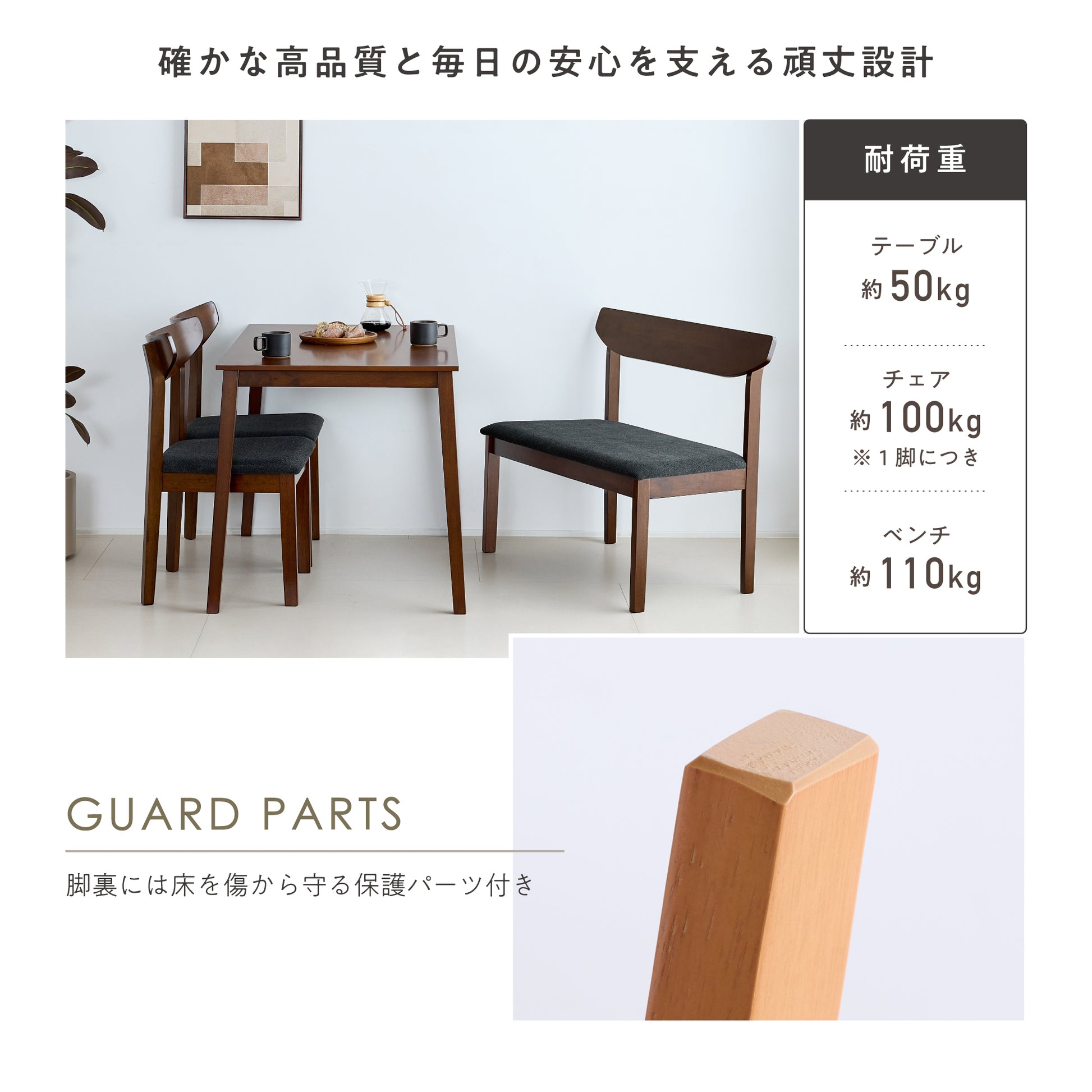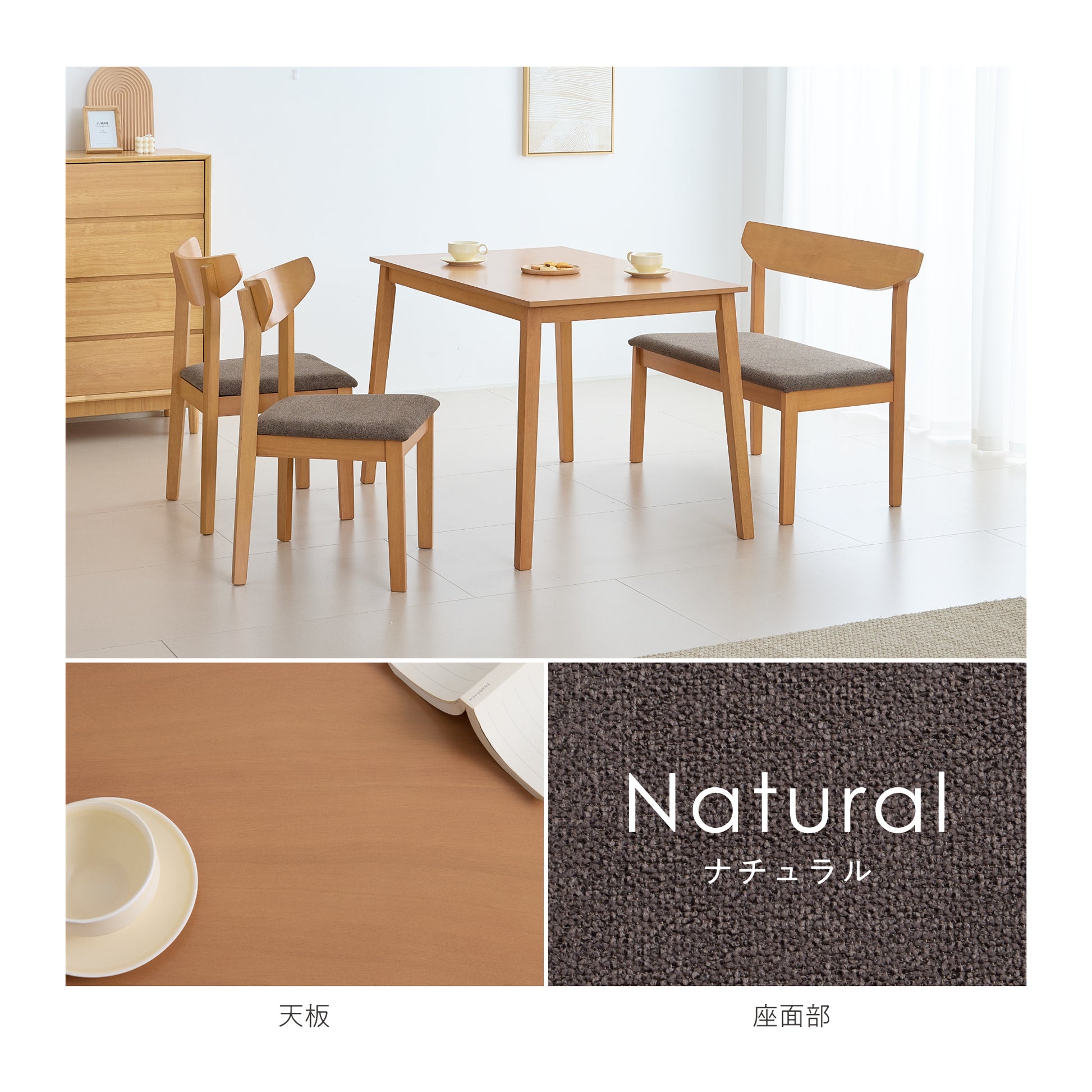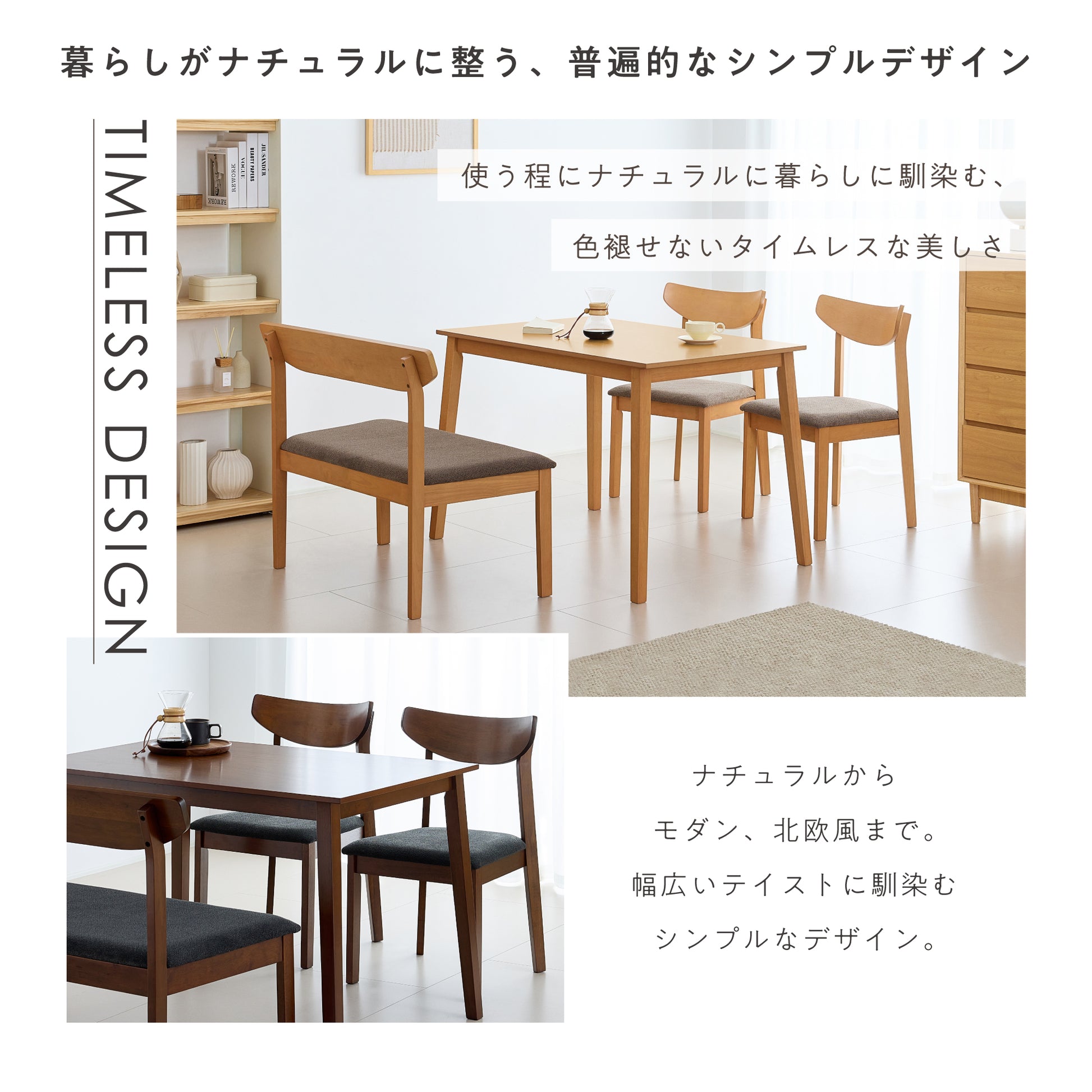 ダイニングセットLuore(ルオレ)は、毎日の食事やくつろぎの時間に自然と馴染む、シンプルで使いやすいダイニングセットです。テーブル・チェア2脚・ベンチの組み合わせで、2人暮らしから来客時まで柔軟に対応。細身の脚部が空間に軽やかさを与え、圧迫感を抑えます。天然木の風合いを活かした天板とラバーウッドのフレームが、ナチュラルで統一感のある印象に。座面にはほどよいクッション性を持たせ、食事の時間も快適に。ナチュラルモダンな空間に心地よく溶け込むダイニングセットです。