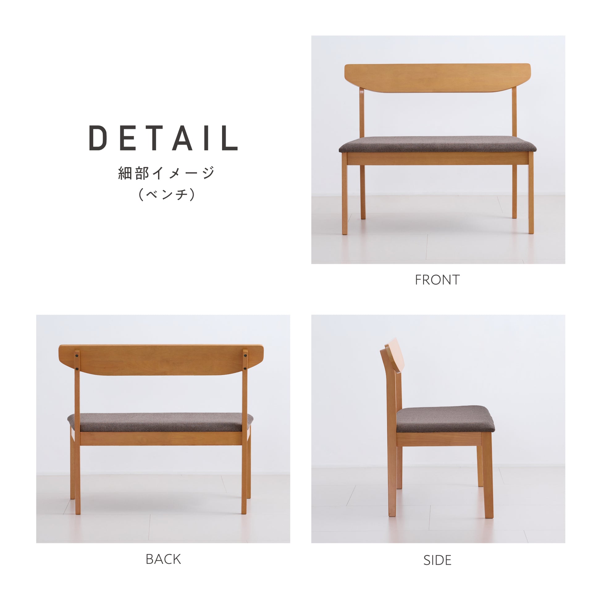 背もたれ付きのベンチは、ゆったりと体を預けられる安心感が魅力。幅104.5cmで大人2人が並んで座りやすく、食事後のくつろぎ時間にも心地よく寄り添います。ほどよいクッション性で、長時間でも疲れにくい設計です。