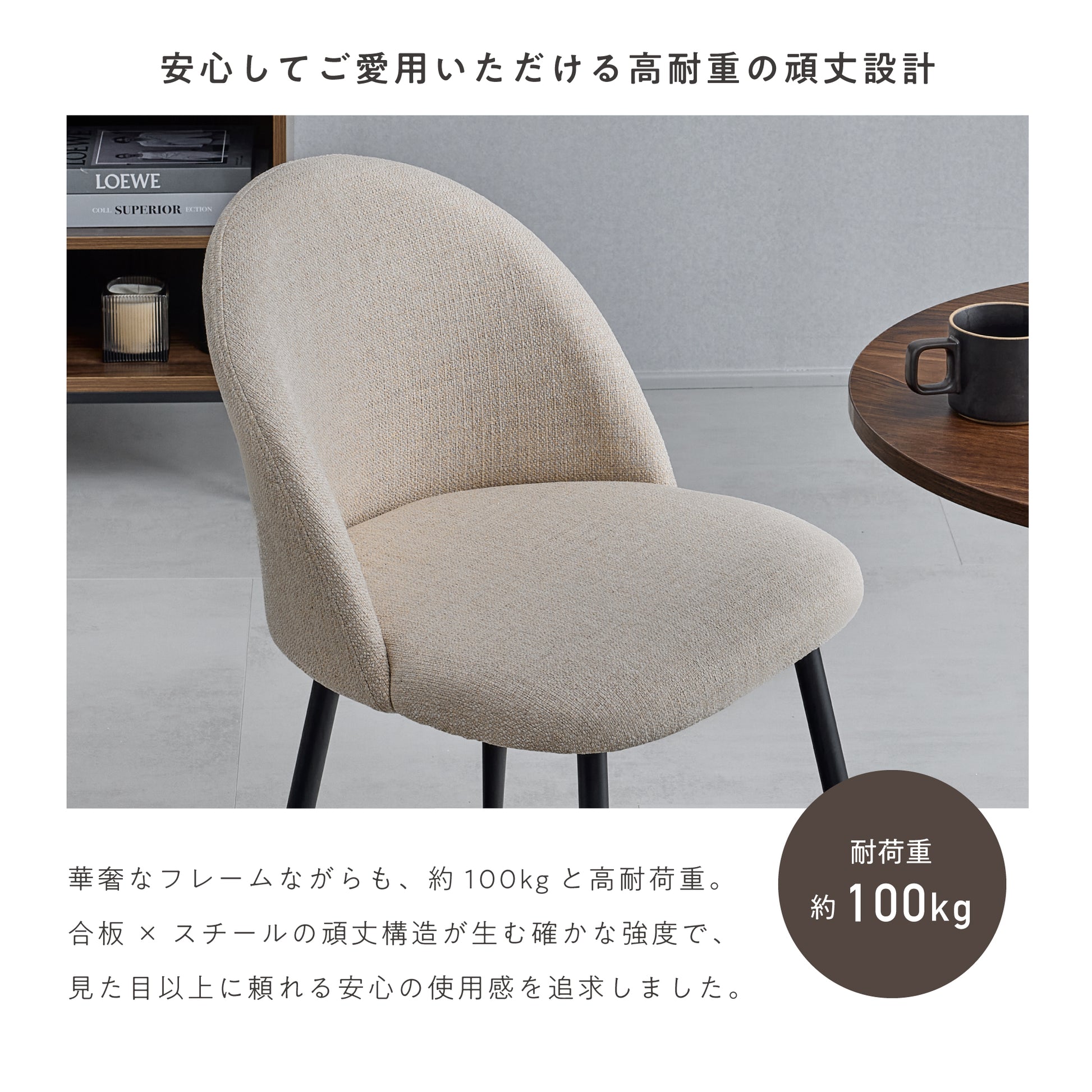 華奢に見えるフレームながら、耐荷重は約100kg。合板×スチール構造が生む確かな強度で、毎日の使用でも安心してお使いいただけます。機能性にも妥協せず、座り心地とデザイン性の両面から長く愛せる品質に。見た目以上に頼れるつくりで、快適なダイニング時間を支えます。