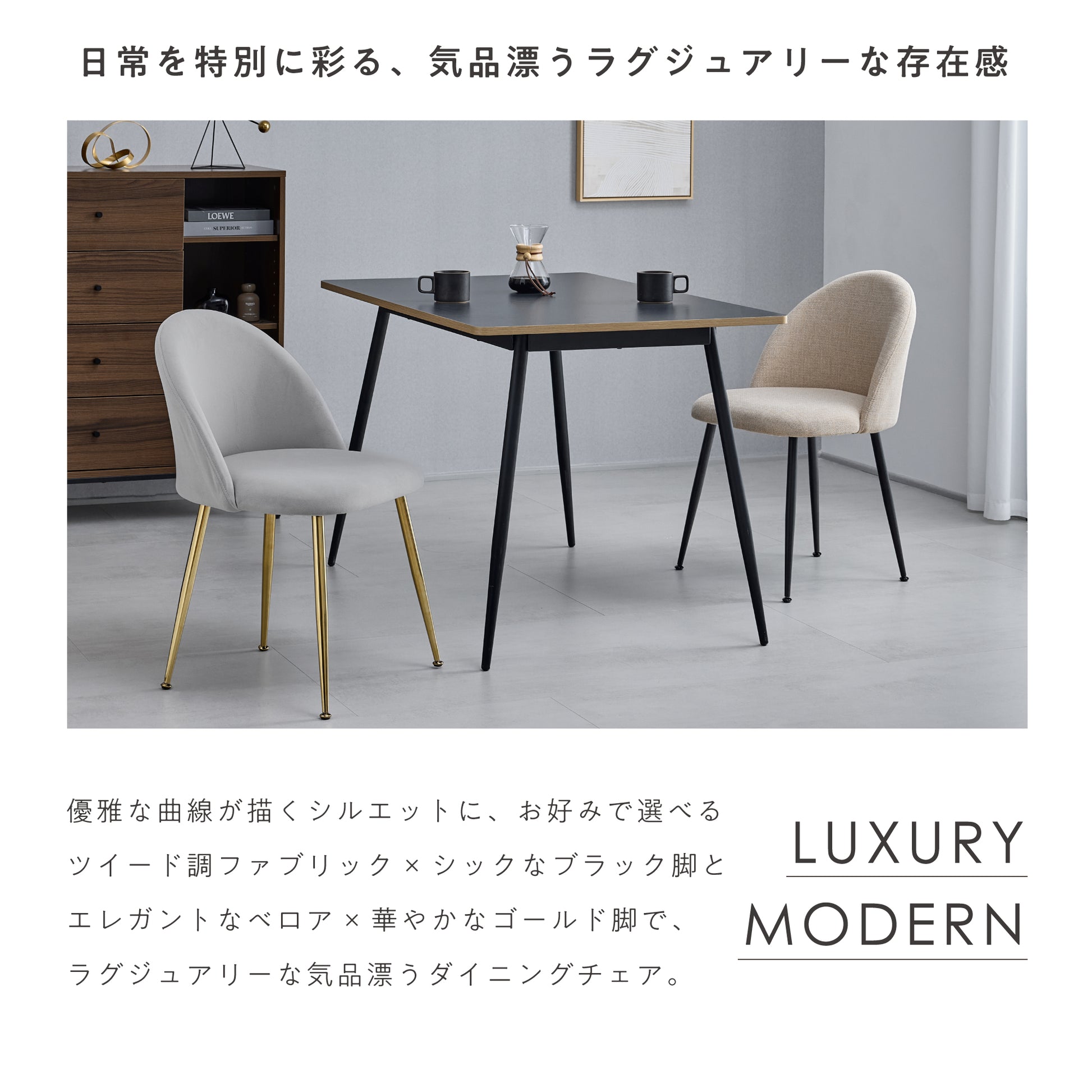 優雅な曲線が描くシルエットで、お部屋に上品な気品を纏わせるダイニングチェア。艶めくベロア×ゴールド脚は華やかに、表情豊かな織り目のツイード調のファブリック×ブラック脚は、落ち着きあるエレガンスを演出。素材が持つ美しさを引き立てながら、暮らしにラグジュアリーなムードをもたらします。