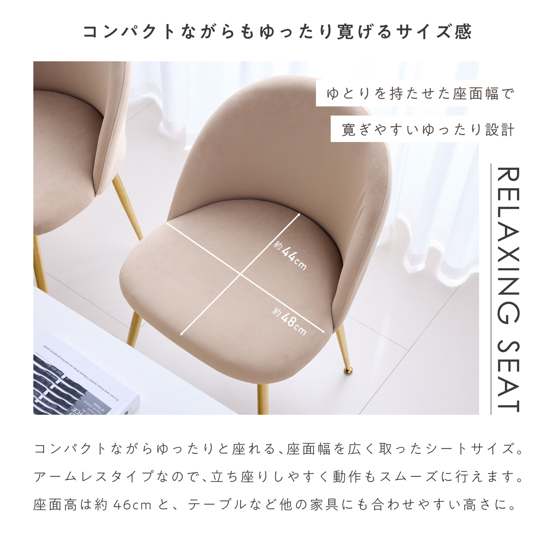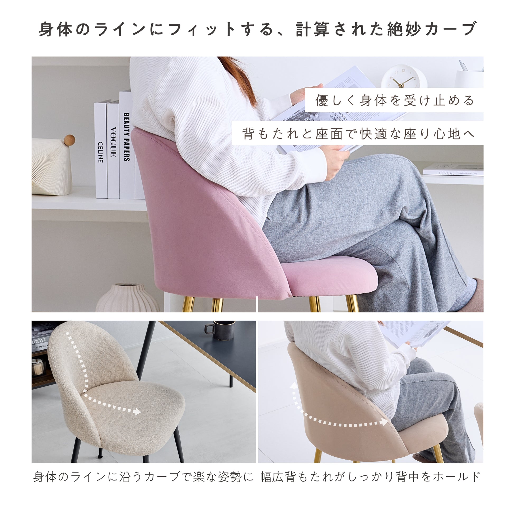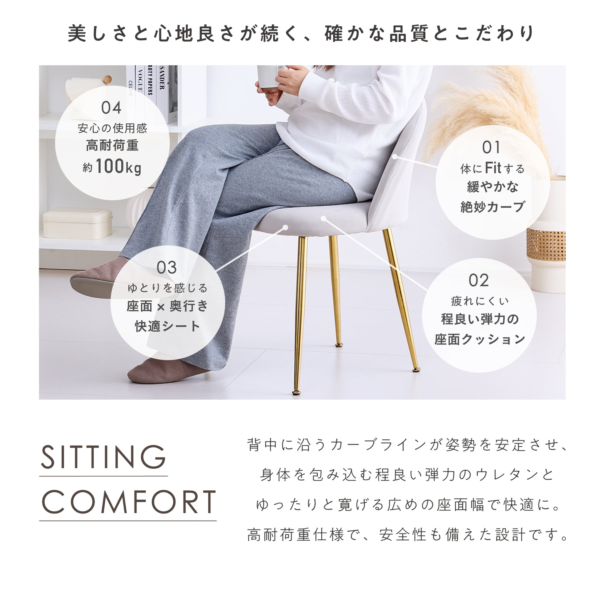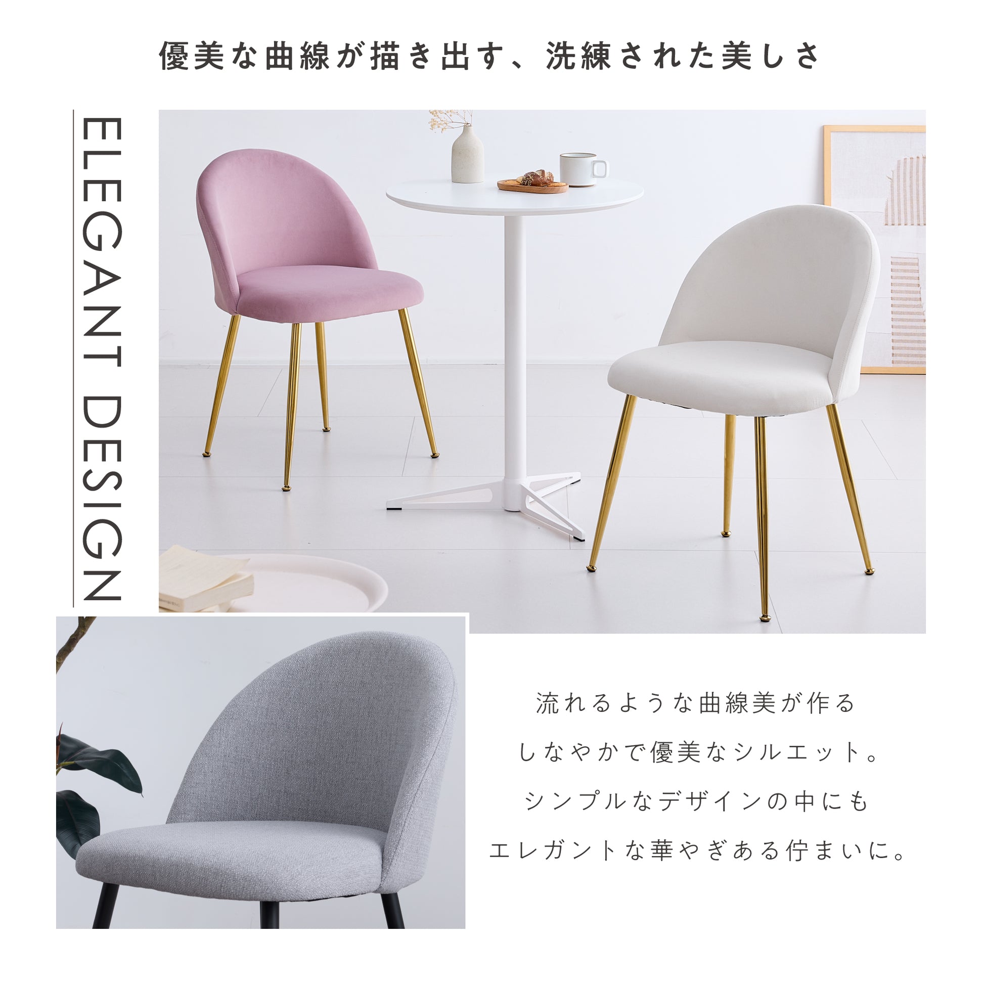 光を受けて美しく陰影を生む上質なベロアと、華やかさを添えるゴールド脚の組み合わせが、空間に奥行きとエレガントな印象をもたらします。それぞれ異なる魅力を持つ4色展開のニュアンスカラーが、ダイニングを大人かわいく上品に演出します。