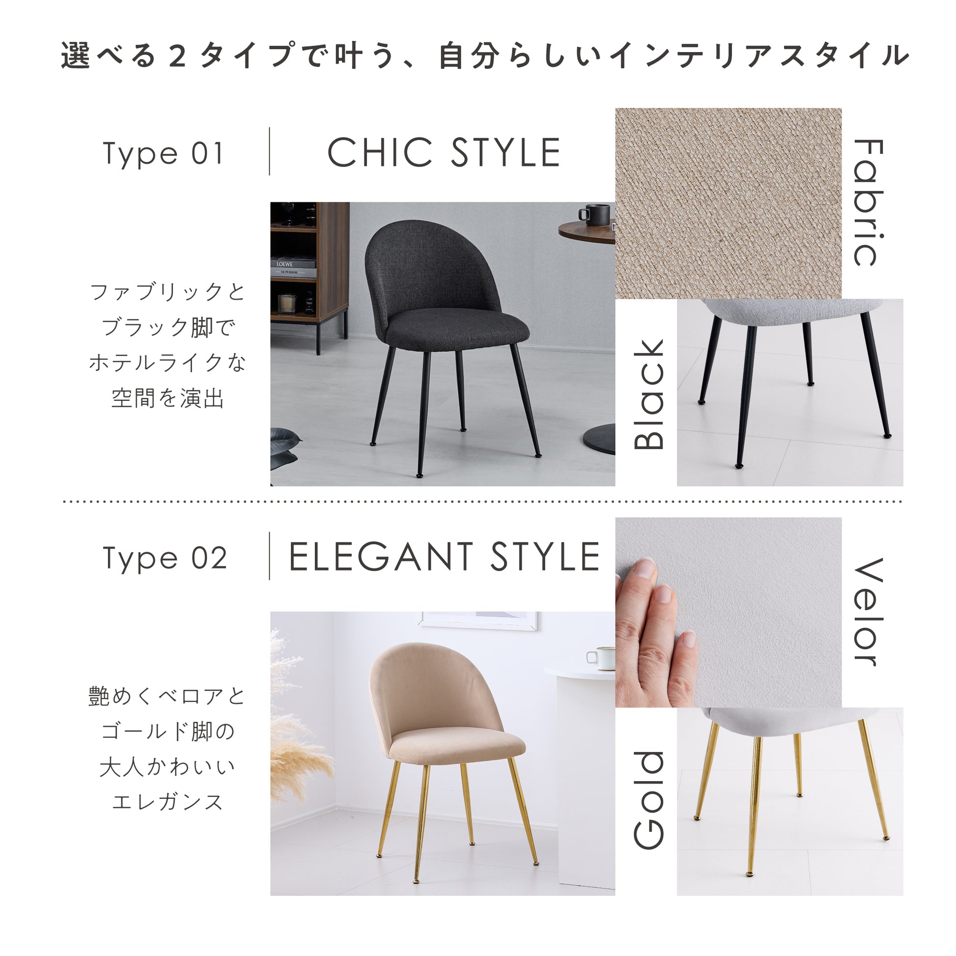 ダイニングチェアPocarは、ラグジュアリー感あるベロア×ゴールド脚タイプと、シックな印象のファブリック×ブラック脚タイプの2タイプの組み合わせをご用意。お部屋のインテリアやライフスタイルに合わせてお好みでお選びいただけます。