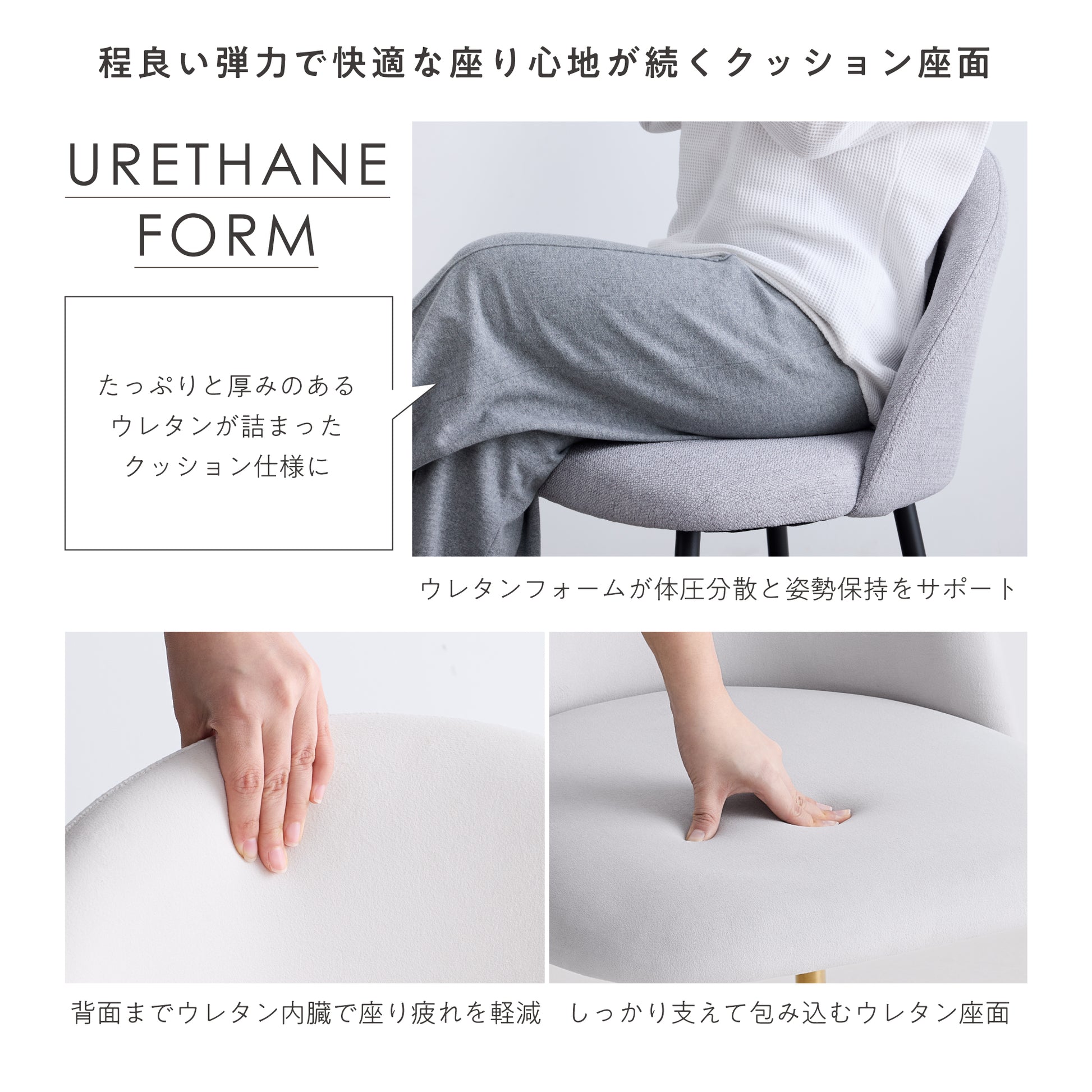 背中に沿ってフィットするカーブラインが姿勢を安定させ、ウレタンフォームの程よい弾力が、長時間の使用でも快適さをキープ。座面幅48×座面奥行44cmの使いやすいサイズ設計で、立ち座りもスムーズ。華奢に見えて、耐荷重約100kgの頼もしさも備えています。日常で感じる小さなストレスを取り除き、安心して使える信頼のディテールを宿したチェアです。