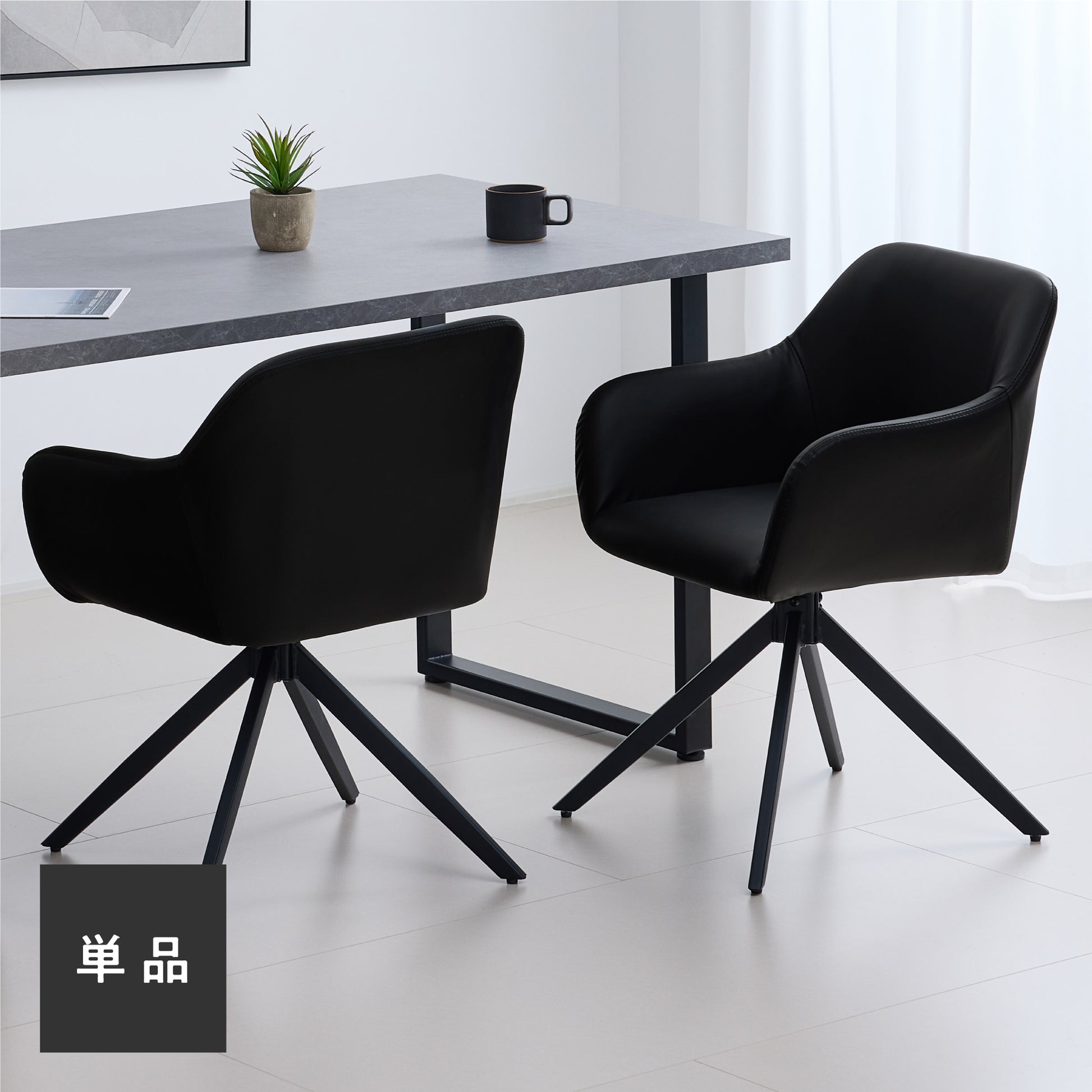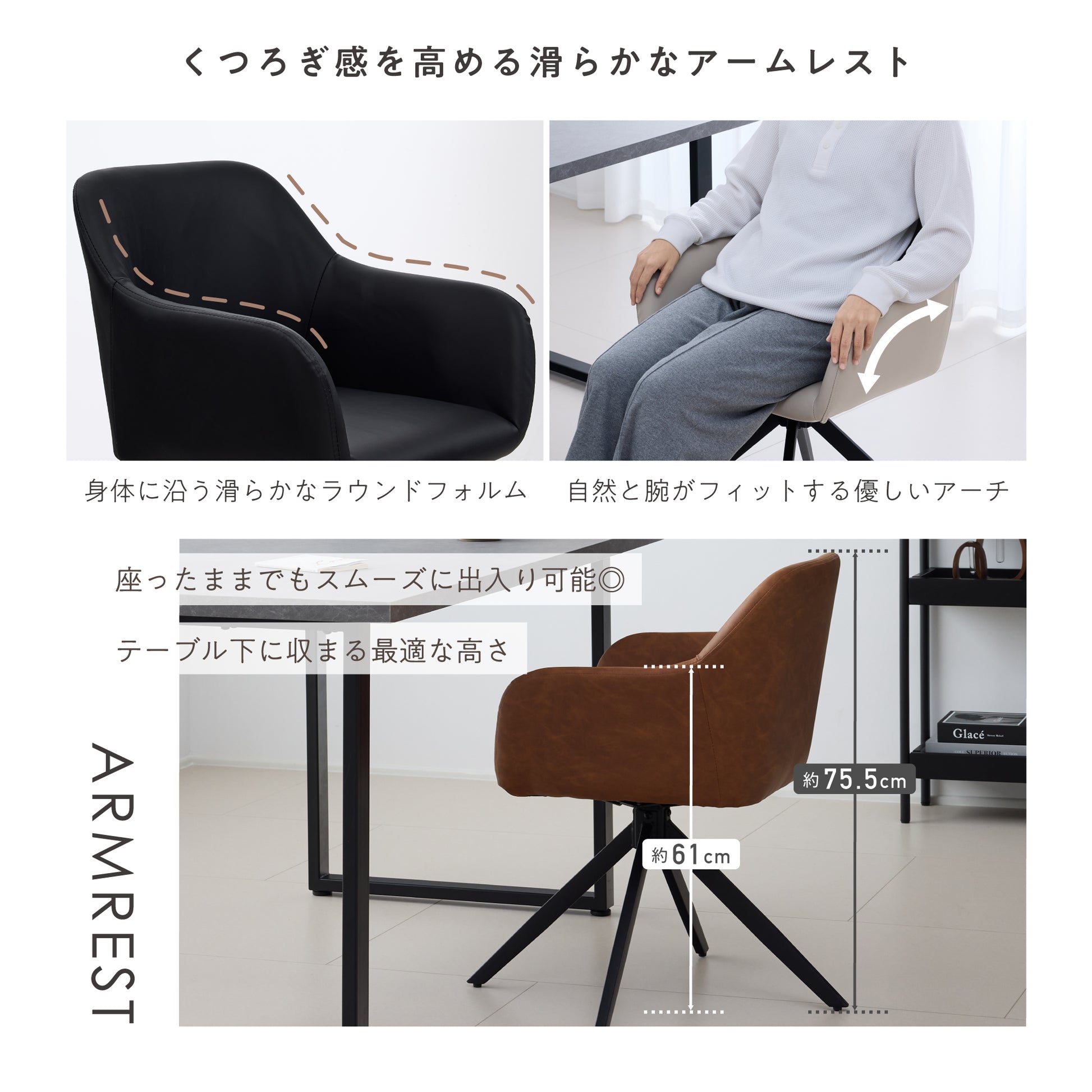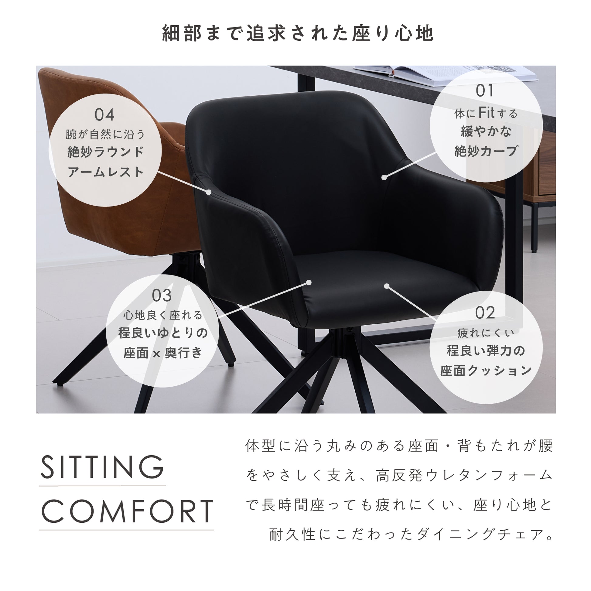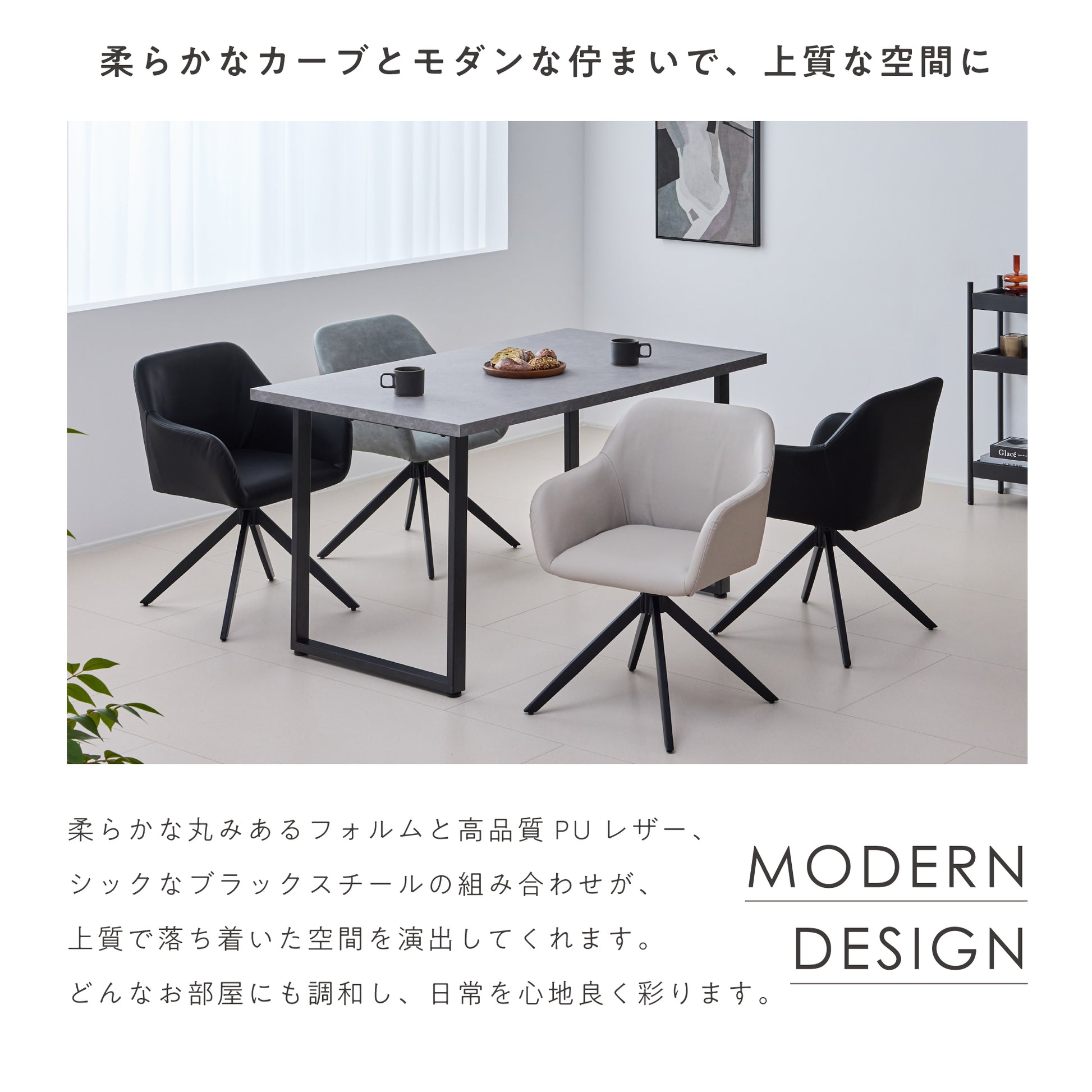 滑らかなPUレザーの座面と安定感のあるブラックスチールフレームで、座る時間も快適なダイニングチェア。回転式座面により、立ち座りや向きの調整が楽にできます。柔らかな曲線のシルエットと身体にフィットする座面・背もたれ、滑らかなアームレストにより、長時間座っても疲れにくい設計に。座面はゆったり、でも空間に重さを感じさせないデザインで、ダイニングを上品に整えます。