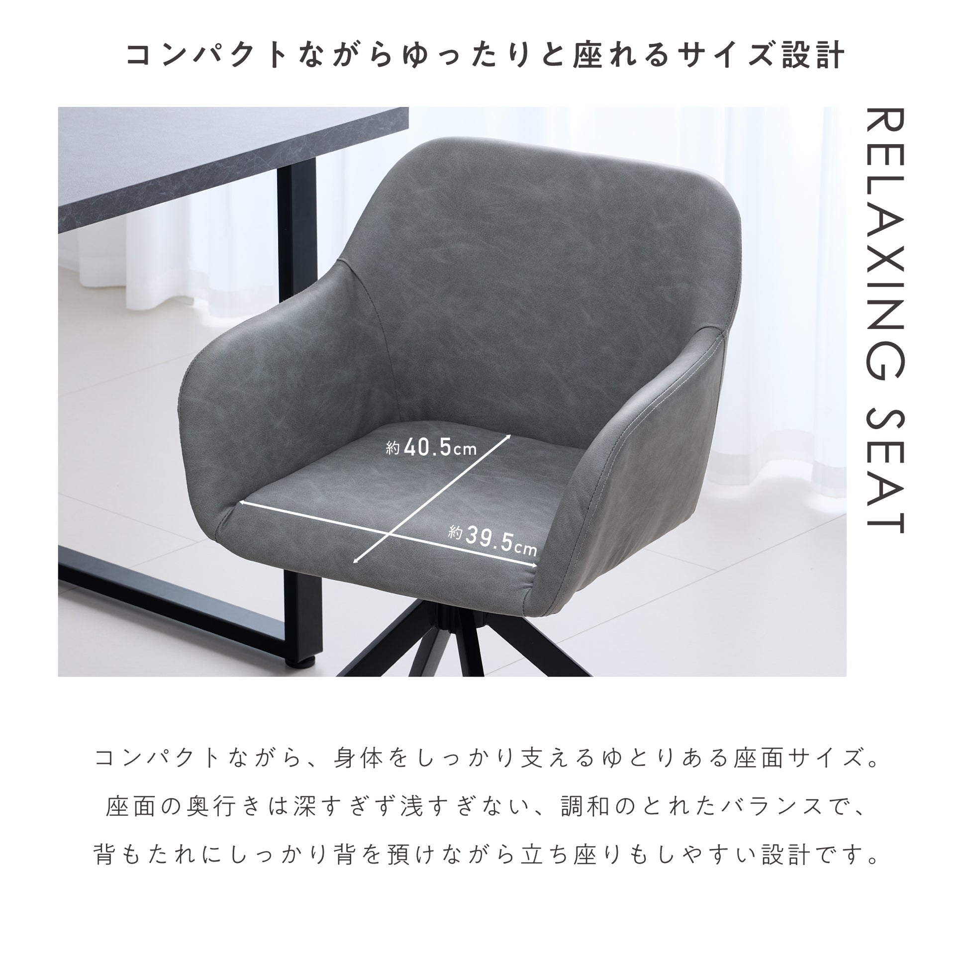 コンパクトながらも、身体をしっかり支えるゆったりサイズ。座面の奥行きは深すぎず浅すぎない調和のとれたバランスで、背もたれにしっかり背を預けながら立ち座りもしやすい設計に。食事時間はもちろん、読書や在宅ワークなど、幅広い用途で快適に使える人間工学に基づいたチェアです。