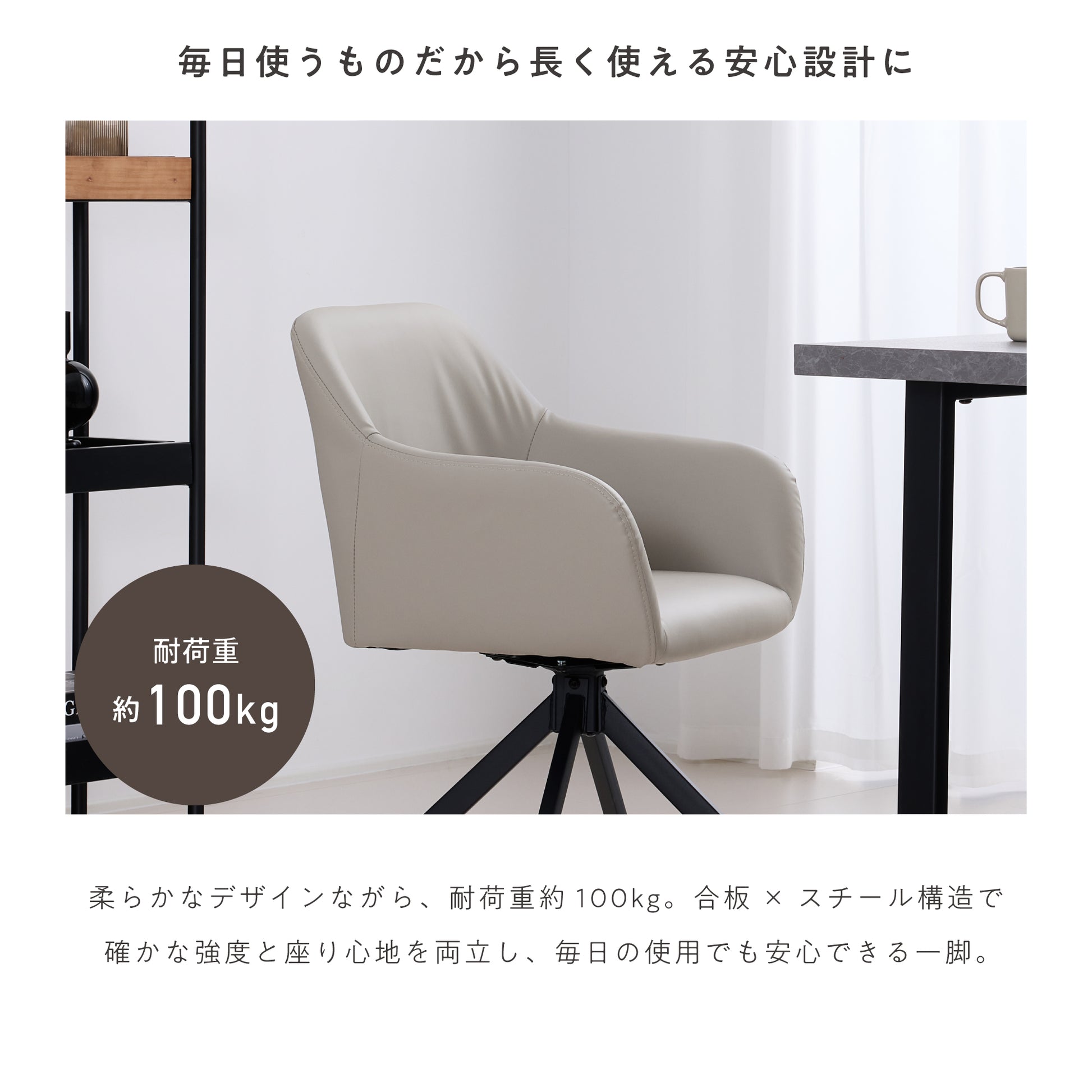 柔らかなデザインながら、耐荷重は約100kg。合板×スチール構造が生む確かな強度で、毎日の使用でも安心してお使いいただけます。機能性にも妥協せず、座り心地とデザイン性の両面から長く愛せる品質に。見た目以上に頼れるつくりで、快適なダイニング時間を支えます。