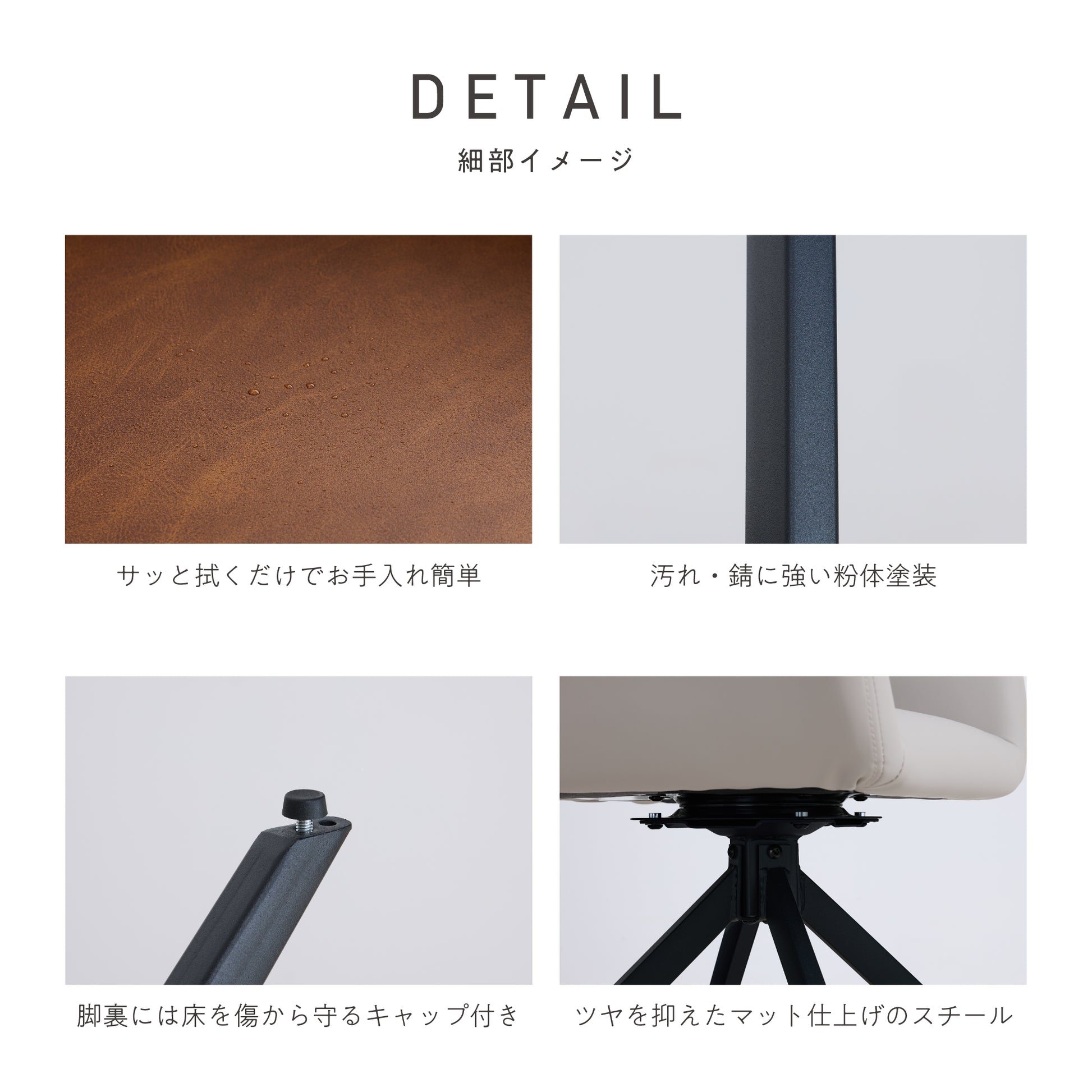 脚部には空間を引き締めてくれるブラックスチールを採用。重厚感のある質感ながら洗練された印象で、モダンインテリアにも調和します。PUレザーの質感がもたらす柔らかさとの対比で、空間にメリハリを演出。大人っぽいデザインのため、インテリアのアクセントとしても活躍します。