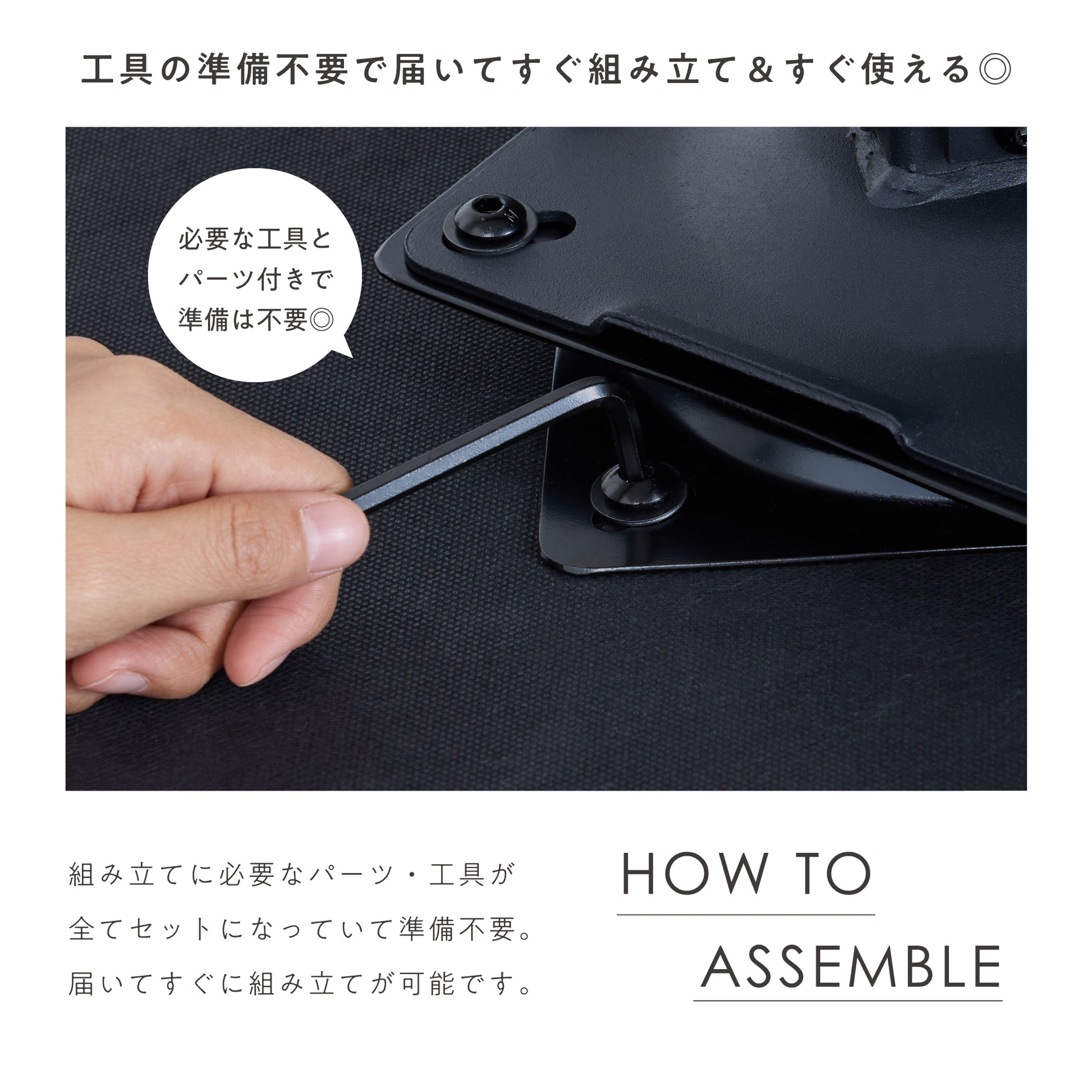 組み立てに必要なパーツ・工具は全てセットになっているので、お客様ご自身での工具の準備は必要ありません。届いてすぐに組み立てていただくことができます。