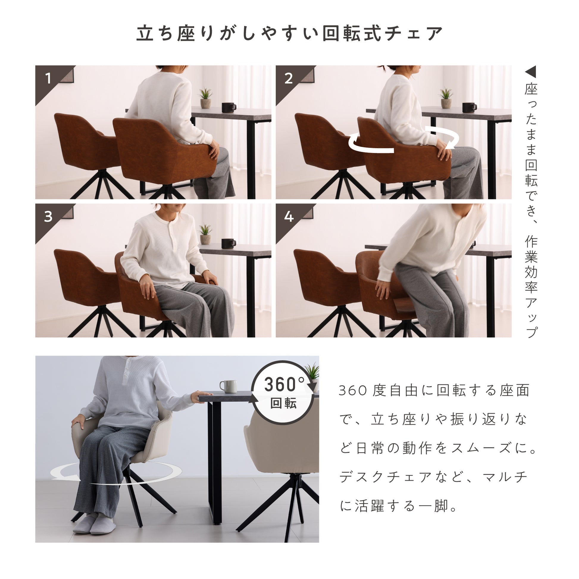 360度自由に向きを変えられる回転式座面で、立ち座りや振り返りなど日常の動作をスムーズにサポート。テーブル周りで椅子を引いたり押したりする必要がなく、床を傷つけません。デスクチェアとしても使えるなど、あらゆる場面でマルチに活躍します。