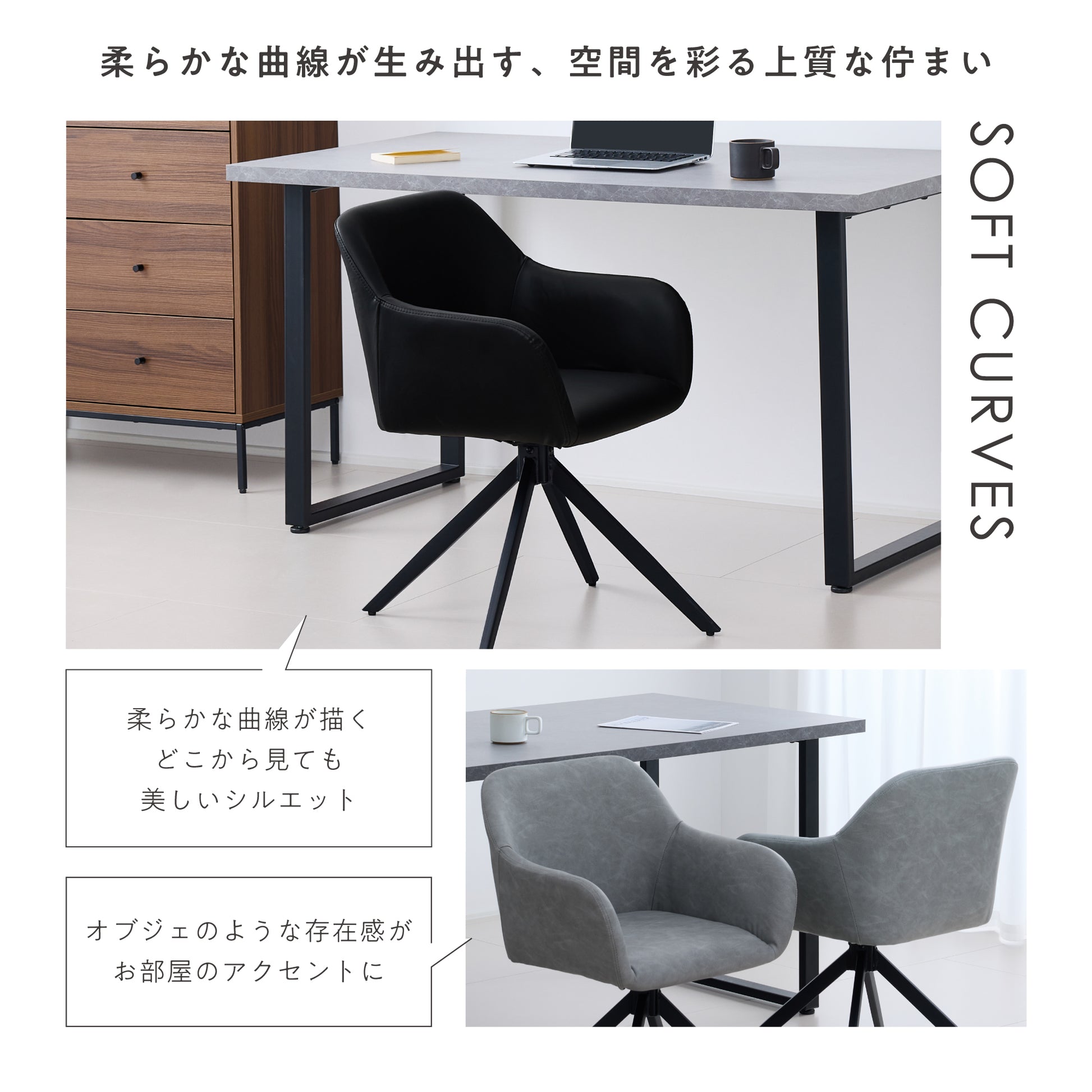 背もたれから座面、アームレストまで滑らかに繋がる、柔らかな丸みのあるラインと洗練されたモダンデザインが印象的なチェア。高品質PUレザーはヴィンテージ調とモダン調の2タイプを用意し、滑らかな手触りと上品な光沢で日常使いにぴったり。脚部のブラックスチールが空間を引き締め、全体のフォルムにメリハリを生み出します。幅広いインテリアに調和し、毎日の生活を快適で美しい時間にしてくれます。