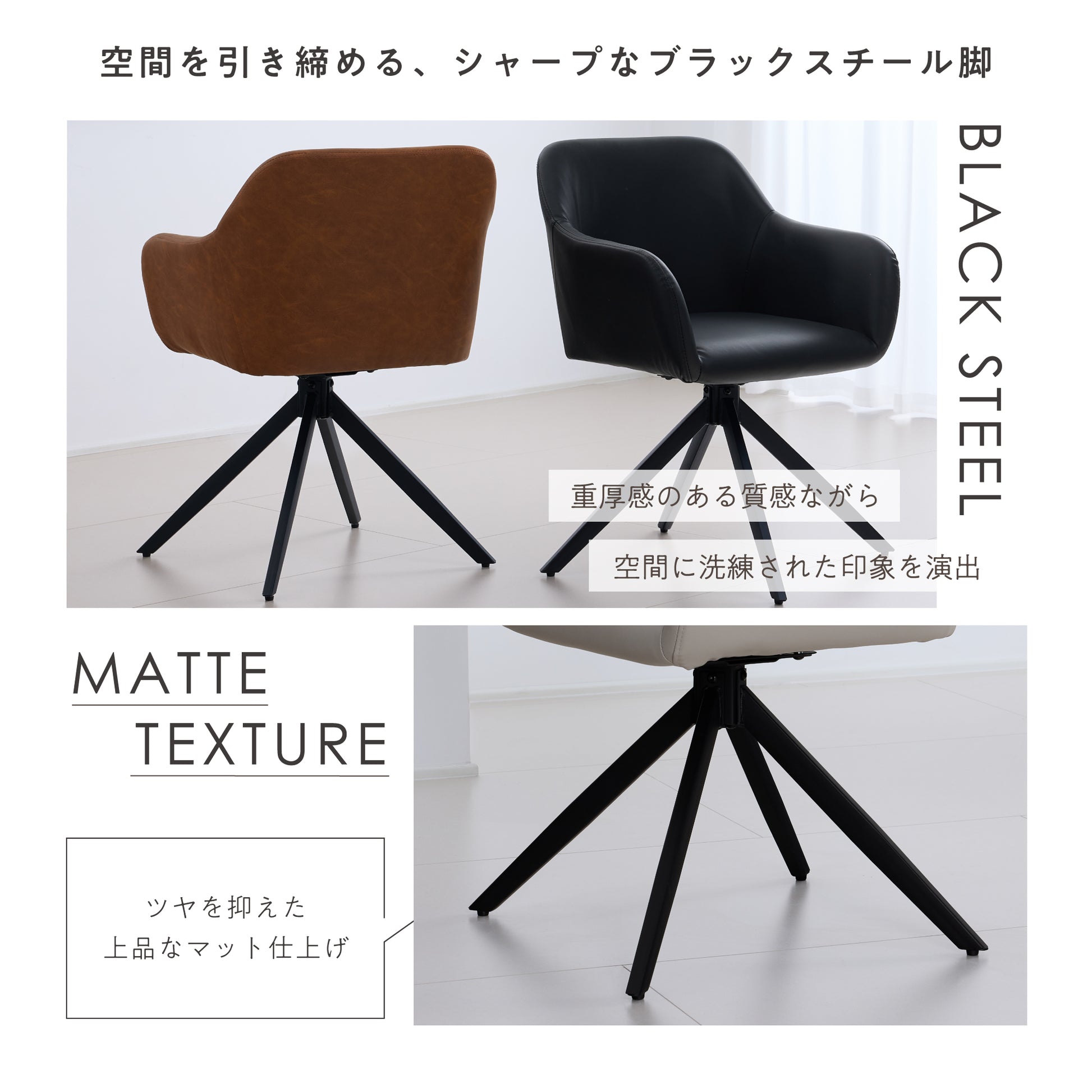 Design/03 | 空間を引き締める、シャープなブラックスチール脚