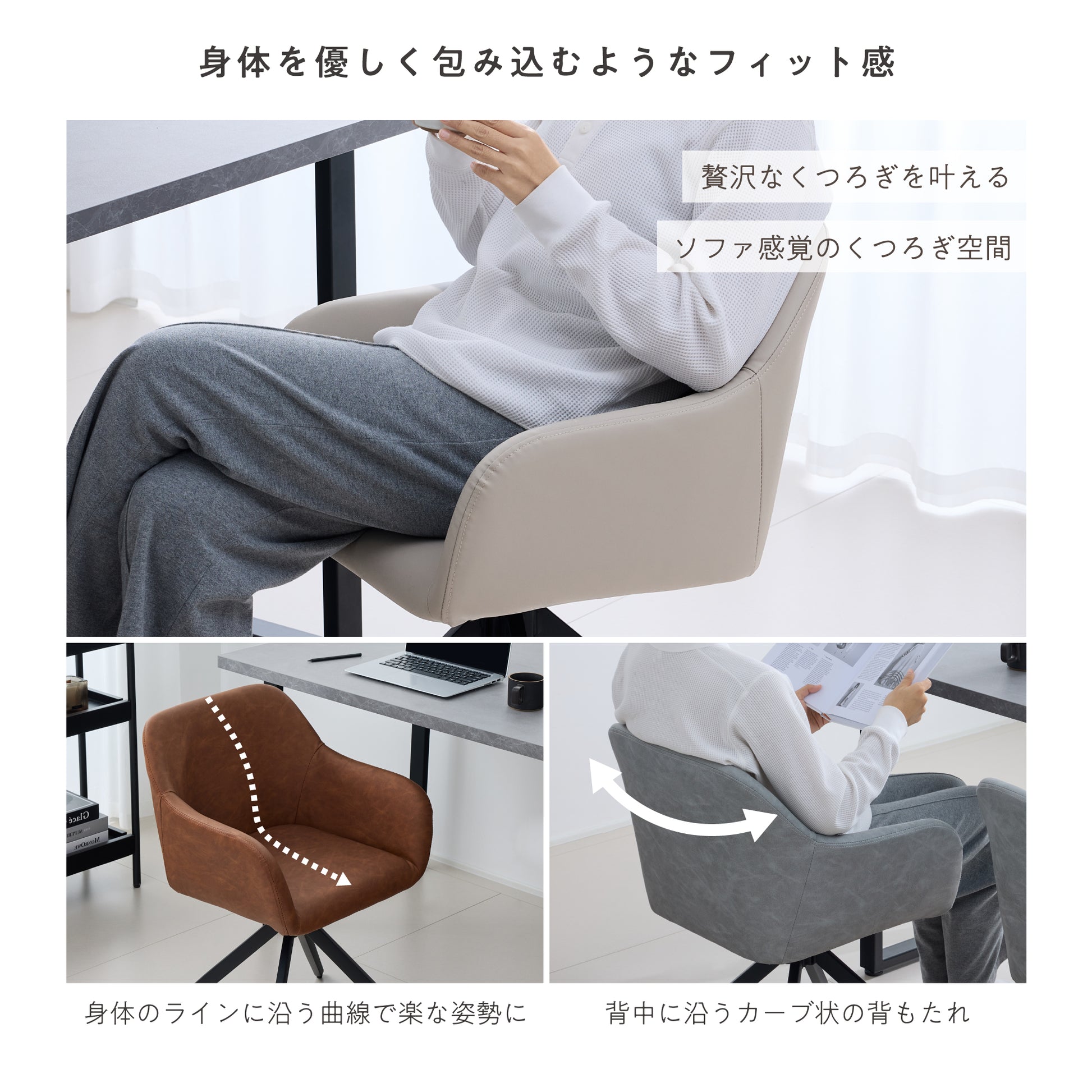 背もたれとアームレストを身体に添う曲線で繋げたラウンドフォルム
