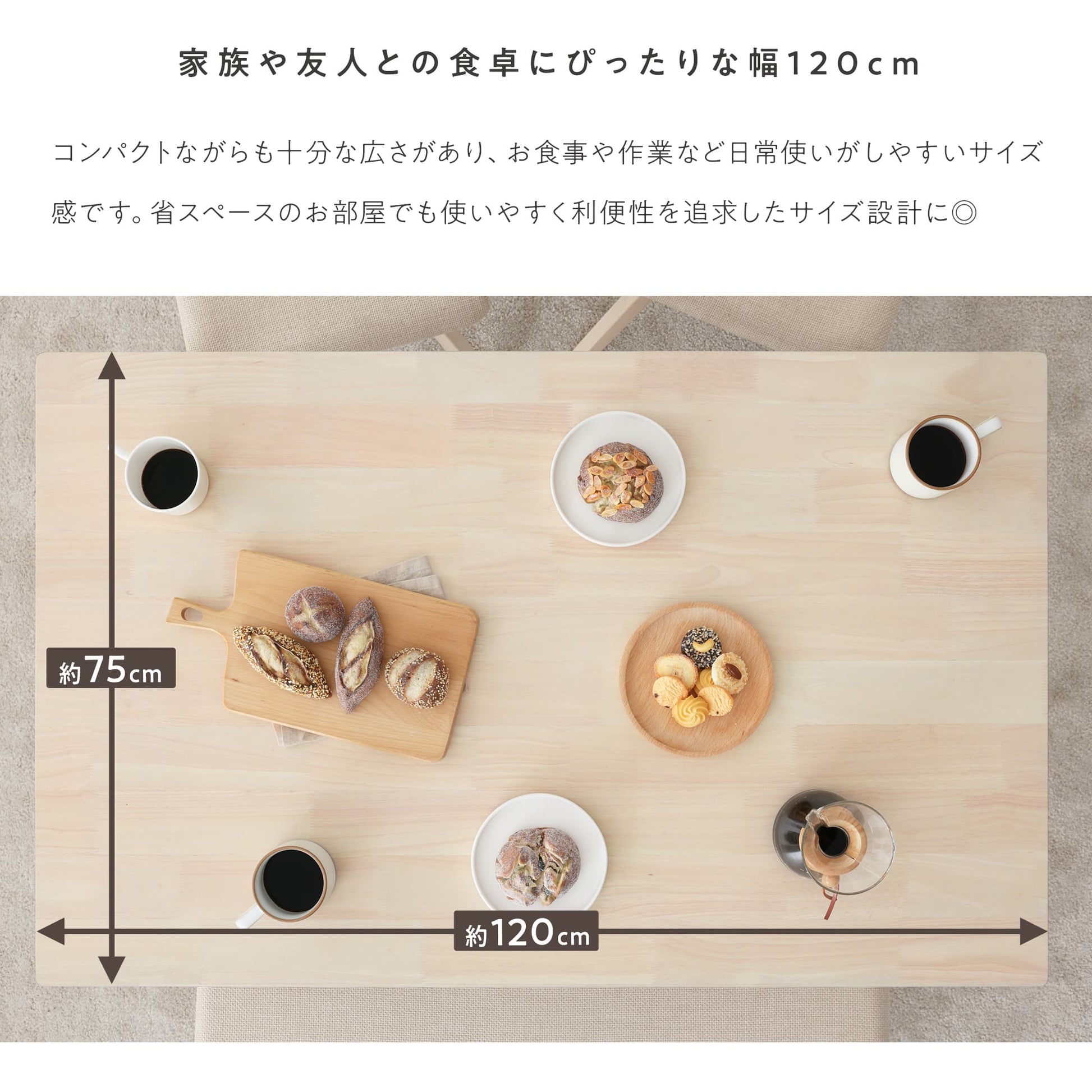 幅120cmの4人掛けサイズは、家族や友人との食卓にぴったり。コンパクトながらも十分な広さがあり、お食事や作業など日常使いがしやすいサイズ感です。省スペースのお部屋でも使いやすく利便性を追求したサイズ設計に◎