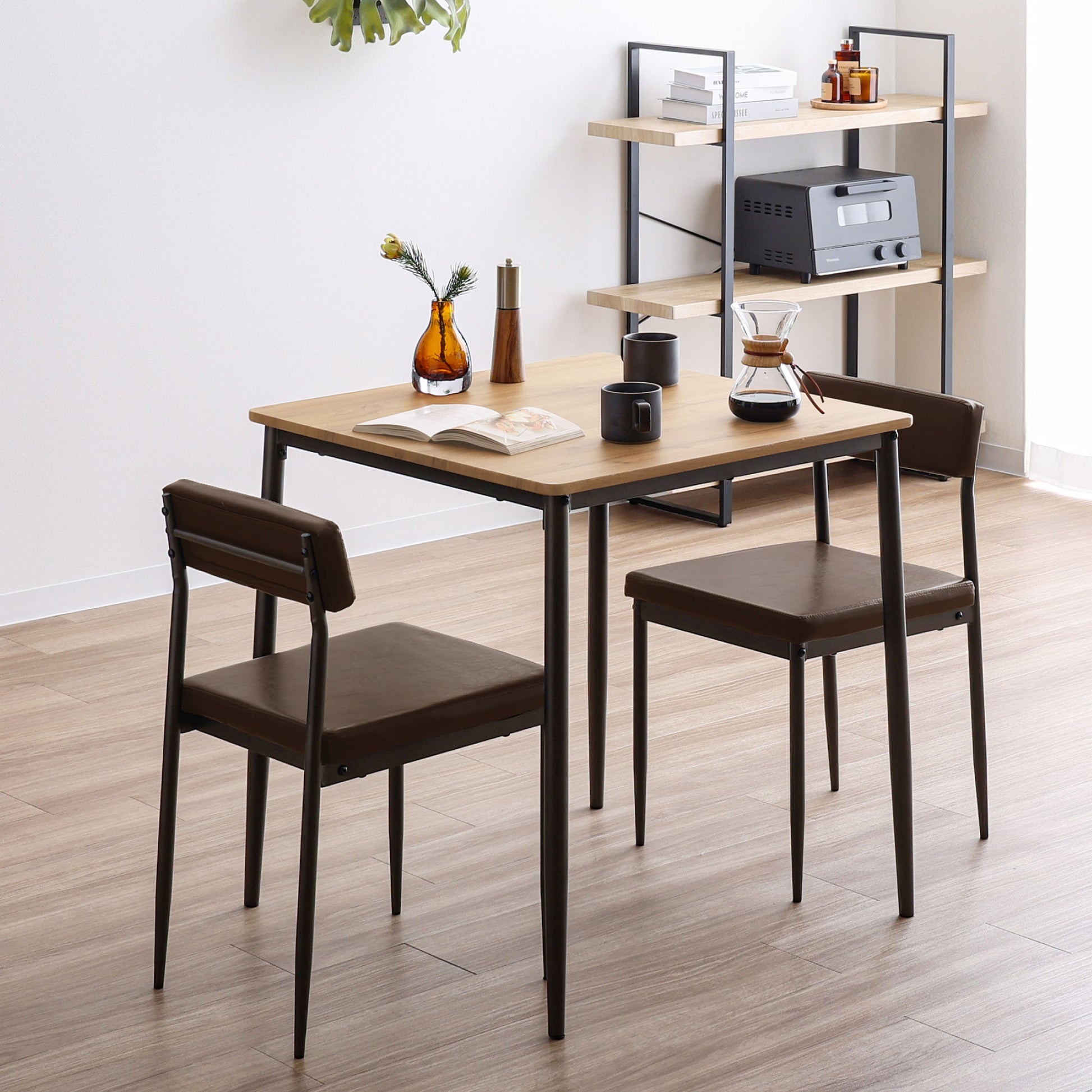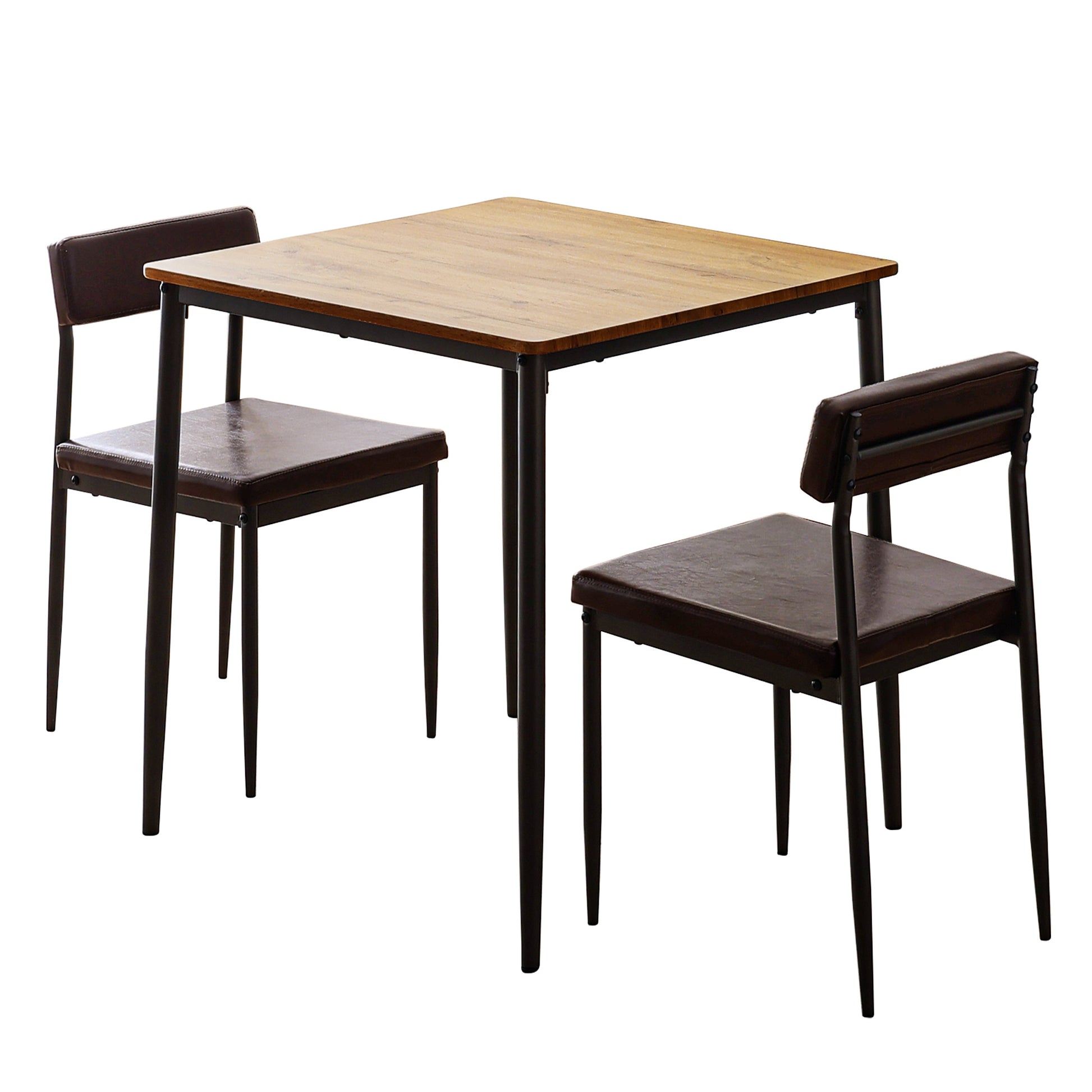 【すらりと真っ直ぐに伸びるスチール素材の脚部のスタイリッシュさ】×【天然木のような優しさを感じる木目調の天板】×【ヴィンテージ感溢れるレザー調のクッション】の3つが組み合わさった洗練されたシンプルなデザインが、毎日の暮らしを引き立てるカフェ風のダイニング。幅と奥行き約70cmのコンパクトなサイズ感でお部屋のスペースを取らずにダイニングテーブルの設置をしたい方におすすめ。座り心地の良い座面クッション付きのチェア2脚、木目模様が美しいテーブルの3点セット。