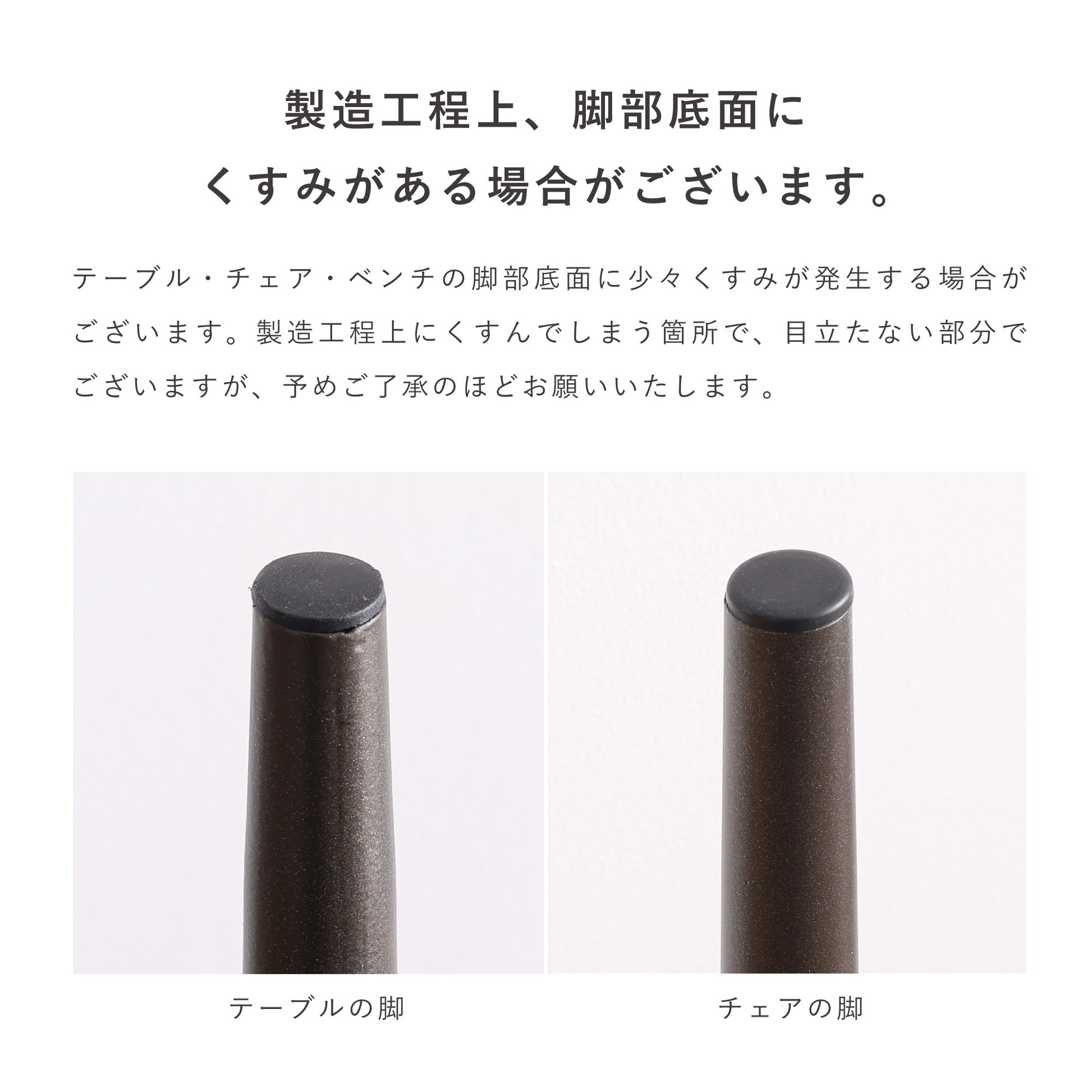 テーブル・チェア・ベンチの脚部底面に少々くすみが発生する場合がございます。製造工程上にくすんでしまう箇所で、目立たない部分でございますが、予めご了承のほどお願いいたします。