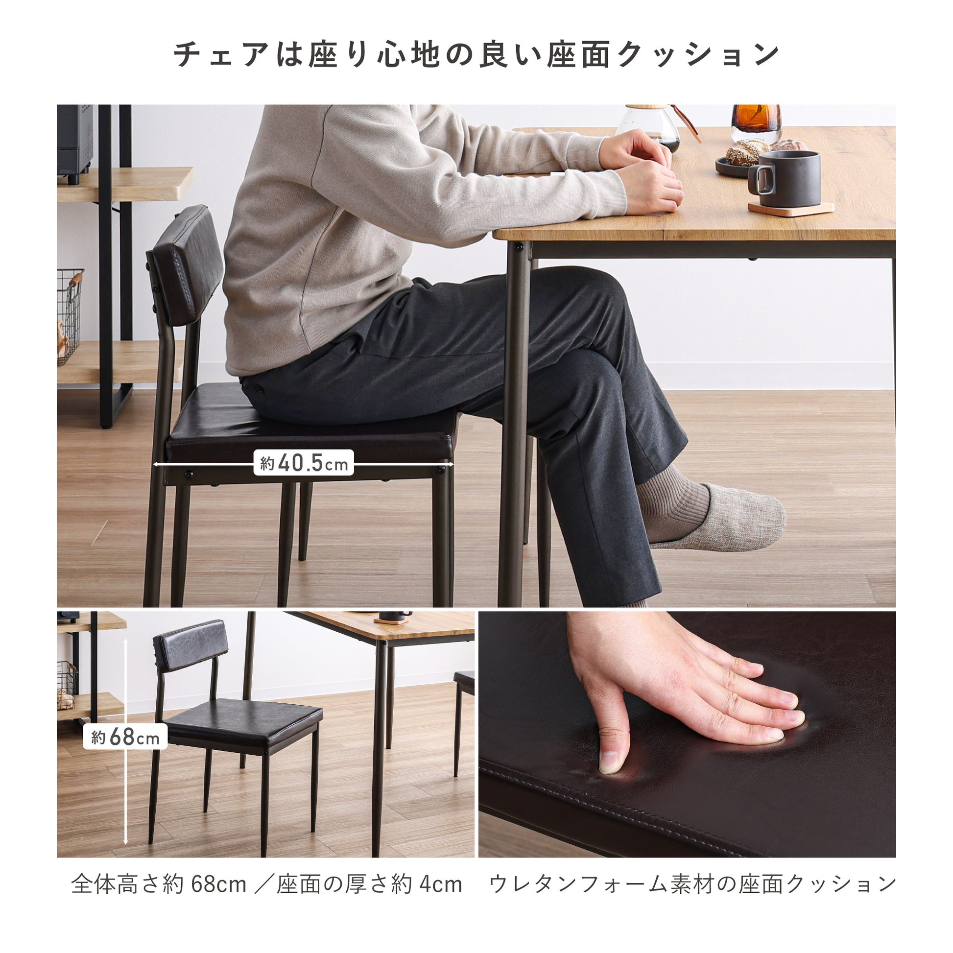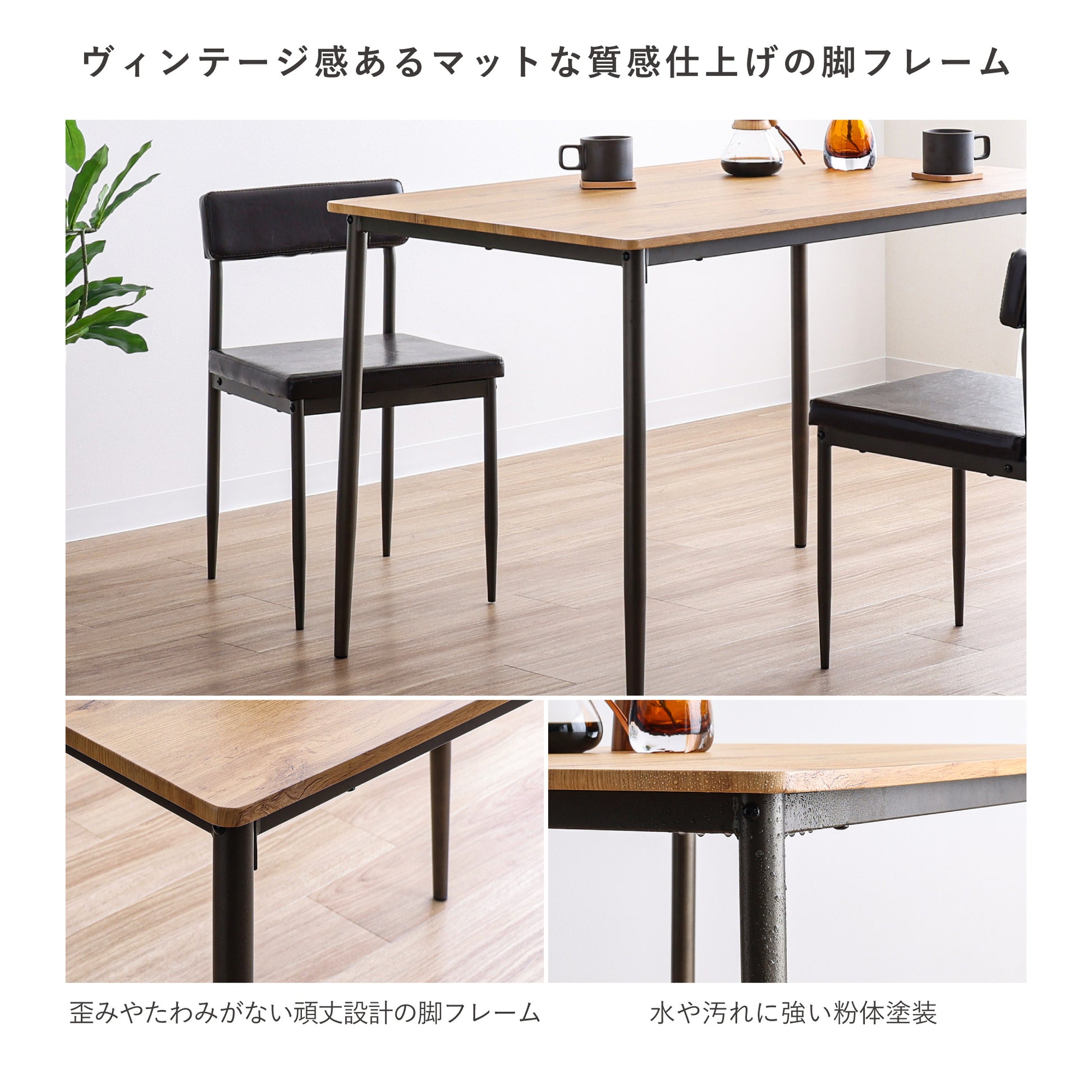 【すらりと真っ直ぐに伸びるスチール素材の脚部のスタイリッシュさ】×【天然木のような優しさを感じる木目調の天板】×【ヴィンテージ感溢れるレザー調のクッション】の3つが組み合わさった洗練されたシンプルなデザインが、毎日の暮らしを引き立てるカフェ風のダイニング。