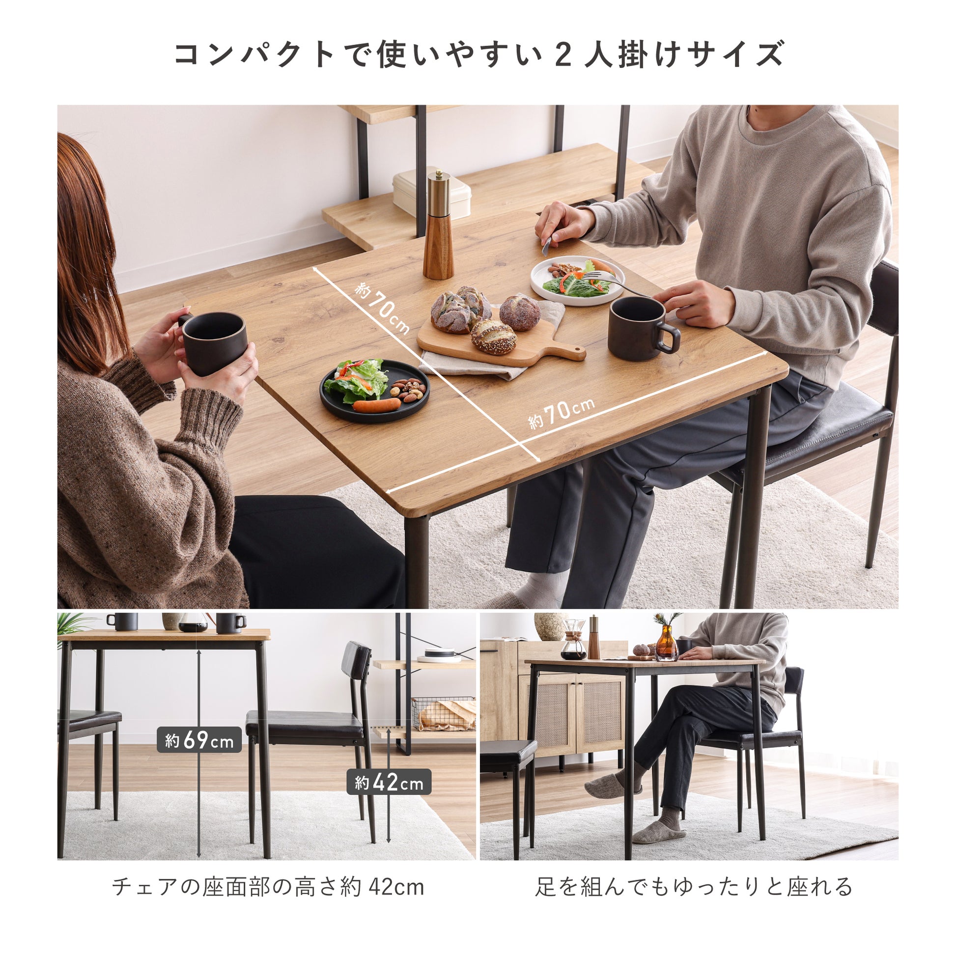 幅約70×奥行き約70cmの天板でダイニングテーブルとしてはもちろん、デスクワーク用のデスクとしてお使いいただけます。PC作業や読書などコンパクトサイズでお部屋の省スペースに配置できます。