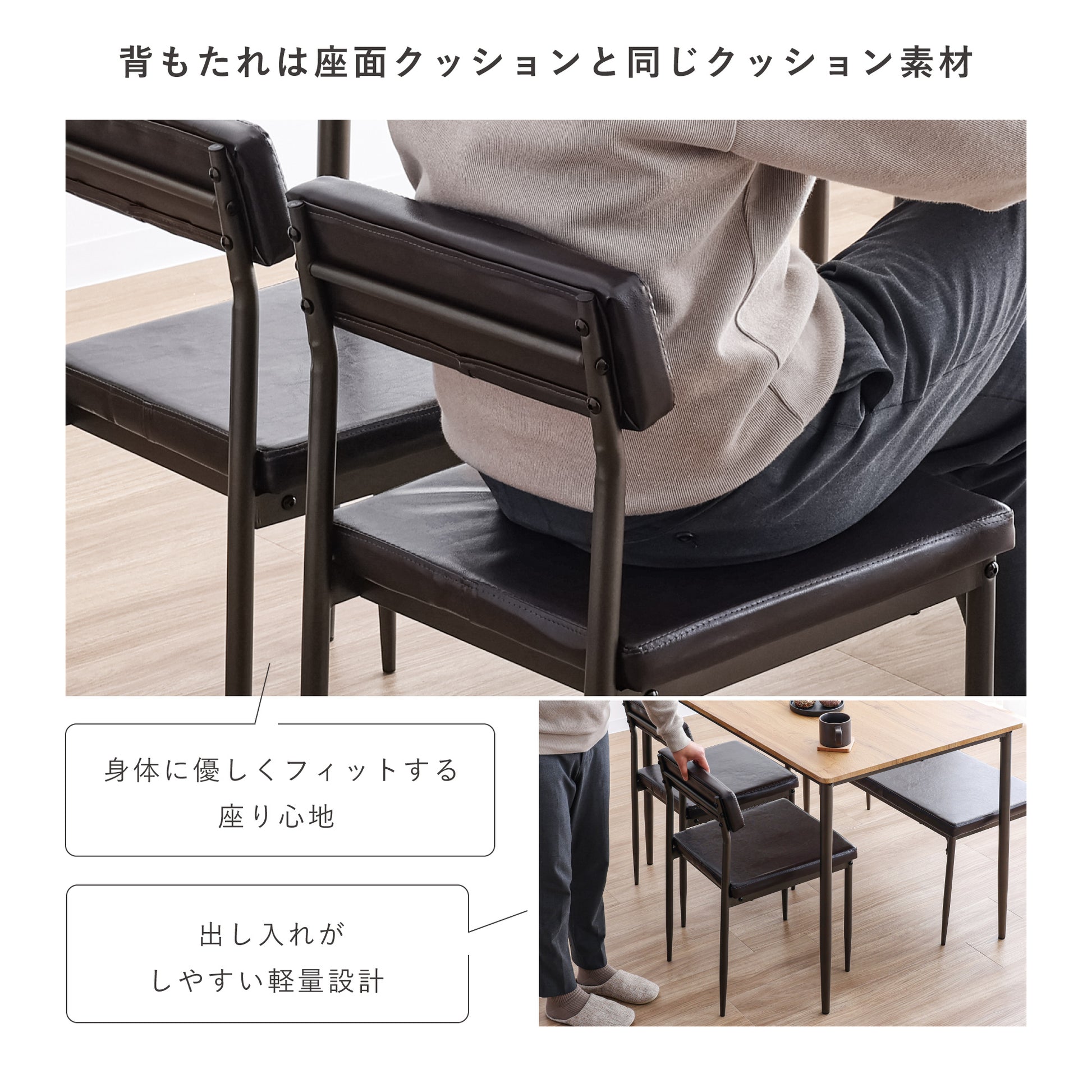 座面部は厚みのあるクッション付きでふんわりと柔らかな座り心地のチェア。座面部は約45.5cmで深く腰掛けられる奥行きでゆったりと座れます。背もたれは座面クッションと同じクッションを使用しており、身体に優しくフィットする座り心地。レザー調のクッション部は汚れても拭き取りができるのでお手入れが簡単。