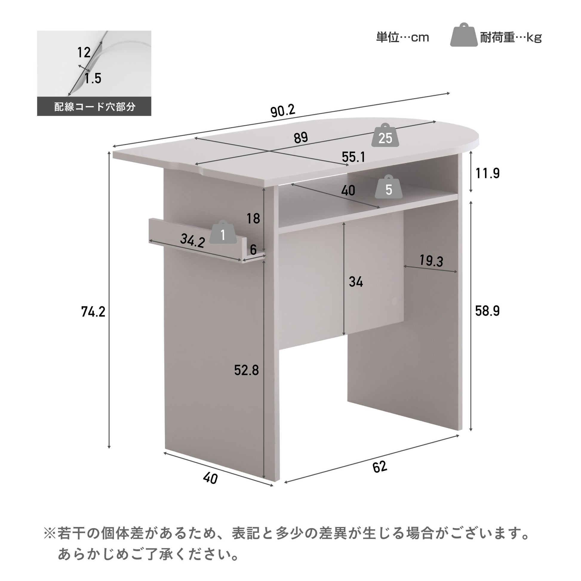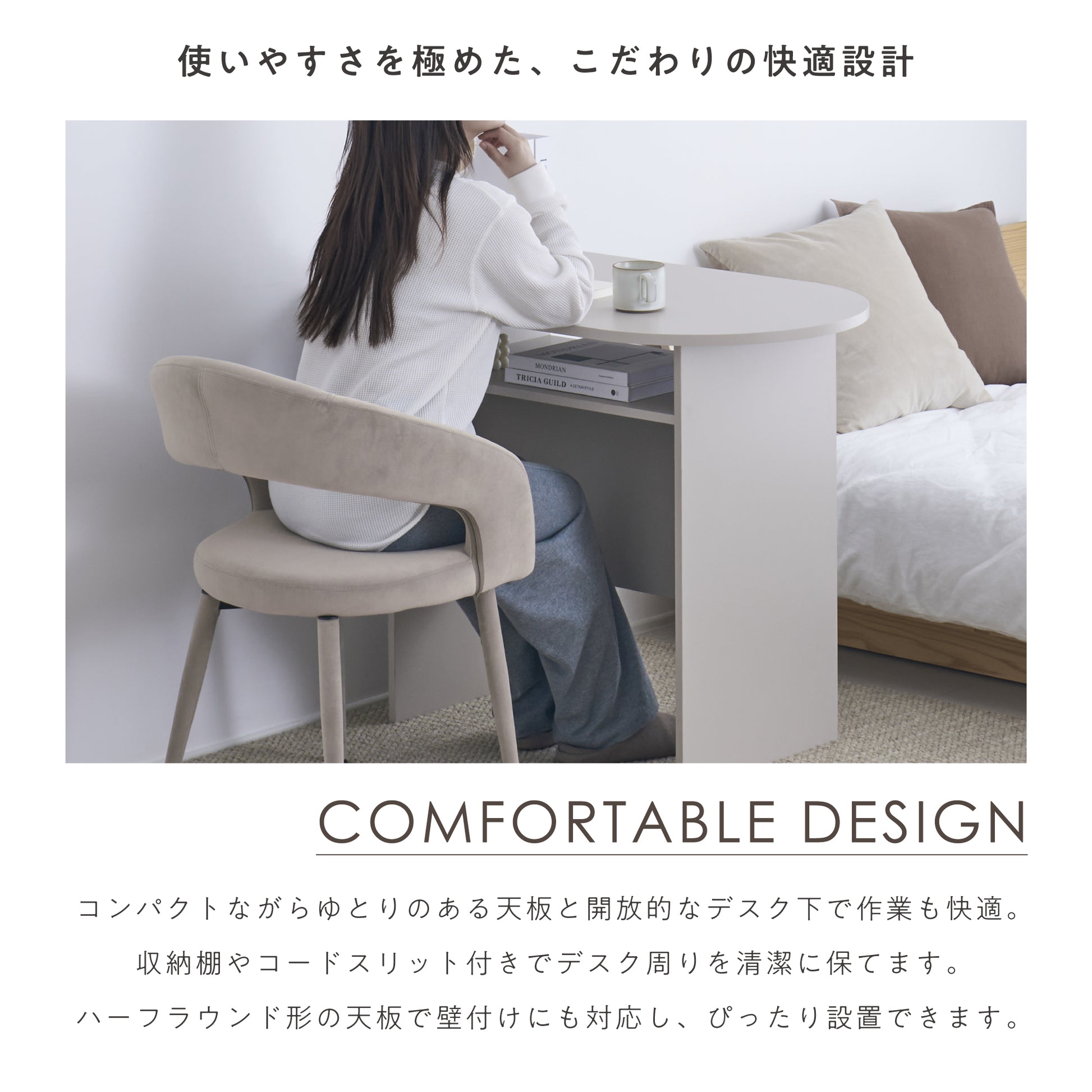 コンパクトながらゆとりのある天板と開放的なデスク下スペースで、作業や食事を快適に行えます。天板下には便利な収納棚を備え、小物をすっきり片づけることができます。さらに、コード類をまとめられるタップ収納とコードスリットで、デスク周りを整えて快適な作業環境をサポート◎壁付けにも対応するハーフラウンド形のデザインで、限られた空間を有効に活用できる点が魅力です。