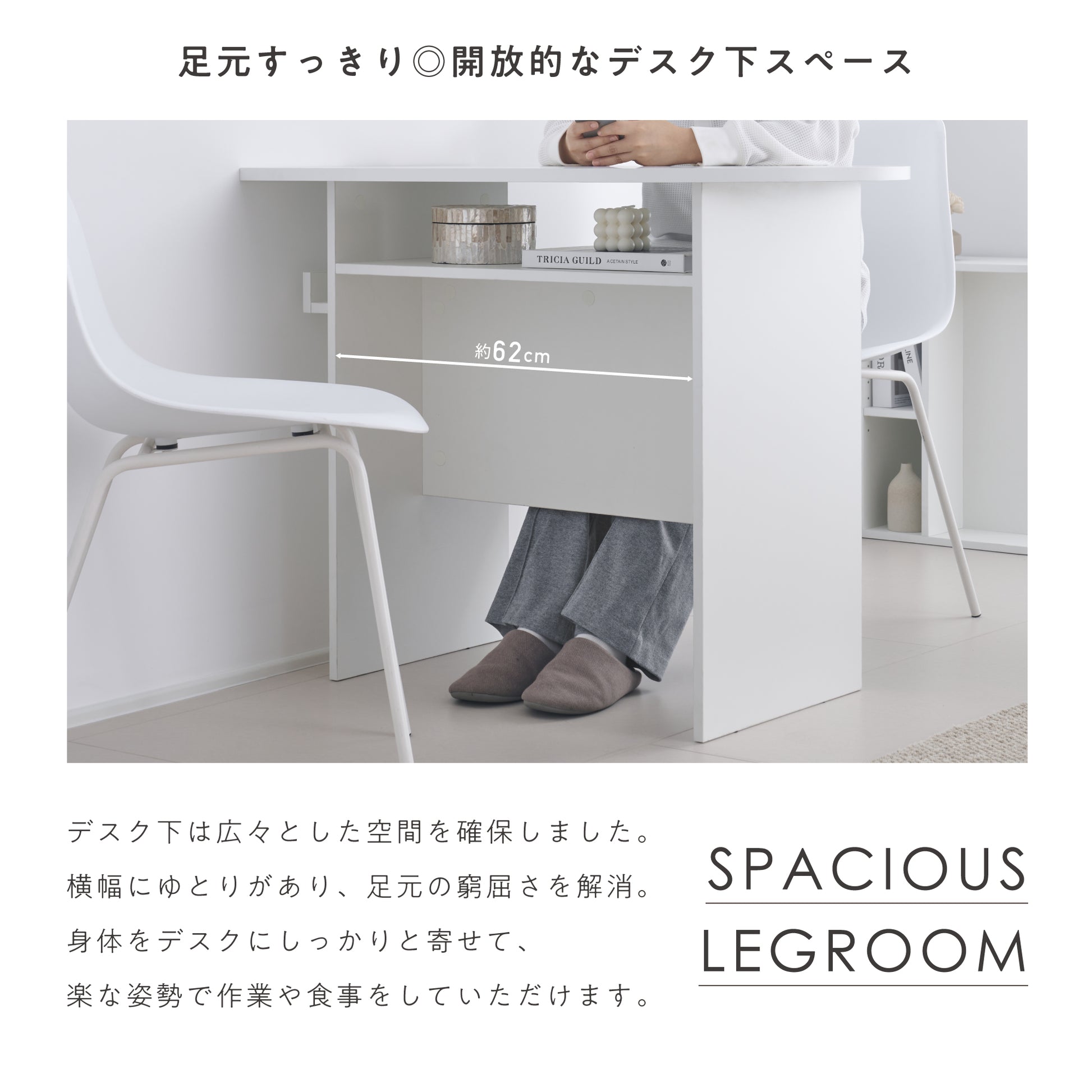 デスク下スペースは広々とした空間を確保しました。横幅約62cmのゆとりを持たせることで、足元の窮屈さを解消します。これにより、身体をデスクにしっかりと寄せて、楽な姿勢で作業や食事を楽しむことができます。