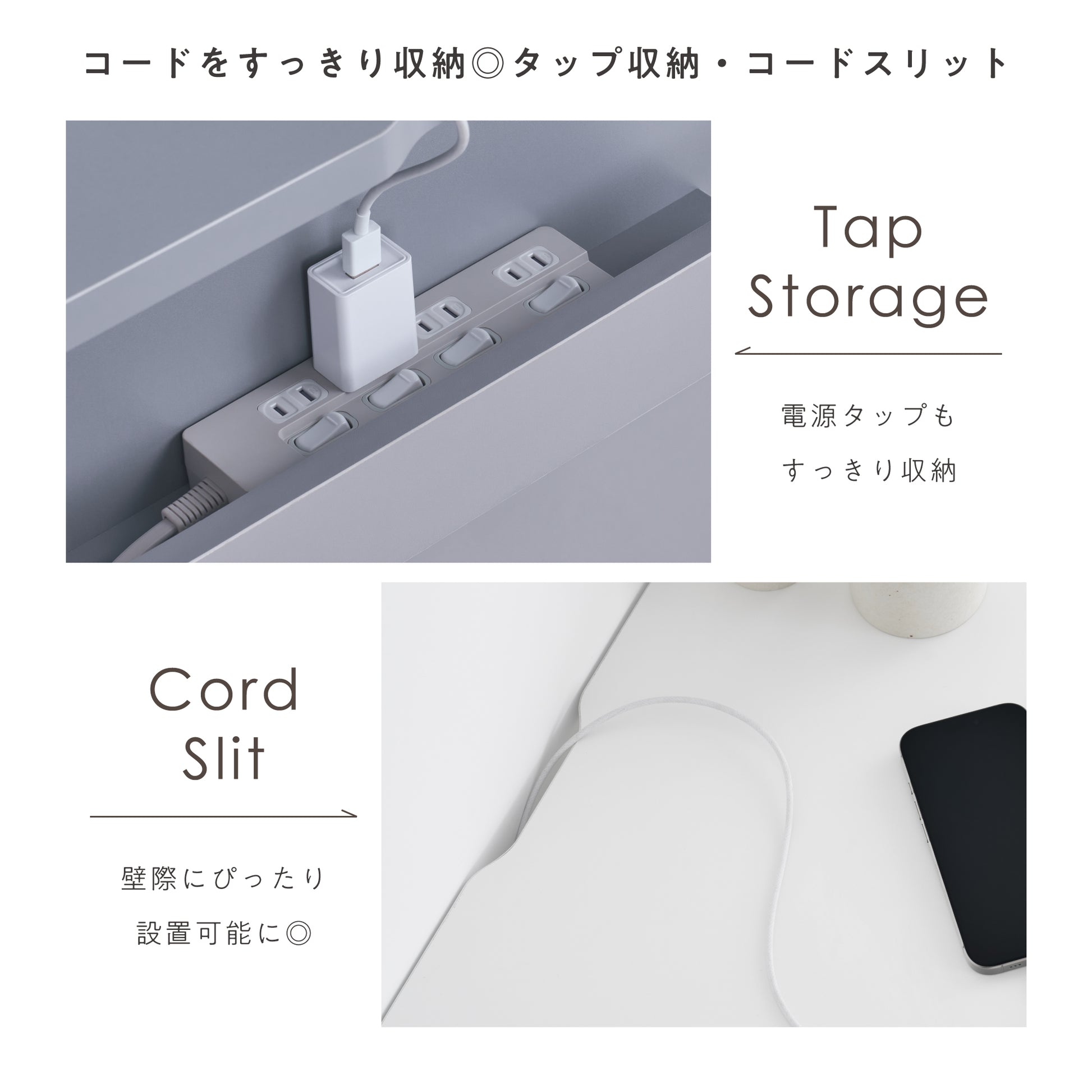 Function/04 | コードをすっきりまとめられるタップ収納・コードスリット付き