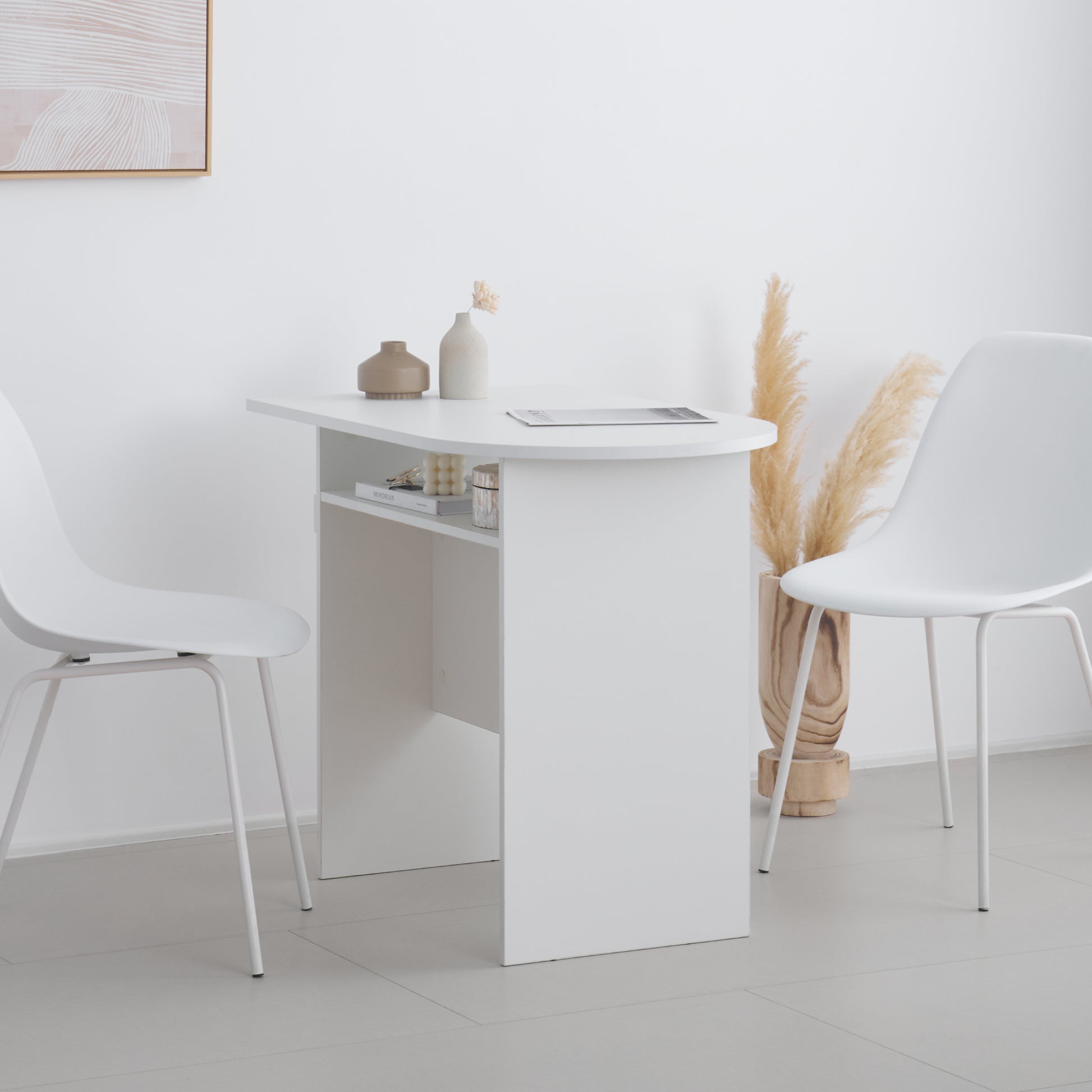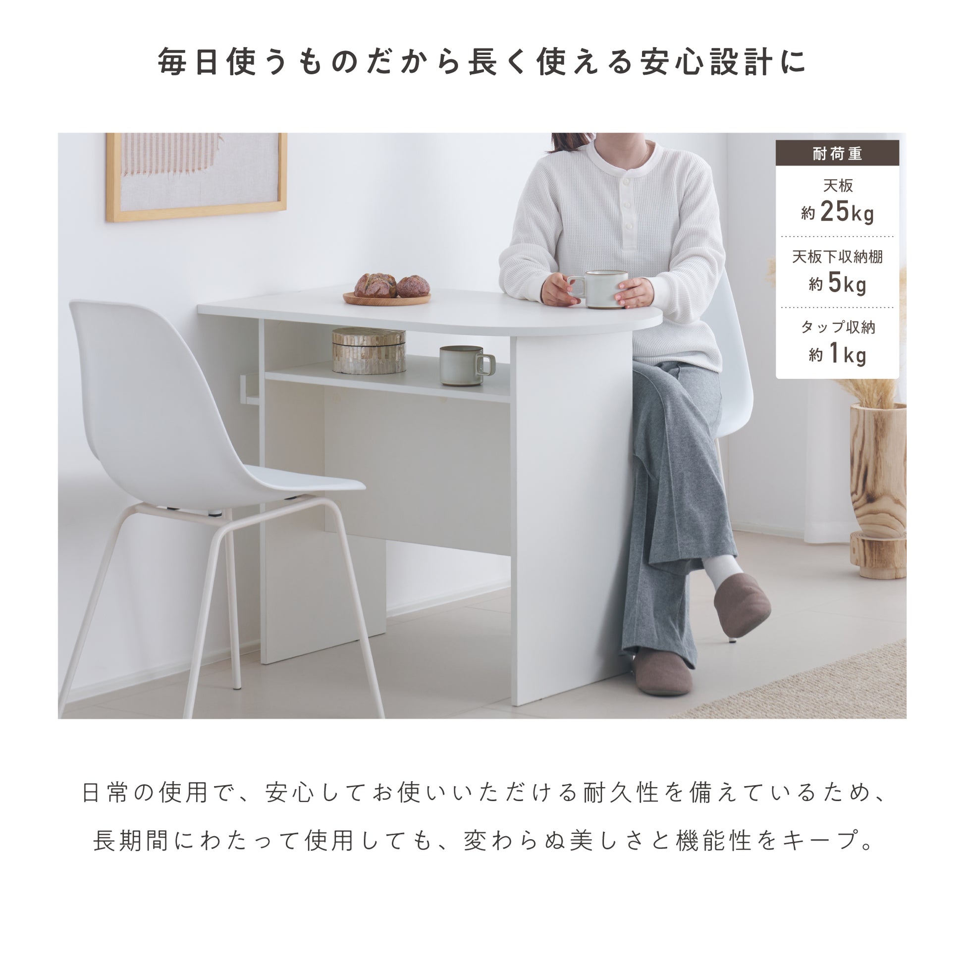 コンパクトながらゆとりのある天板と開放的なデスク下で、作業や食事を快適に。収納棚やコード整理機能も備え、限られた空間でもすっきり使えます。