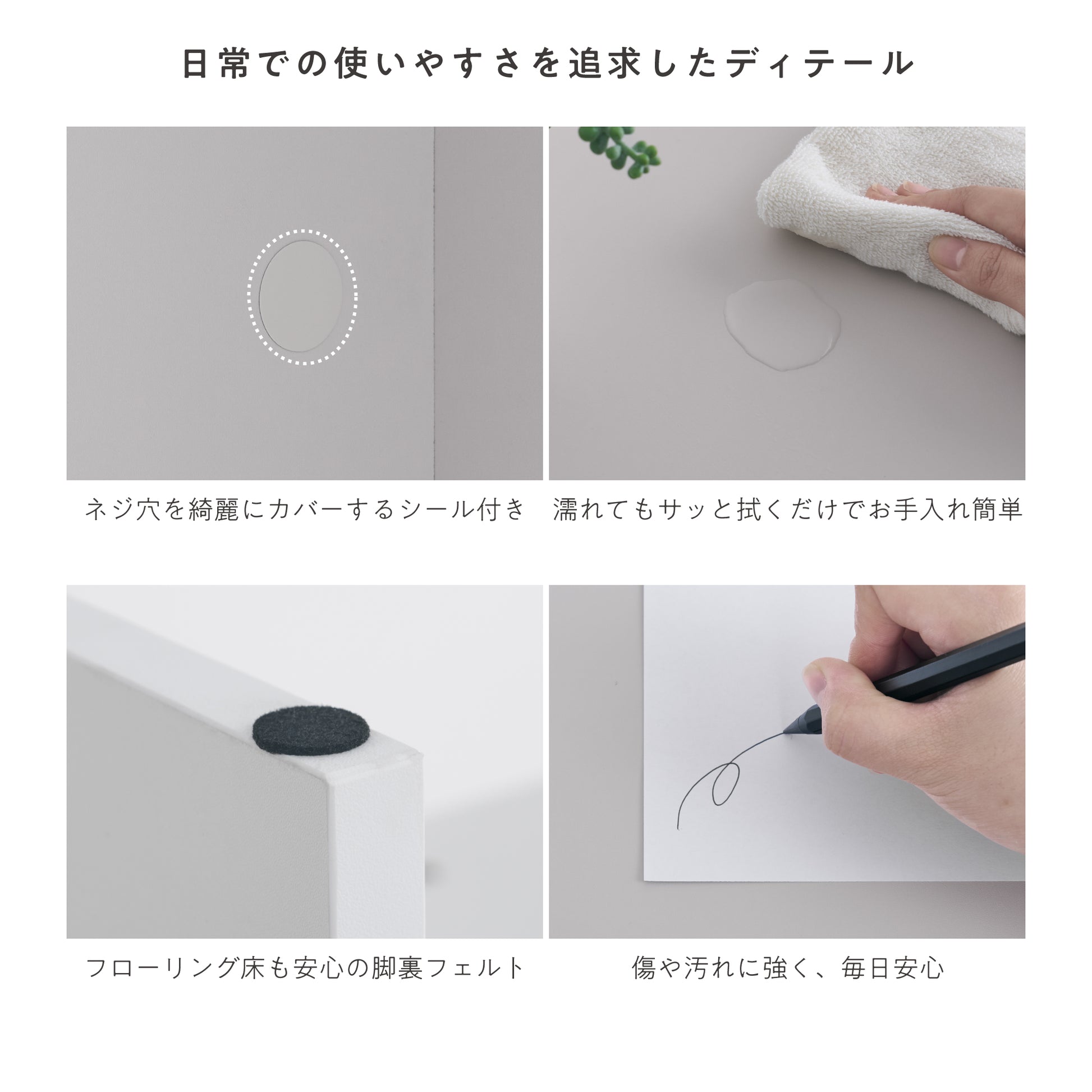 床への傷付きを抑えるフェルト付きの脚で、どんな場所でも安心して使用できます。さらに、ネジ穴を綺麗に隠すカバーシール付きで見た目もすっきり。天板は傷やペン跡に強く安心◎また、水拭きできるので、濡れてもサッと拭くだけでお手入れ簡単です。日常の使いやすさを第一に考え、細部までこだわりを詰め込みました。