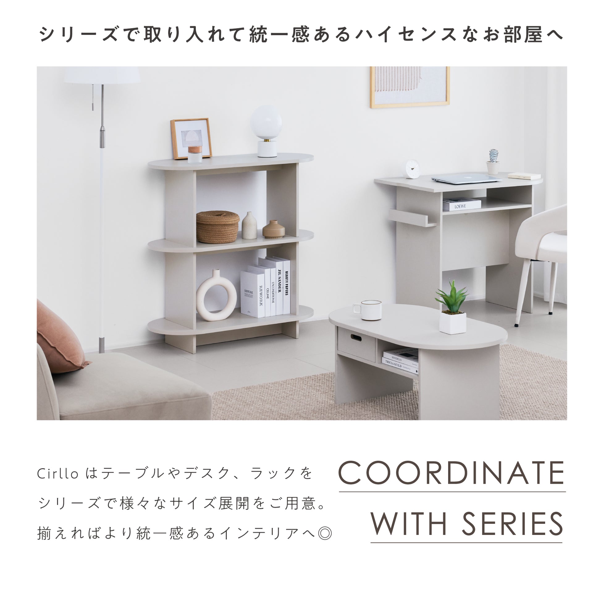 Cirlloはテーブルやデスク、ラックなど、シリーズで豊富なバリエーションをご用意。同じシリーズの商品と組み合わせることで、お部屋が統一感のあるモダンなインテリアに。シンプルな洗練された佇まいが幅広いテイストに調和し、あなたの生活空間をより豊かにしてくれます。