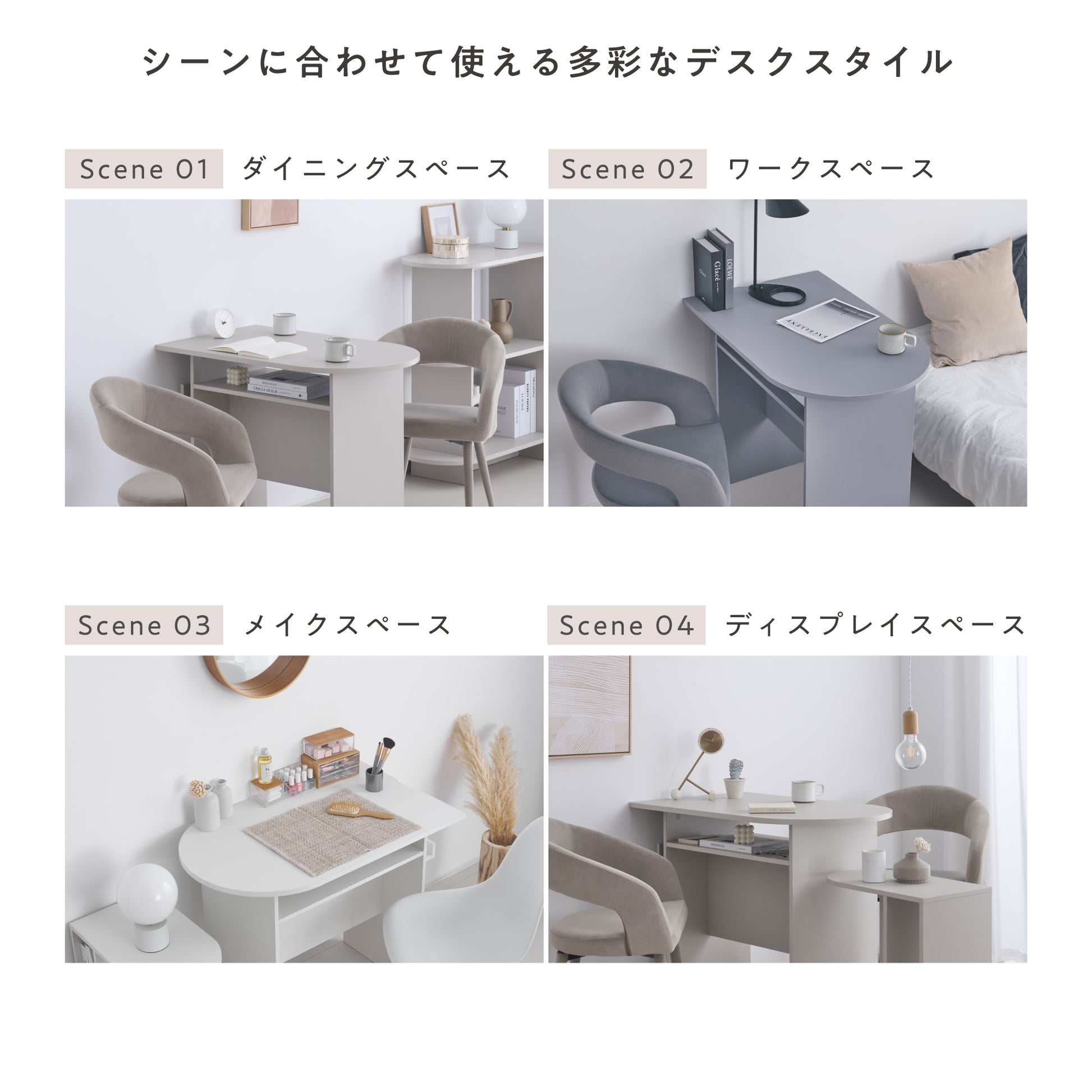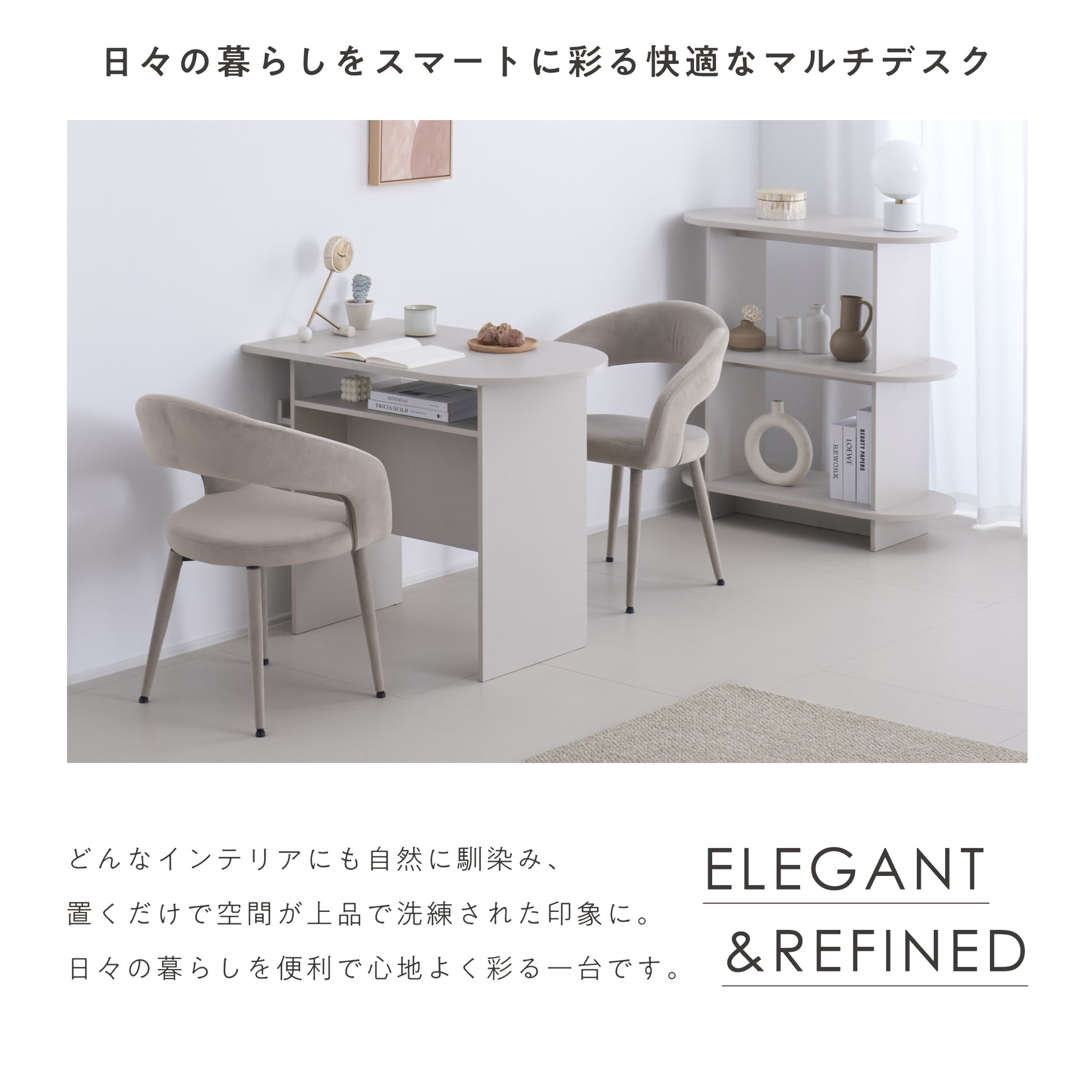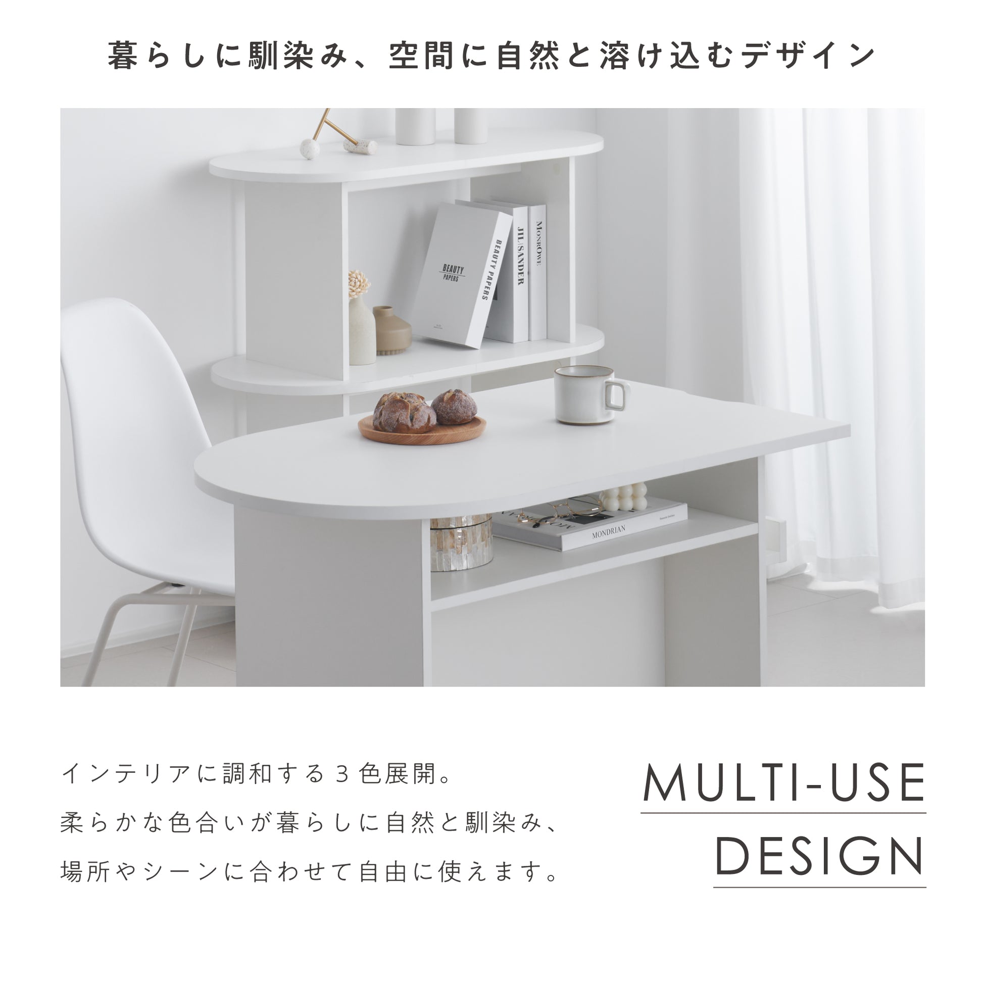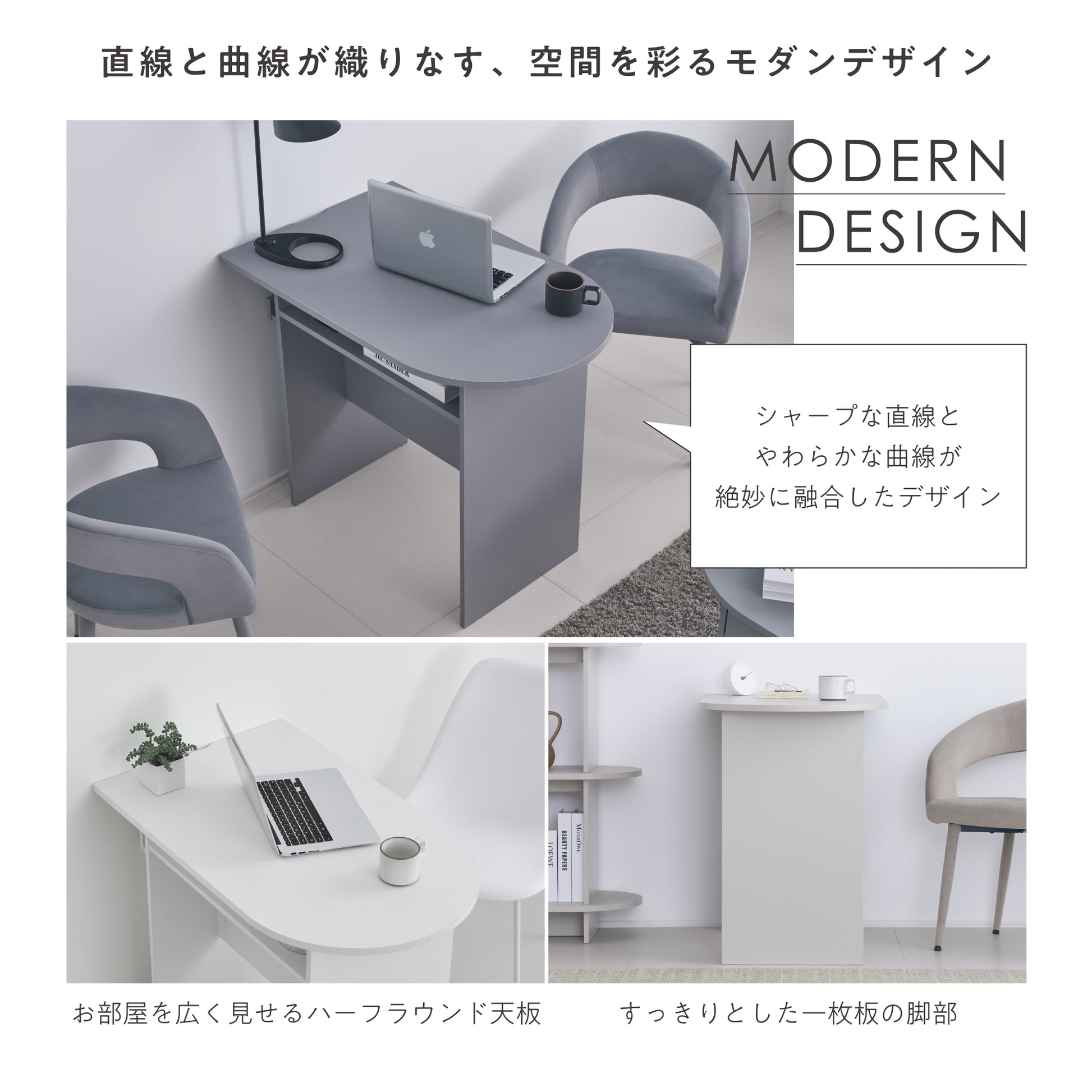 シャープな直線とやわらかな曲線が織りなすモダンなフォルムと、空間に溶け込むやさしい色合いが魅力のマルチデスクです。どんな空間にも自然に馴染み、置くだけでお部屋に上品で洗練された雰囲気を添えます。コンパクトでありながら、作業や趣味など日々のライフスタイルにしっかり寄り添い、快適に使える一台。あなたの暮らしをより便利で心地よく彩る、新しい日常のパートナーとして活躍します。