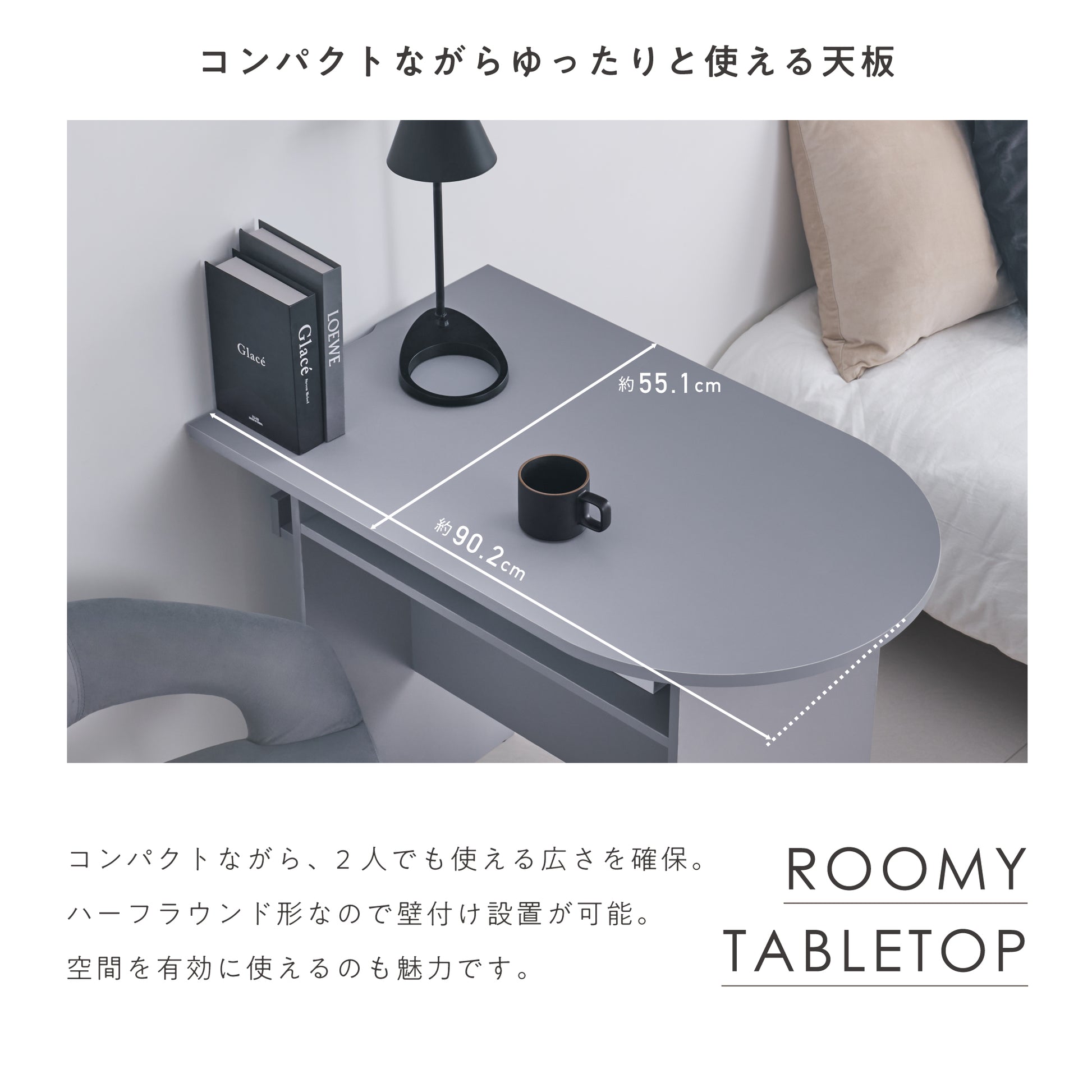 コンパクトサイズでありながら、2人での使用でも十分な広さを確保しました。小ぶりながらもしっかりとした存在感でお部屋の雰囲気を引き立てます。さらに、ハーフラウンド形のデザインなので壁付けも可能。空間を有効に使えるのも魅力です。