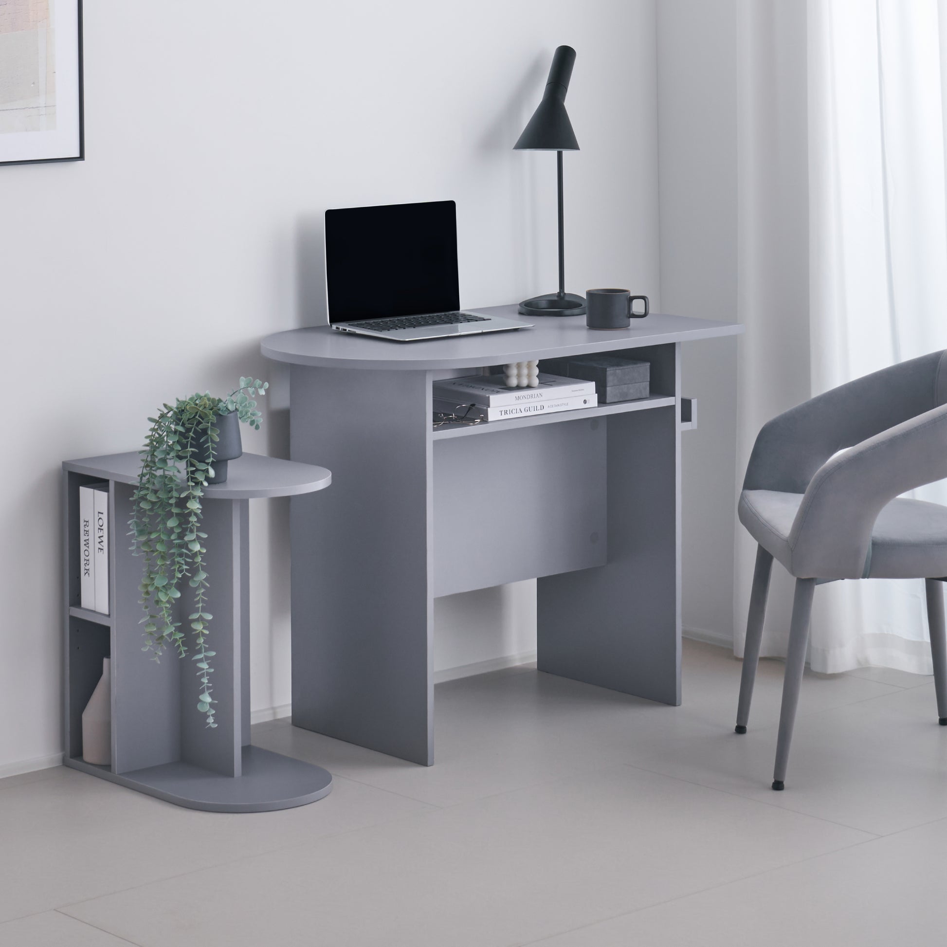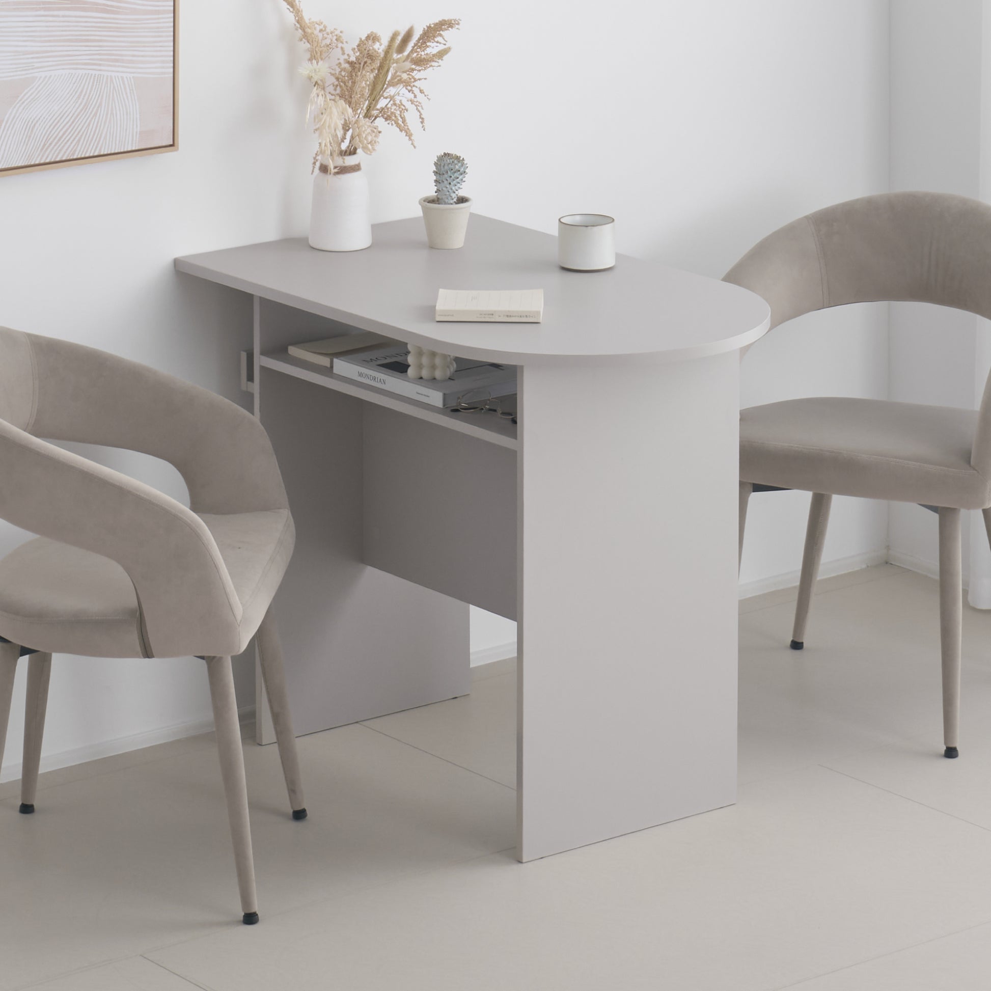 シャープな直線とやわらかな曲線が絶妙に融合した、モダンデザインの魅力をぎゅっと詰め込んだ一台です。洗練されたフォルムとやさしい色合いは、どんな空間にも自然に馴染み、置くだけで部屋全体に上質な品格と洗練された雰囲気をプラスします。作業台としてだけでなく、インテリアの一部としてお部屋を美しく彩る特別な存在です。