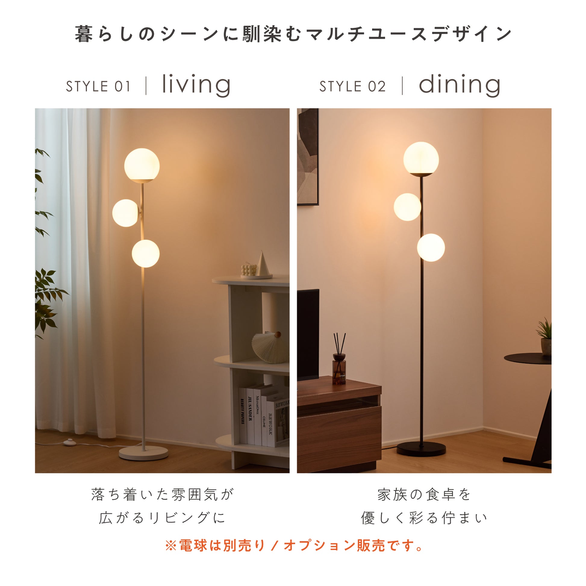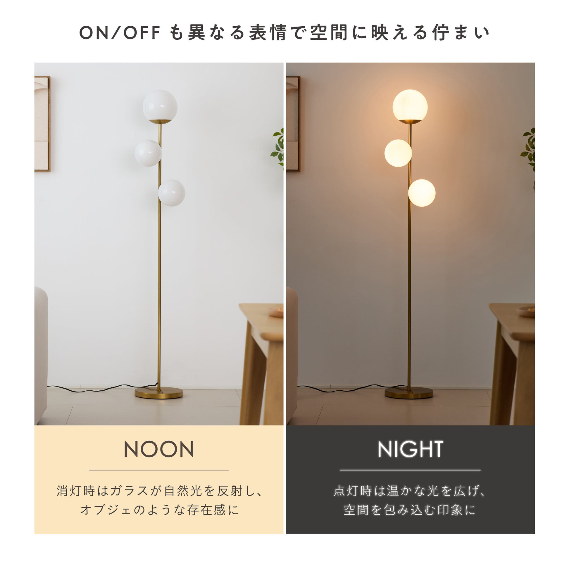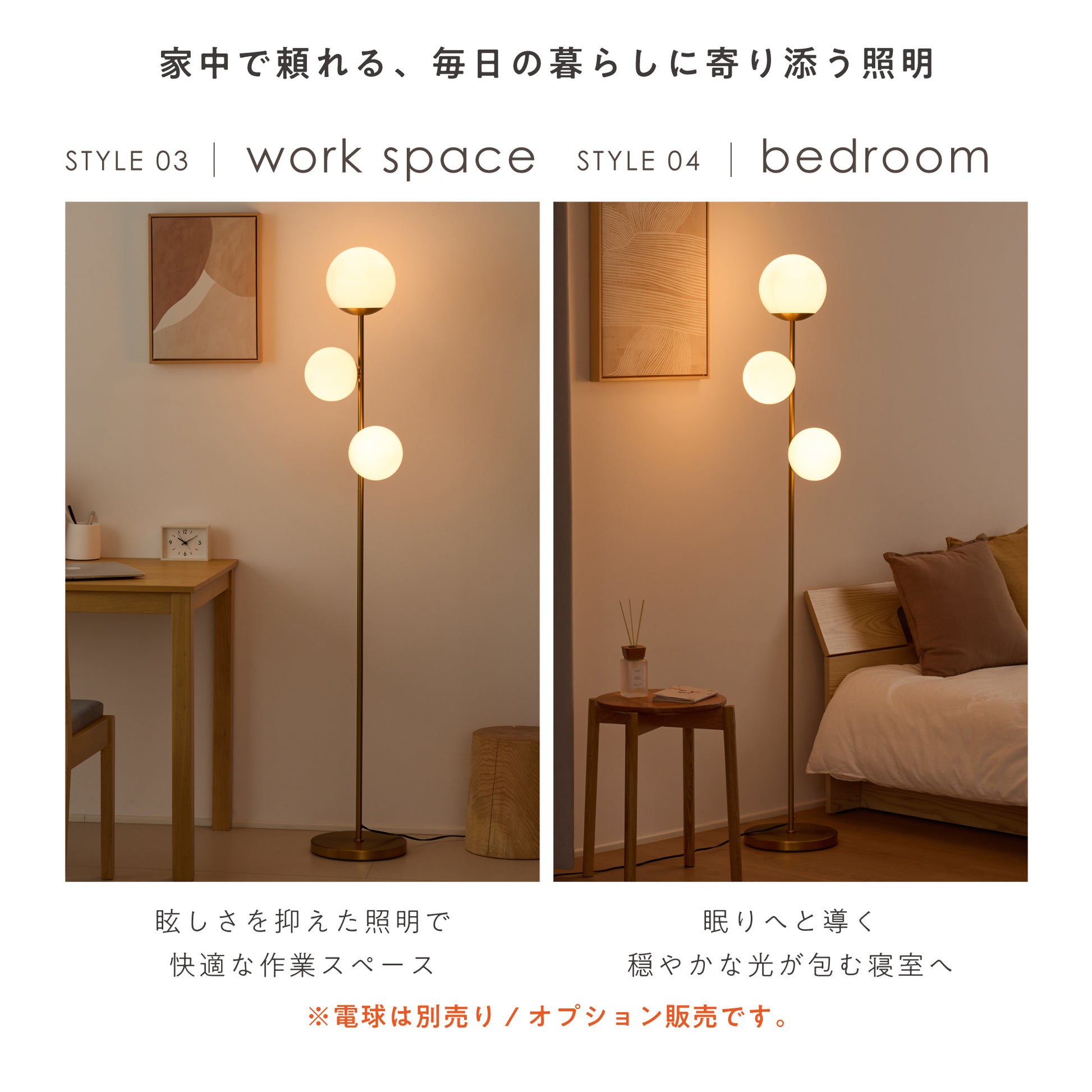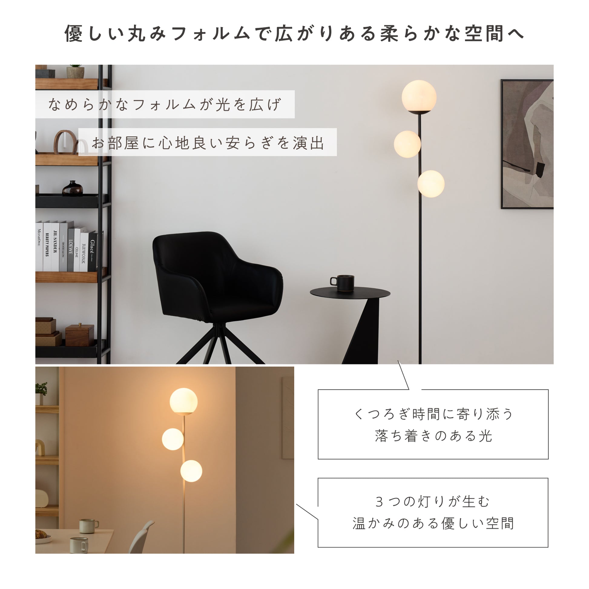 丸みのあるガラスシェードが光を優しく拡散し、空間全体を温かく包み込みます。なめらかなフォルムにより光は自然と四方八方へと広がり、リビングや寝室に安らぎのある心地良い雰囲気を演出。異なる高さに配置された3つのガラスシェードが立体的な光のレイヤーを生み出し、フロアライトとしてはもちろん間接照明としても活躍するなど、多彩な表情を楽しめます。
