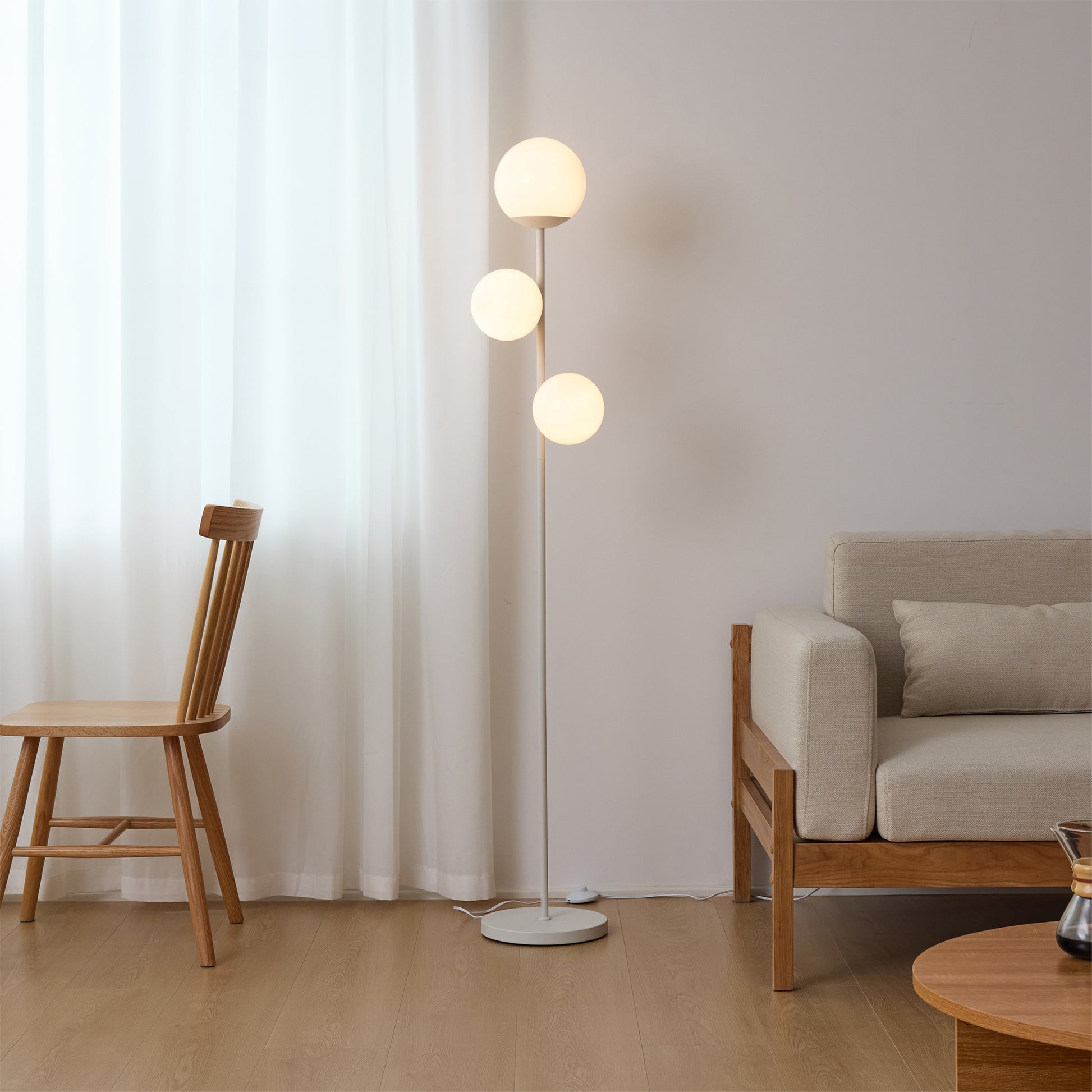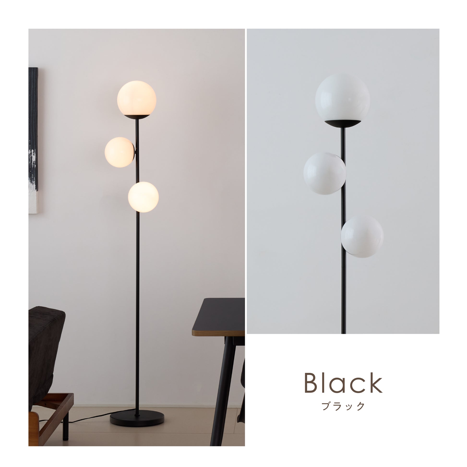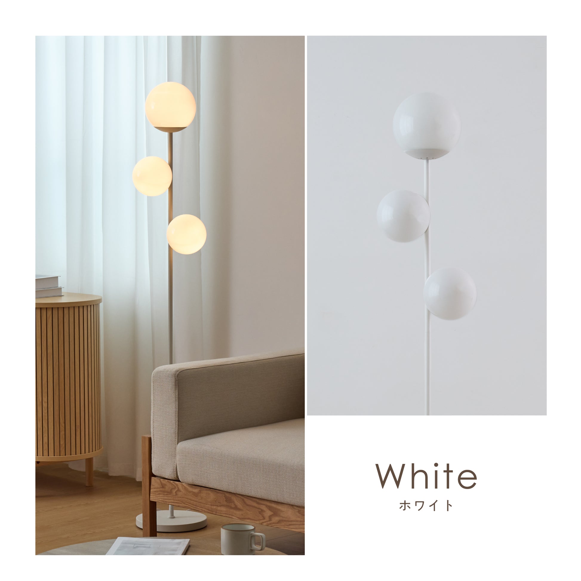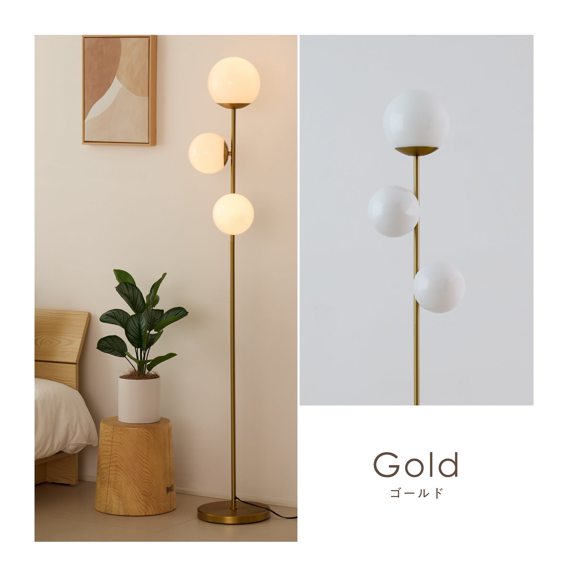 丸みのあるガラスシェードが光を優しく拡散し、空間全体を温かく包み込みます。なめらかなフォルムにより光は自然と四方八方へと広がり、リビングや寝室に安らぎのある心地良い雰囲気を演出。異なる高さに配置された3つのガラスシェードが立体的な光のレイヤーを生み出し、フロアライトとしてはもちろん間接照明としても活躍するなど、多彩な表情を楽しめます。
