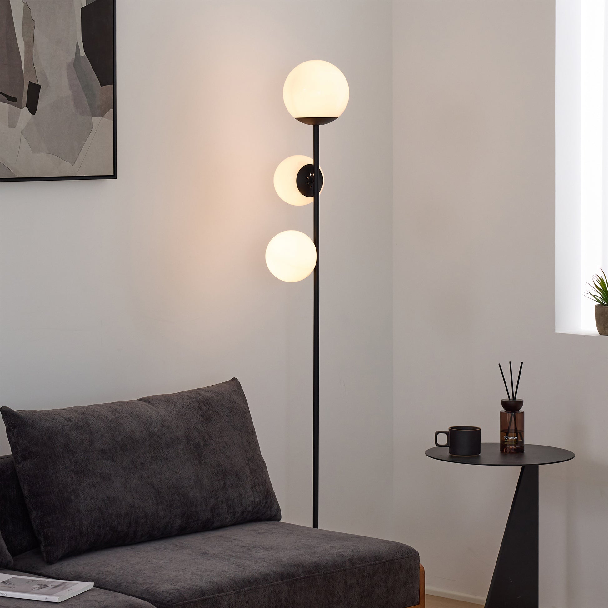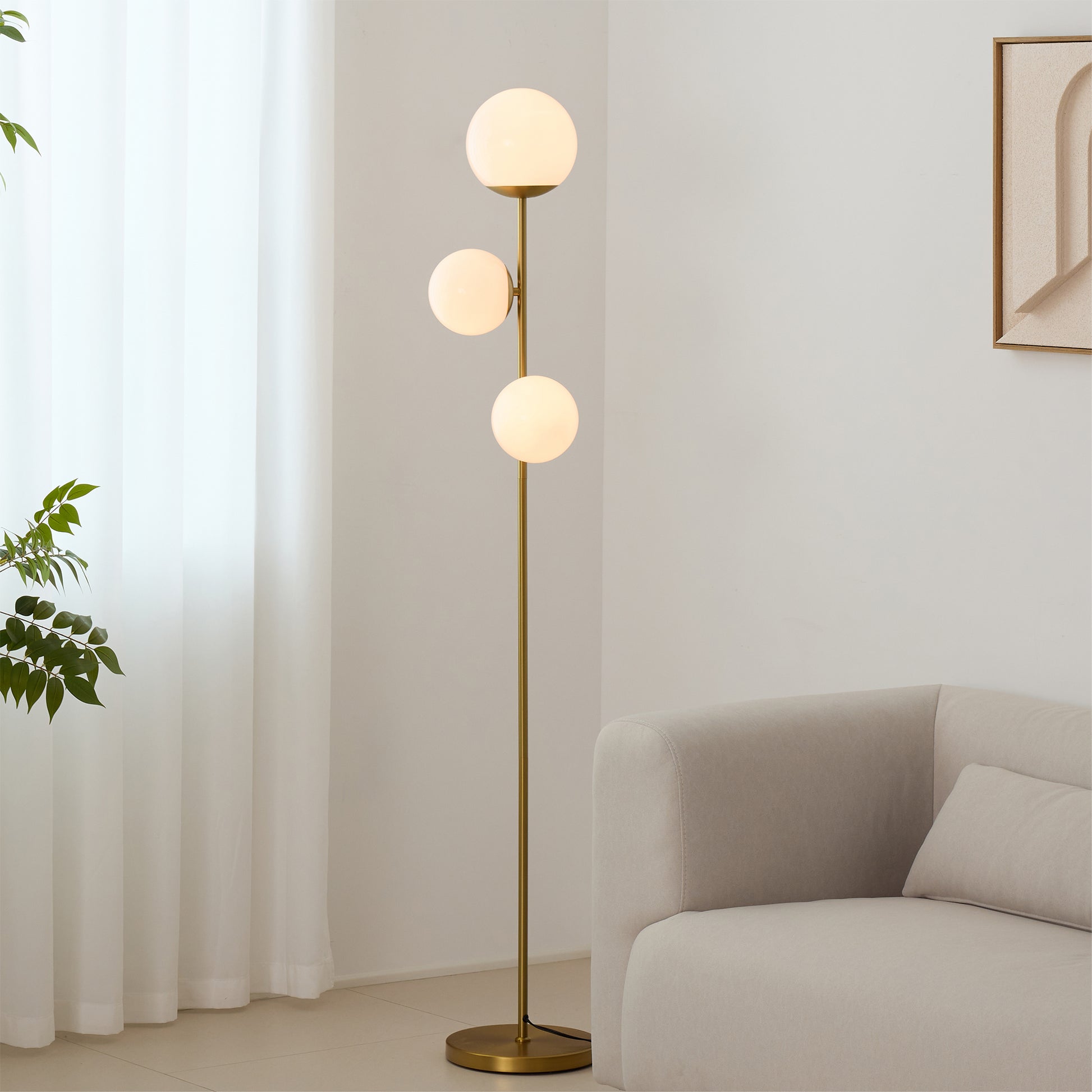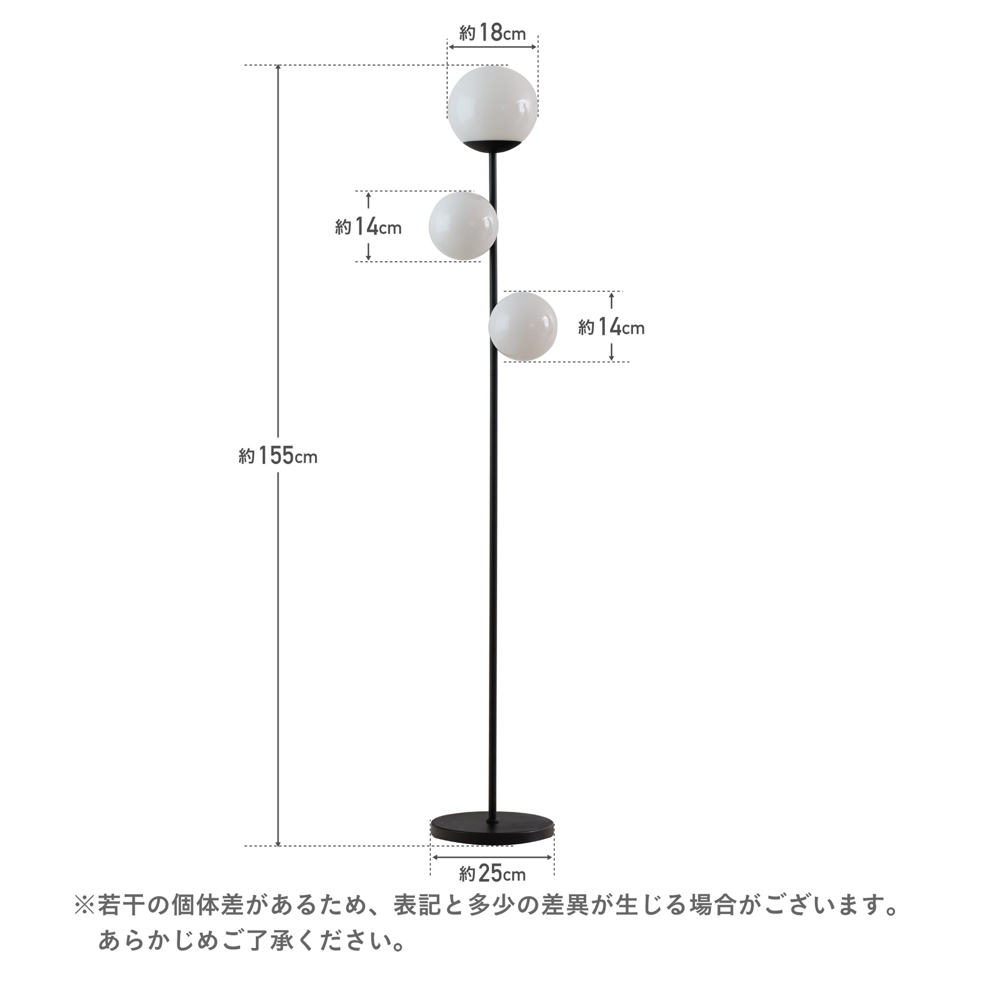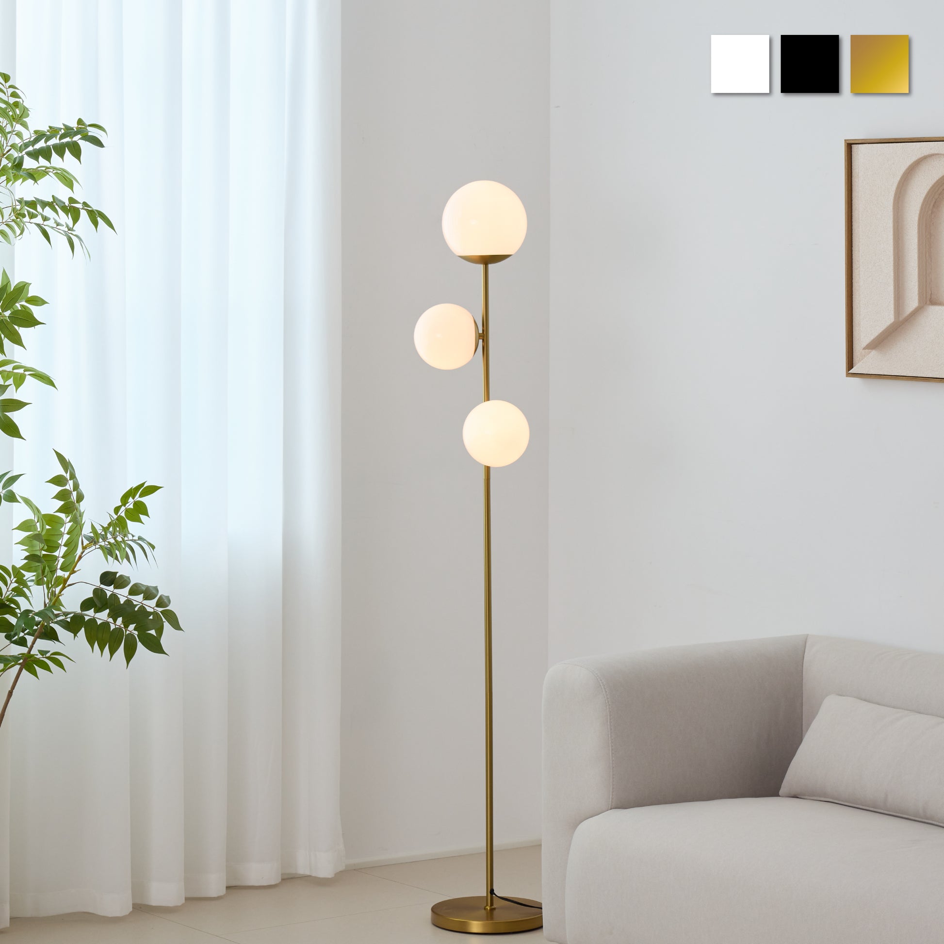 丸みのあるガラスシェードが光を優しく拡散し、空間全体を温かく包み込みます。なめらかなフォルムにより光は自然と四方八方へと広がり、リビングや寝室に安らぎのある心地良い雰囲気を演出。異なる高さに配置された3つのガラスシェードが立体的な光のレイヤーを生み出し、フロアライトとしてはもちろん間接照明としても活躍するなど、多彩な表情を楽しめます。