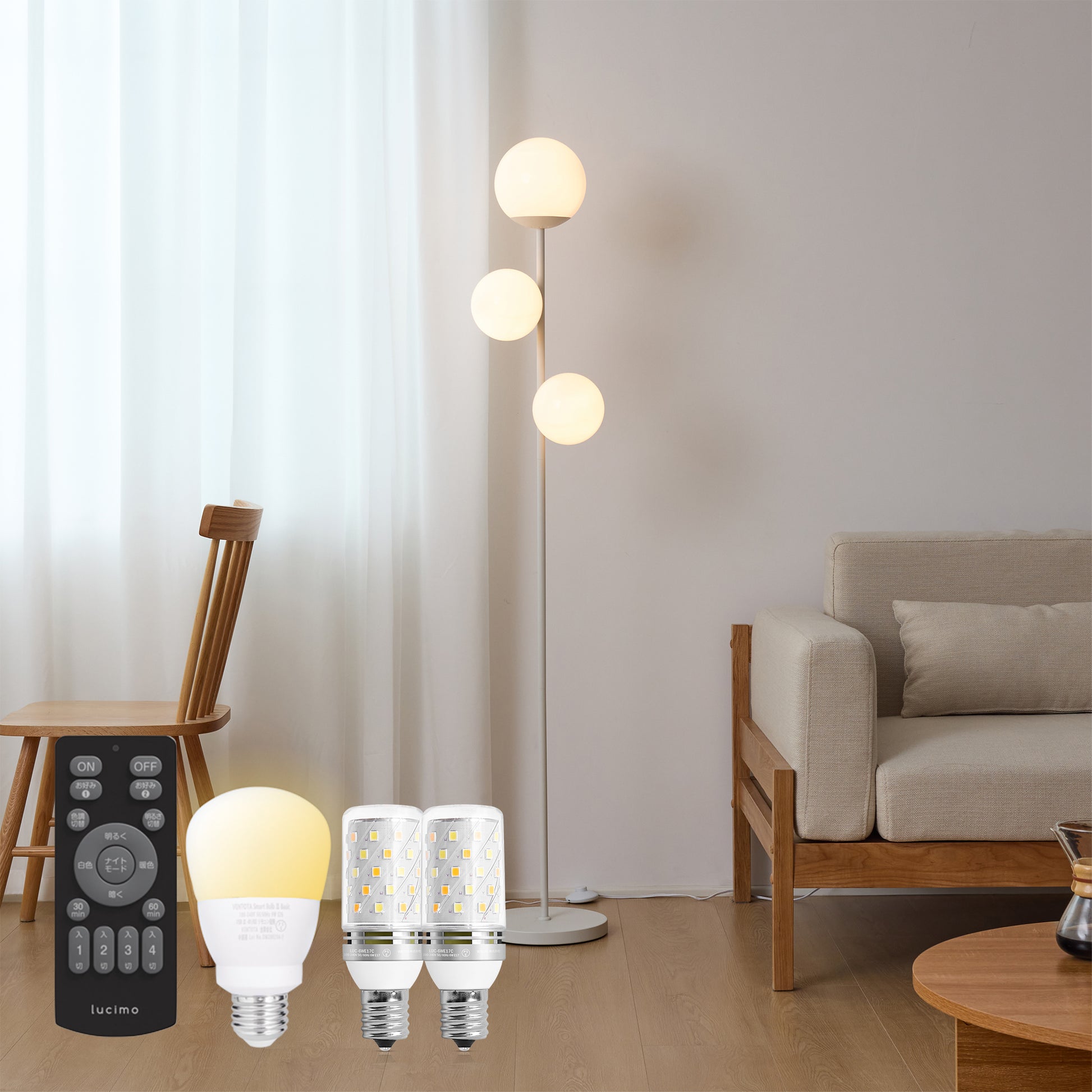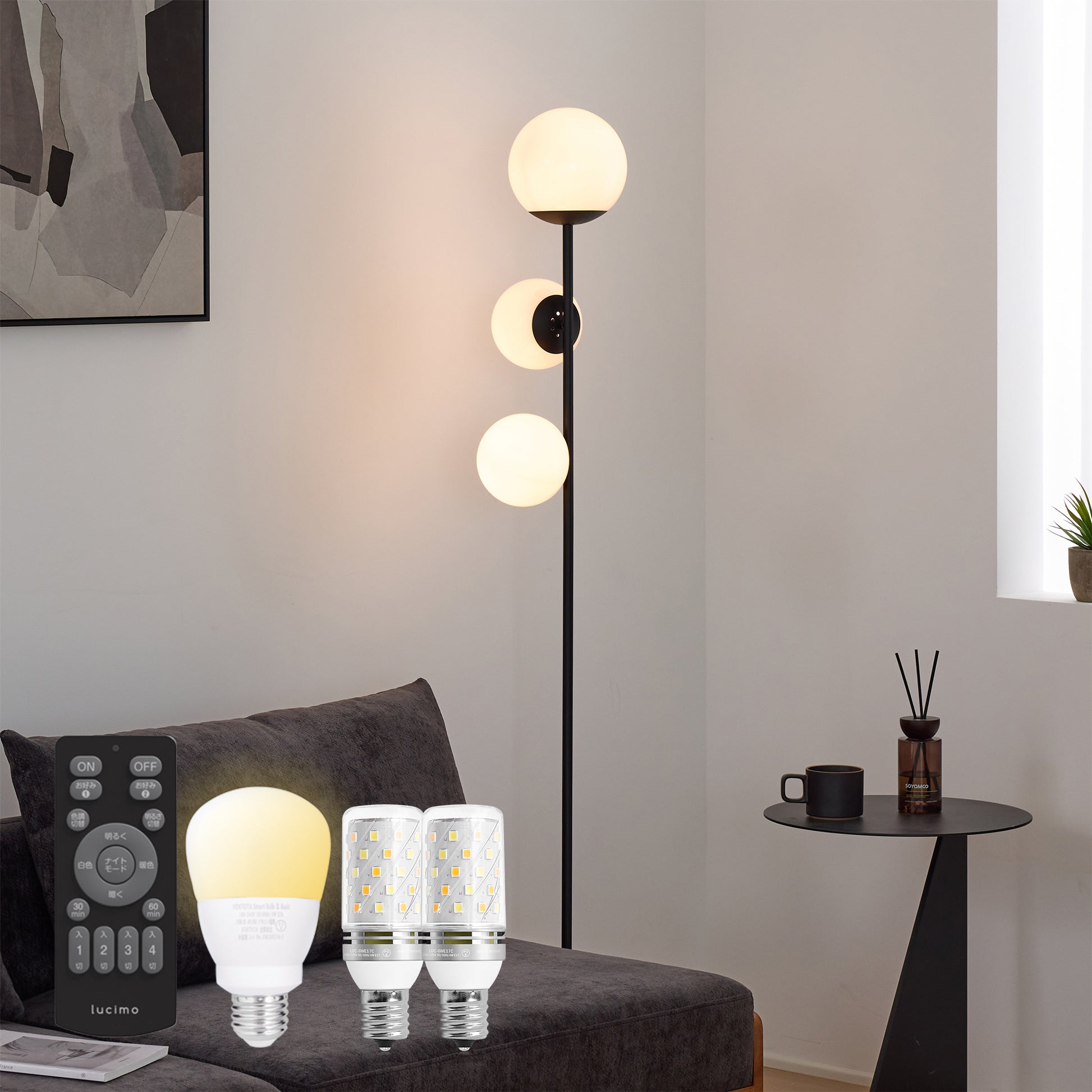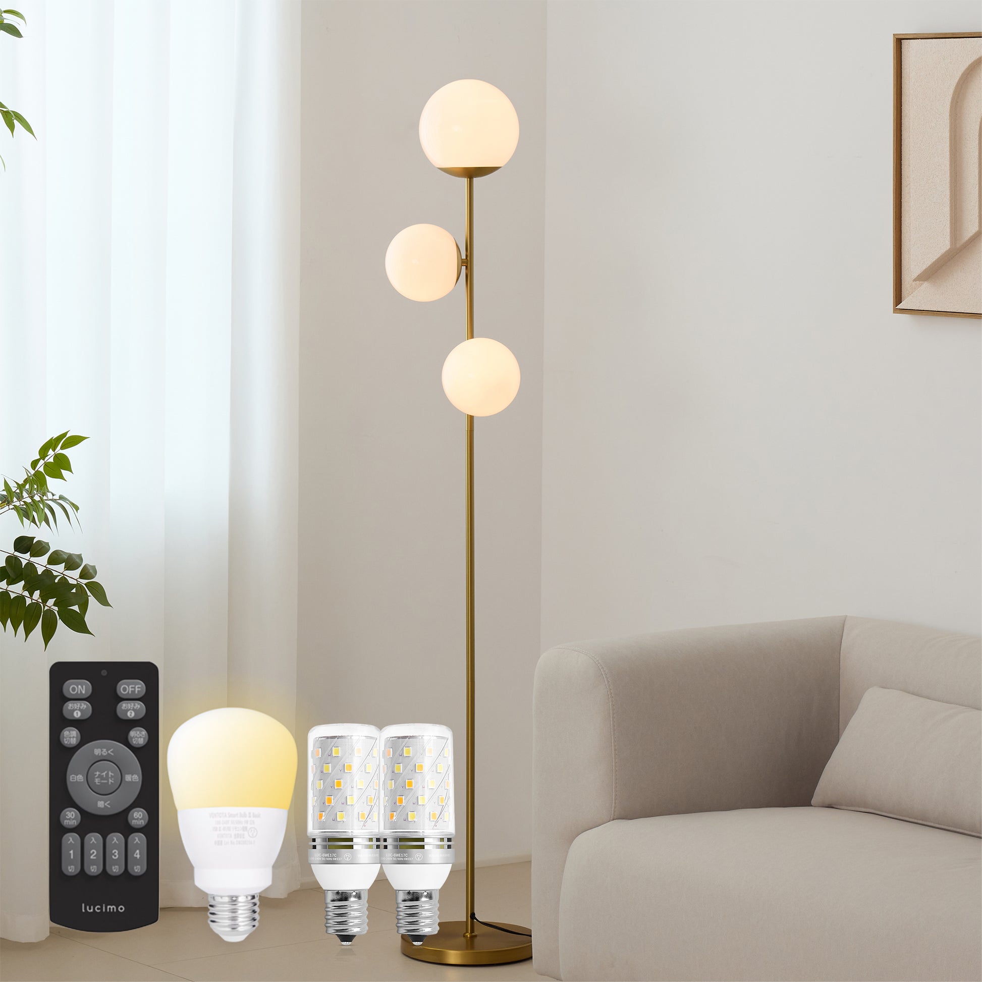 フロアライト「Modico-F3」は、ミニマルな美しさと実用性を兼ね備えたデザイン照明です。上部のメイン電球(E26)と両サイドの小型電球(E17)による3灯構成で、立体感のある柔らかな光を演出します。丸みのあるフォルムとガラスシェードが空間に温かみを与え、リビングや寝室に最適です。高さ約155cmのスリム設計で省スペースにも対応。別売りのリモコン対応LED電球を使えば、明るさや色温度の調整も可能です。ブラック・ホワイト・ゴールドの3色展開で、インテリアに合わせて選べます。