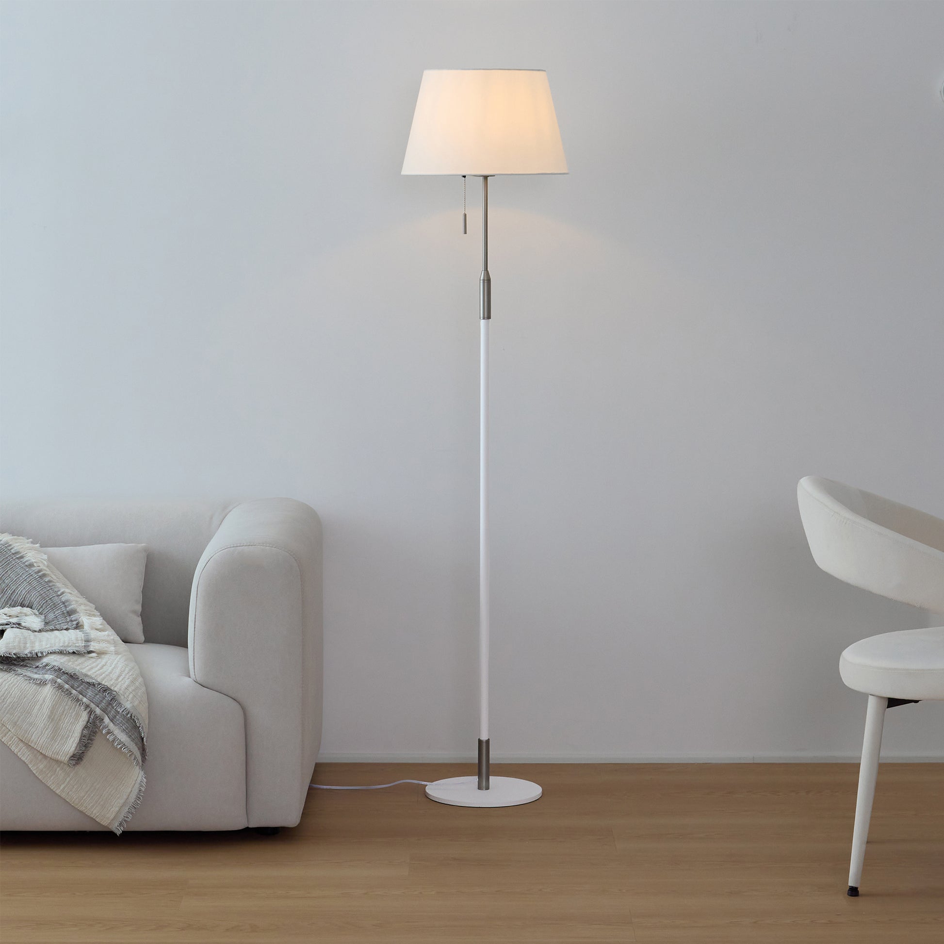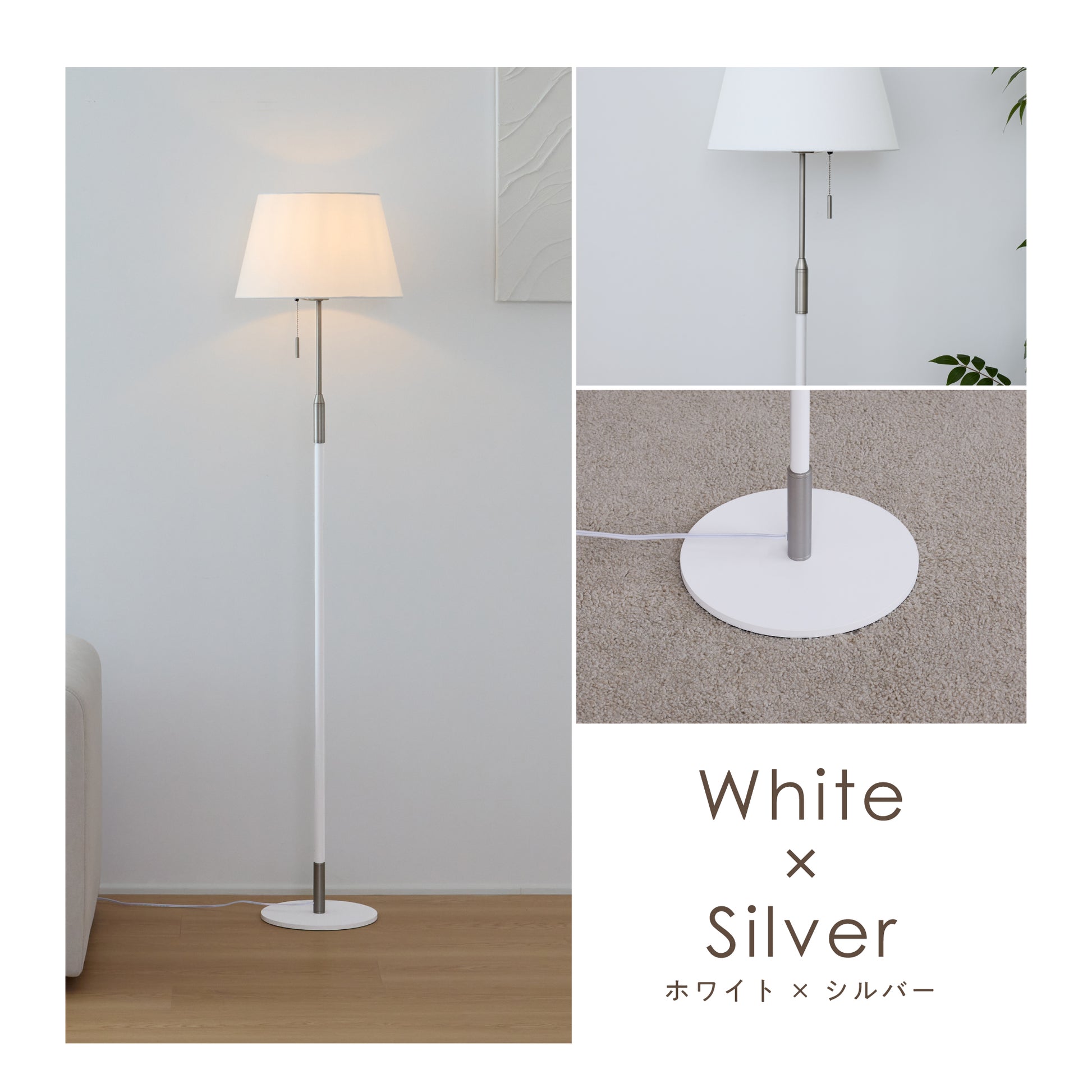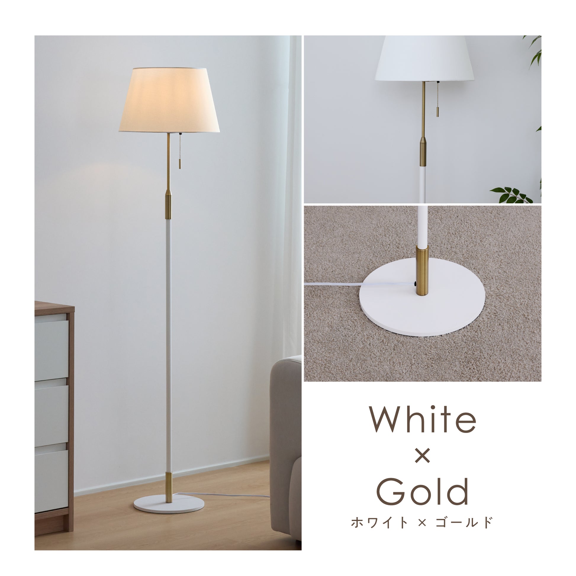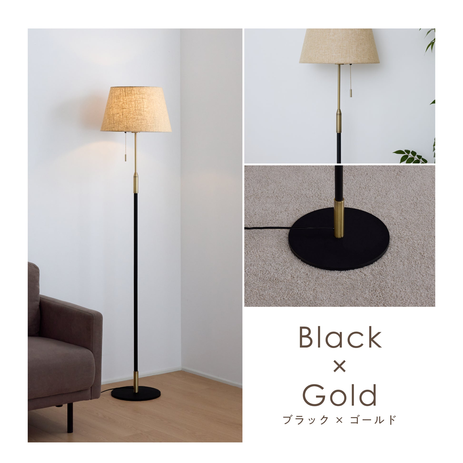 毎日の暮らしにさりげない特別感を添えるフロアライト。柔らかく光を広げるファブリックシェードが、空間を落ち着いた雰囲気に整えます。シェードの上部と下部から広がる光が壁に自然なグラデーションをつくり、日常の中でほっとできる時間を演出。操作はフットスイッチとプルチェーンの2通りで、就寝前でも使いやすい設計にしました。消灯していてもシンプルなデザインがお部屋に馴染み、リビングや寝室など幅広く活躍します。重みのあるベースで安定感があり、高さ約156cmでも圧迫感を抑えたバランスに仕上げました。季節や気分に合わせて、光の雰囲気を手軽に変えられるのも魅力です。