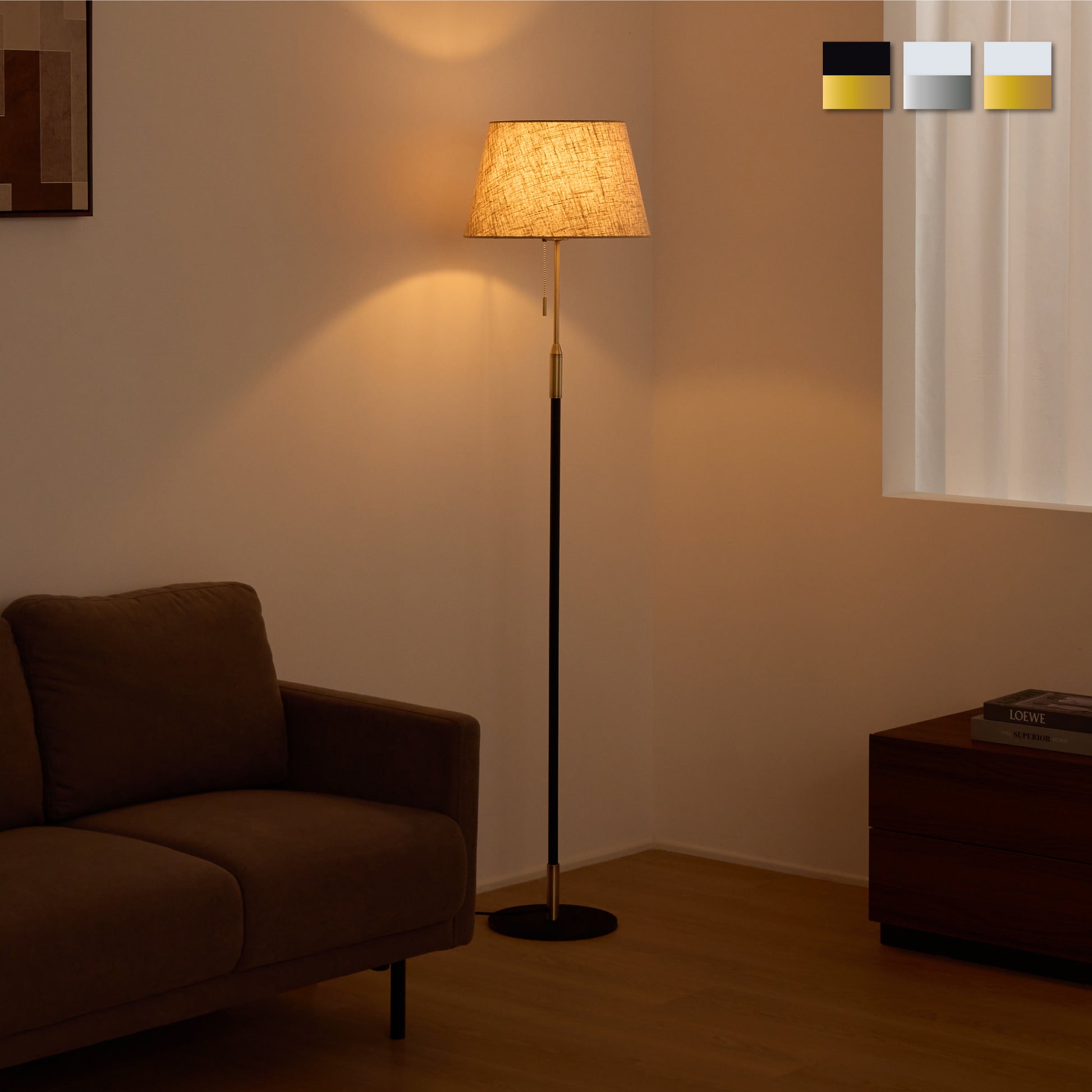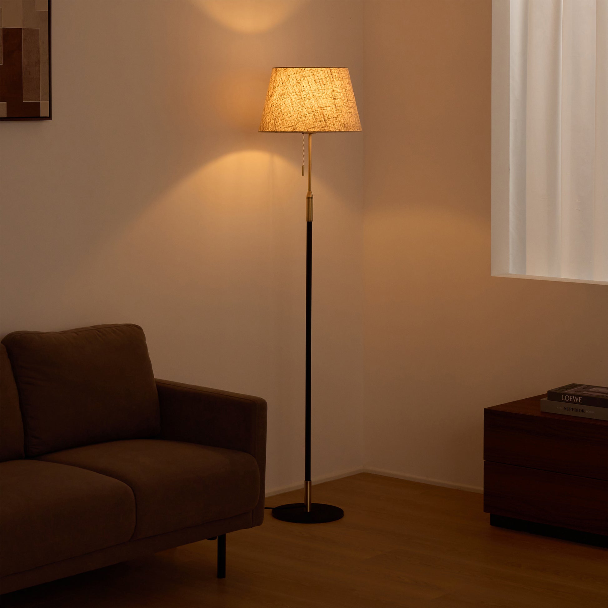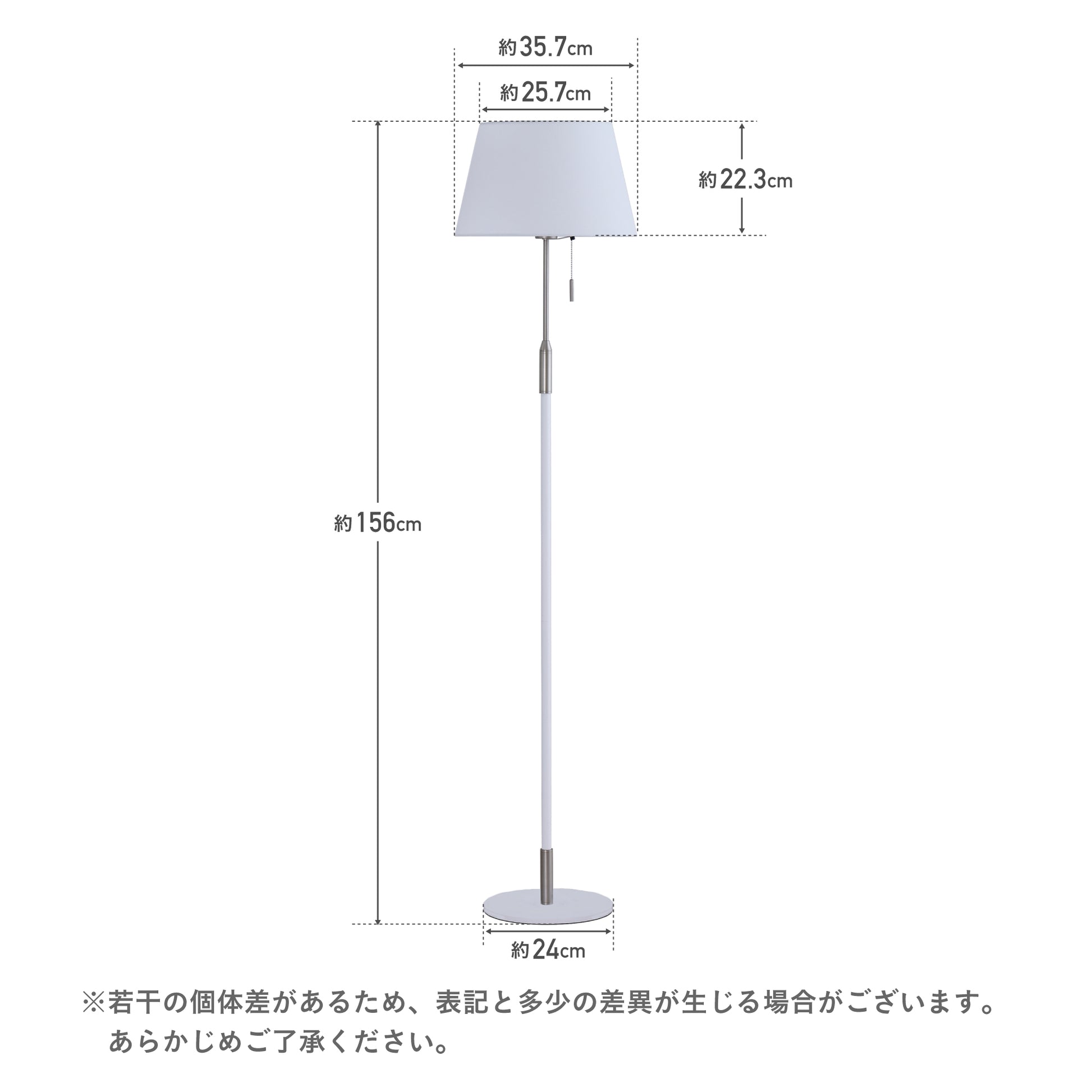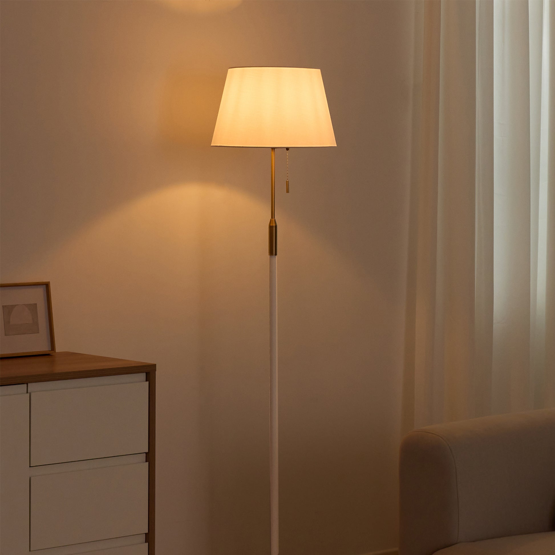 毎日の暮らしにさりげない特別感を添えるフロアライト。柔らかく光を広げるファブリックシェードが、空間を落ち着いた雰囲気に整えます。シェードの上部と下部から広がる光が壁に自然なグラデーションをつくり、日常の中でほっとできる時間を演出。操作はフットスイッチとプルチェーンの2通りで、就寝前でも使いやすい設計にしました。消灯していてもシンプルなデザインがお部屋に馴染み、リビングや寝室など幅広く活躍します。重みのあるベースで安定感があり、高さ約156cmでも圧迫感を抑えたバランスに仕上げました。季節や気分に合わせて、光の雰囲気を手軽に変えられるのも魅力です。