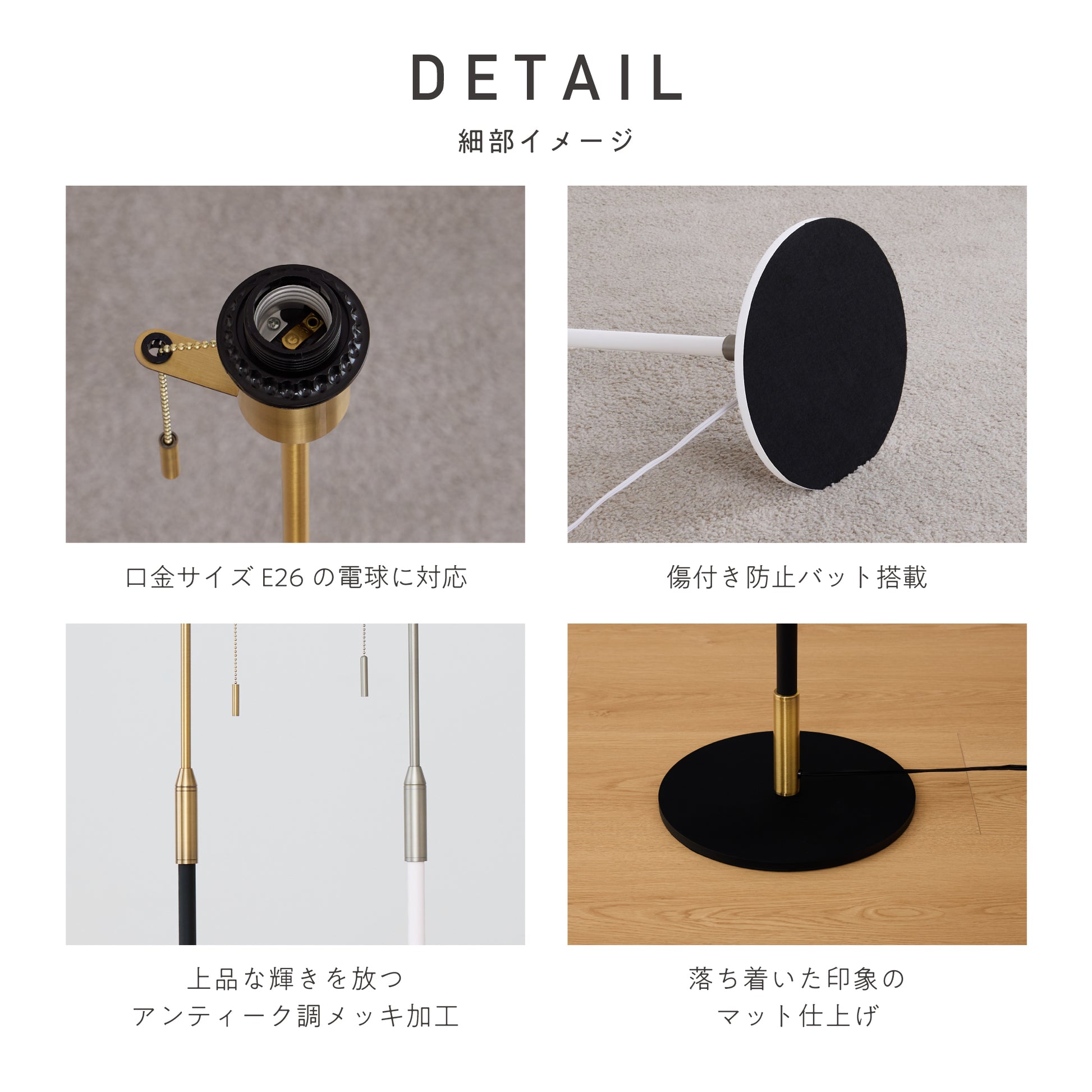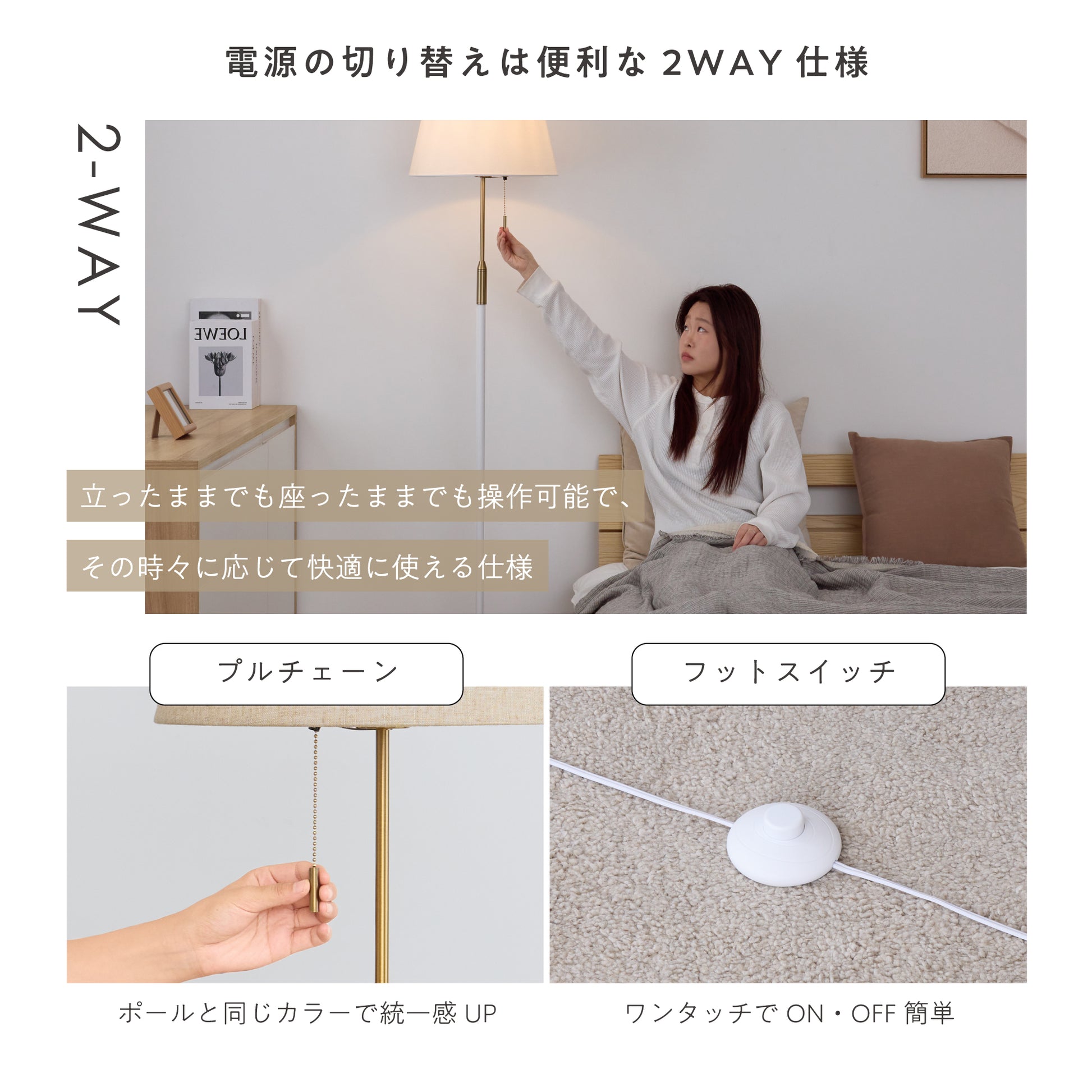手元のプルチェーンスイッチと足元のフットスイッチを備えた2WAY仕様。どちらからでも操作できるため、立ち座りの手間がなく、その時々に応じた使いやすい方法を選べます。毎日何度も使う照明だからこそ、細部まで使いやすさを追求しました。