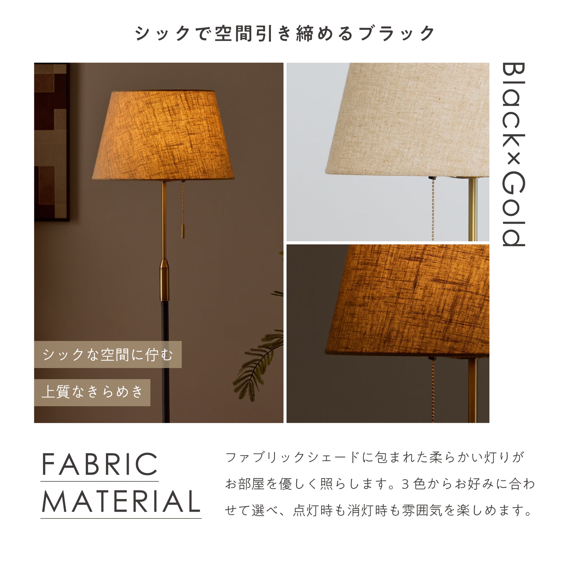 シェードはファブリック素材を使用。ファブリックシェードに包まれた柔らかい電球の灯りがお部屋を優しく照らします。3つのカラーバリエーションからお部屋の雰囲気に合わせて選べ、点灯時の柔らかな灯りはもちろん、消灯時もカラーの組み合わせをお楽しみいただけます。