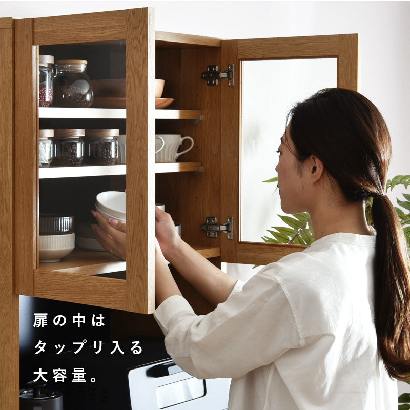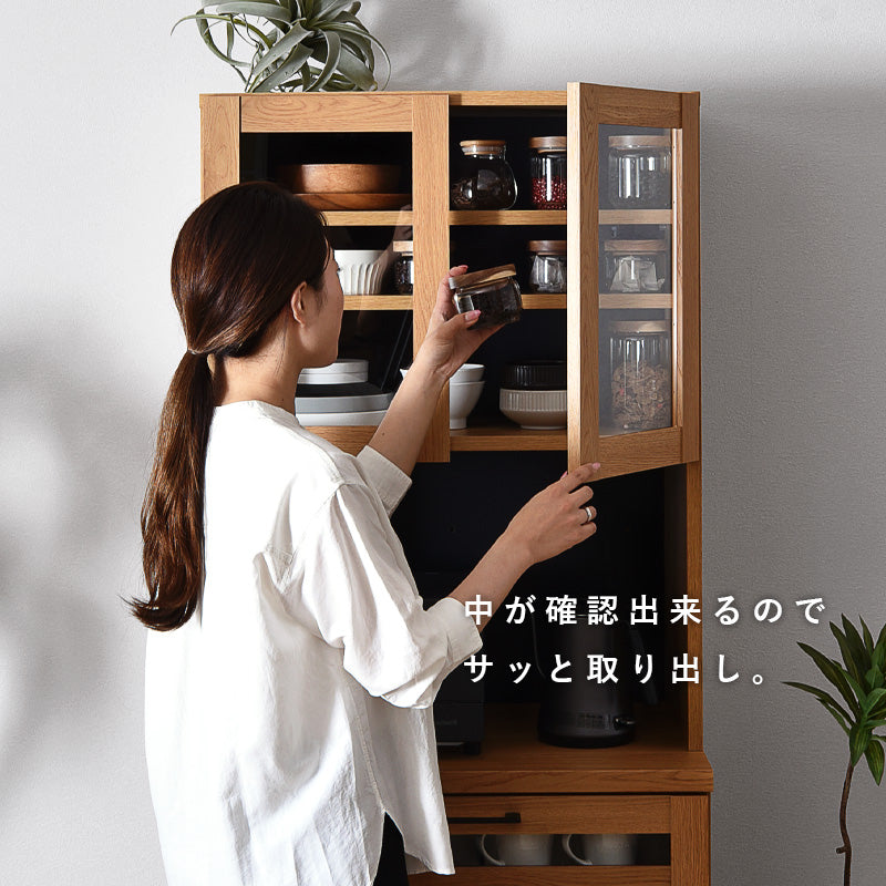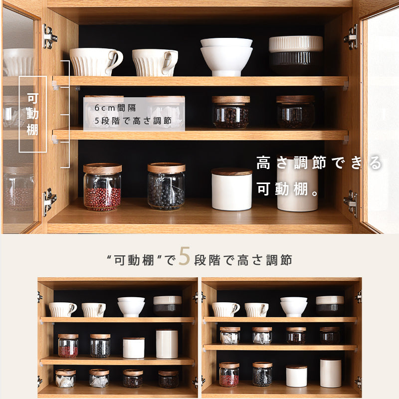 可動棚2枚を搭載しており6cm間隔で5段階に高さ調節が可能。扉の中はたっぷり入る大容量でガラスで魅せながらスッキリと収納が可能。