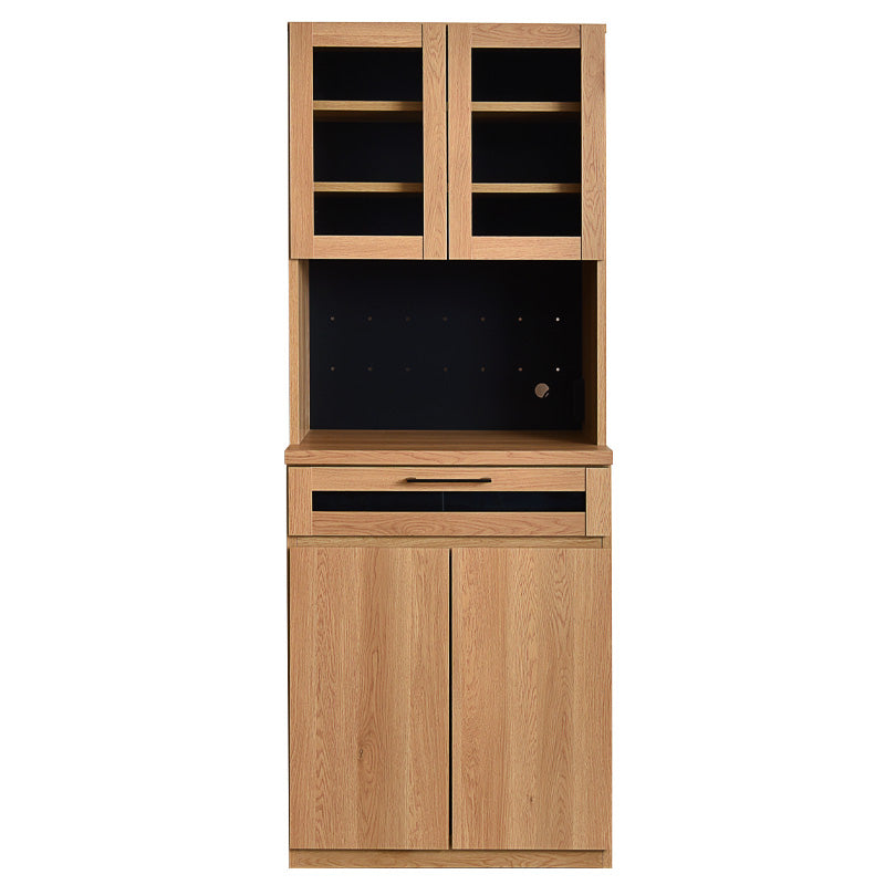 キッチンボード本体はキッチンに合わせやすいナチュラルな木の温もりを感じる木目に、アイアン風の取手のブラックで全体を引き締めたアクセントに。