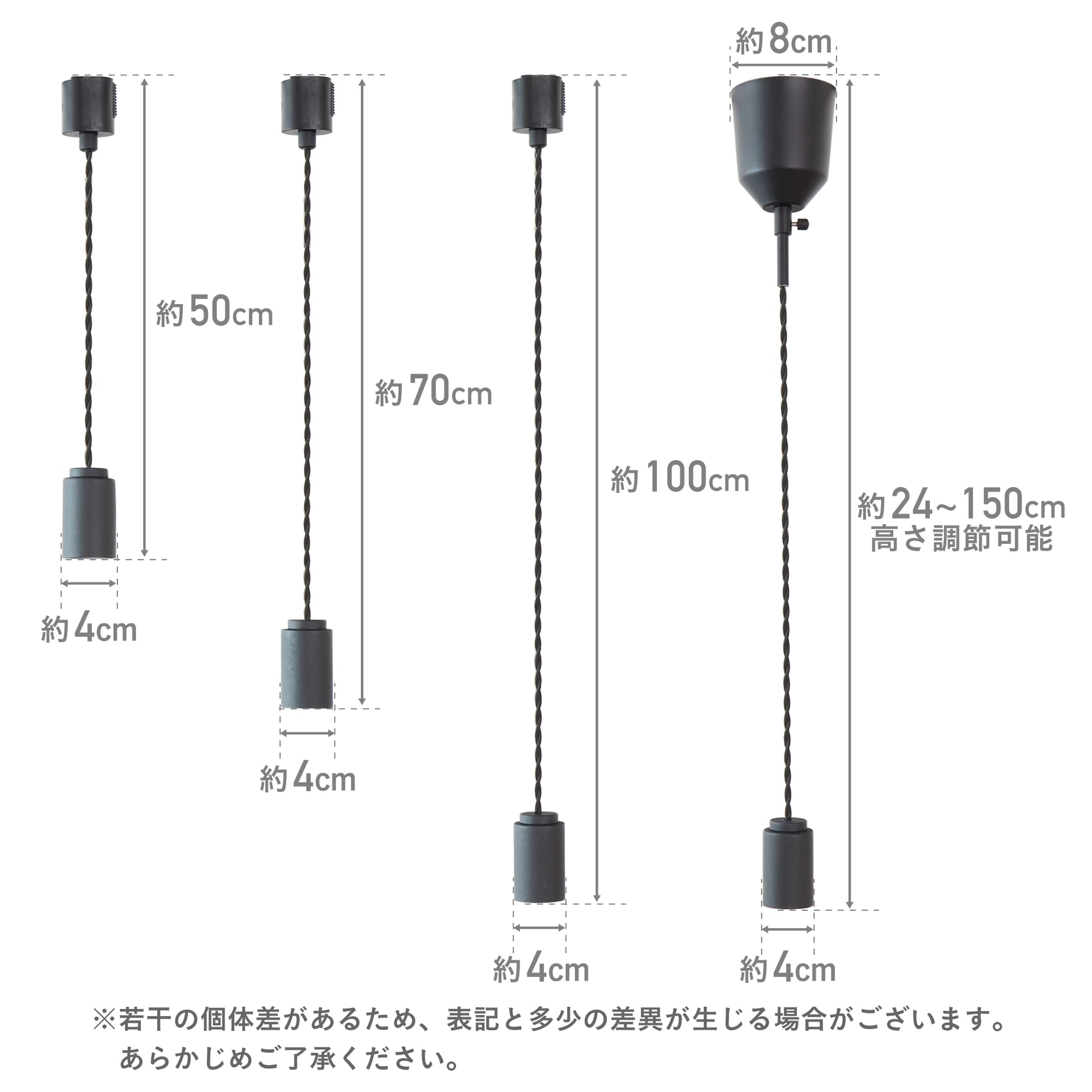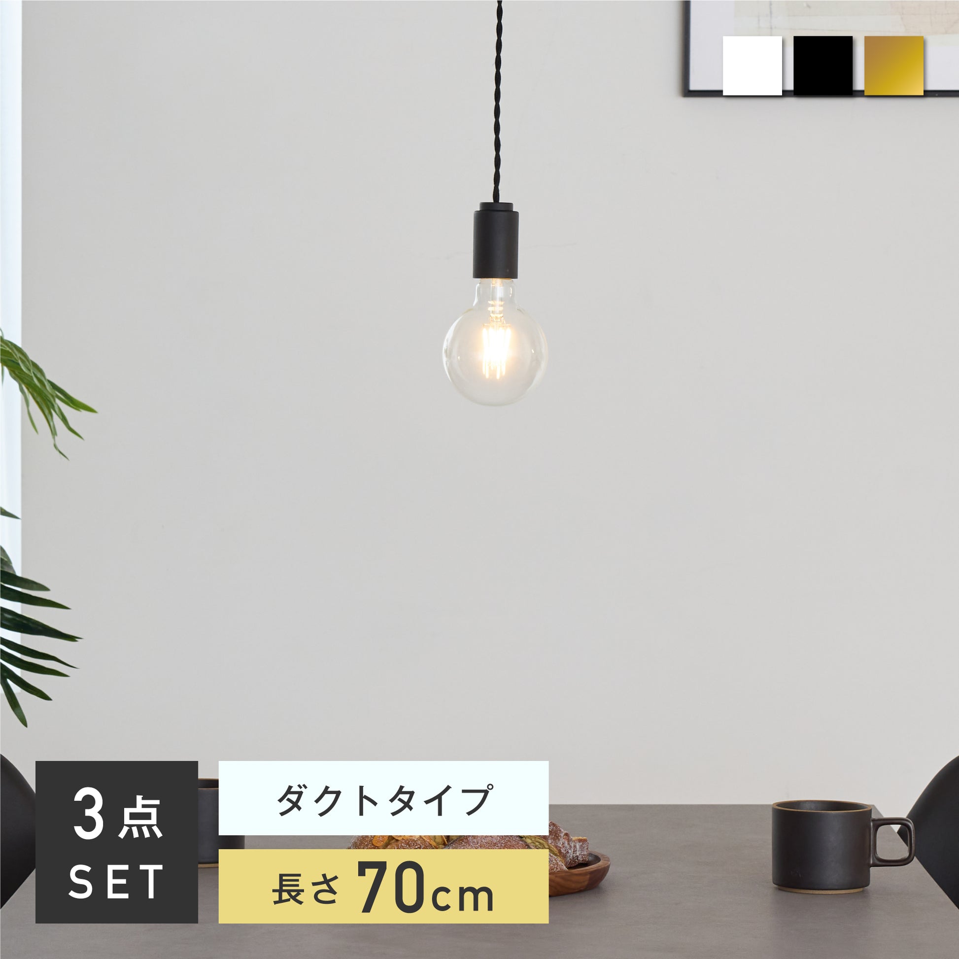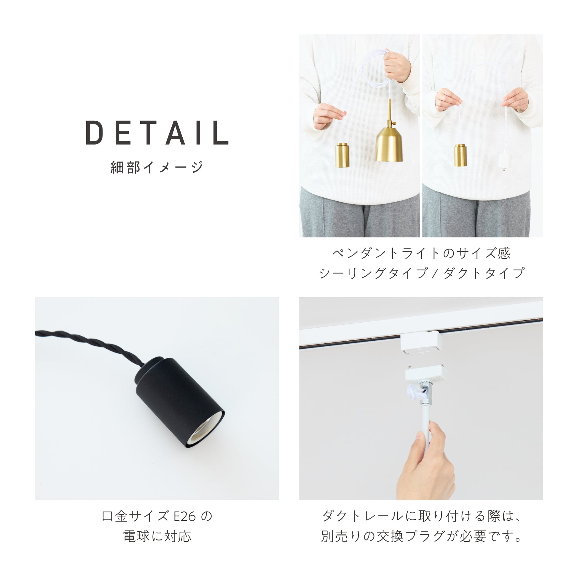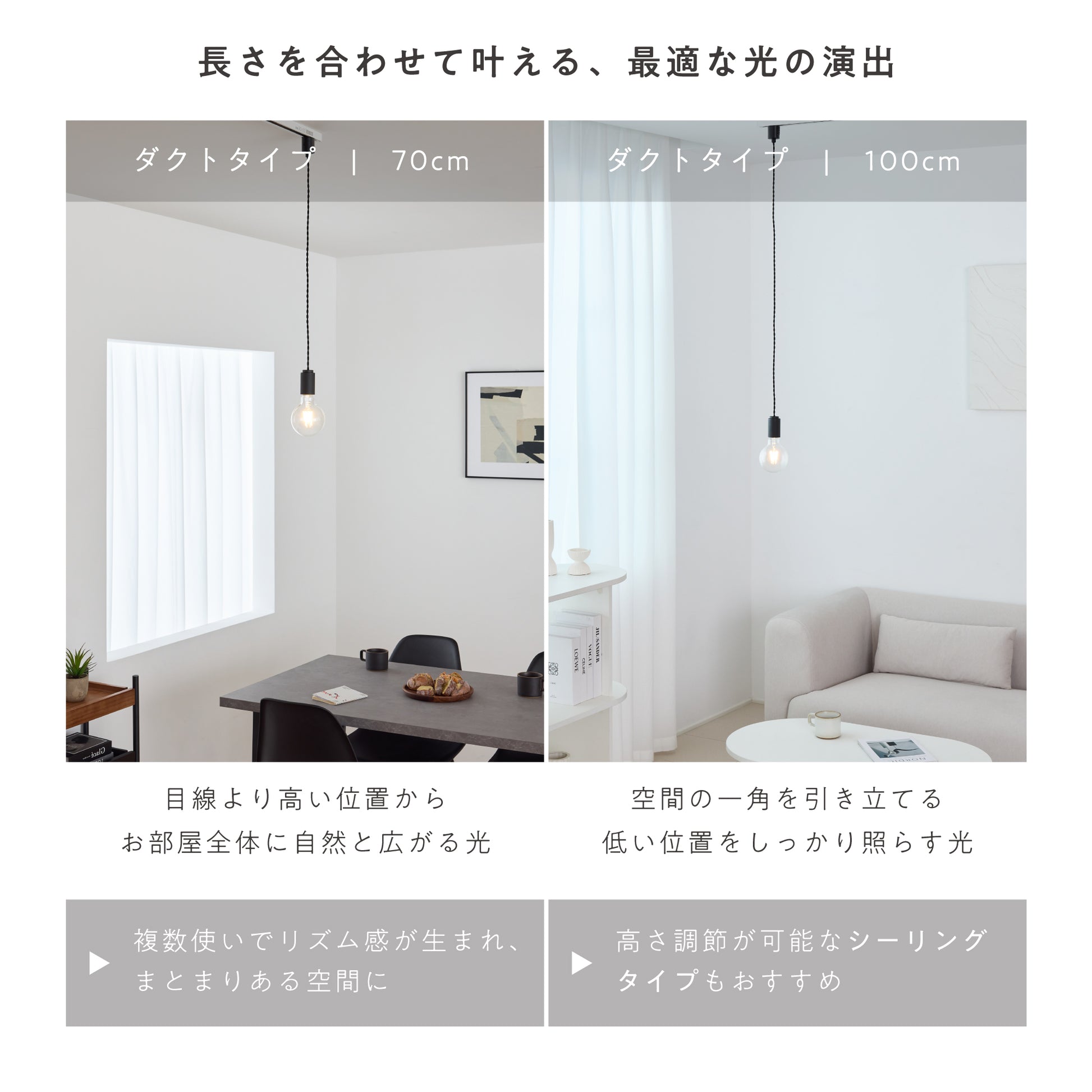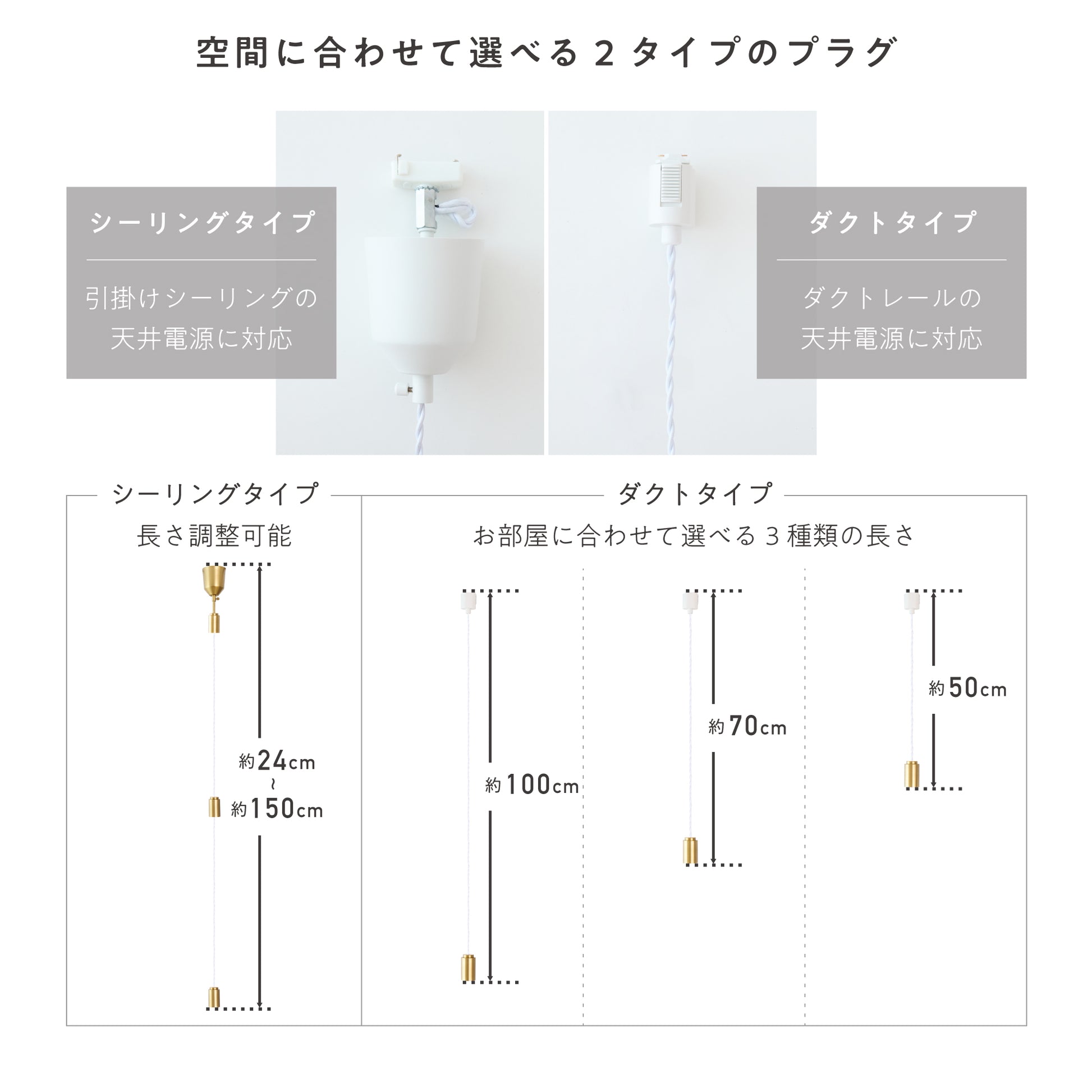 設置環境に合わせて選べる、シーリングとダクトレールの2種類のプラグをご用意。シーリングタイプは24〜150cmで長さ調整が可能、ダクトレールタイプは50・70・100cmから選べます。複数設置した際のリズム感や他の照明との調和を考えた空間演出が可能です。軽量設計で取り付けや取り外しも簡単。ライフスタイルの変化にも柔軟に対応でき、長く安心してお使いいただけます。