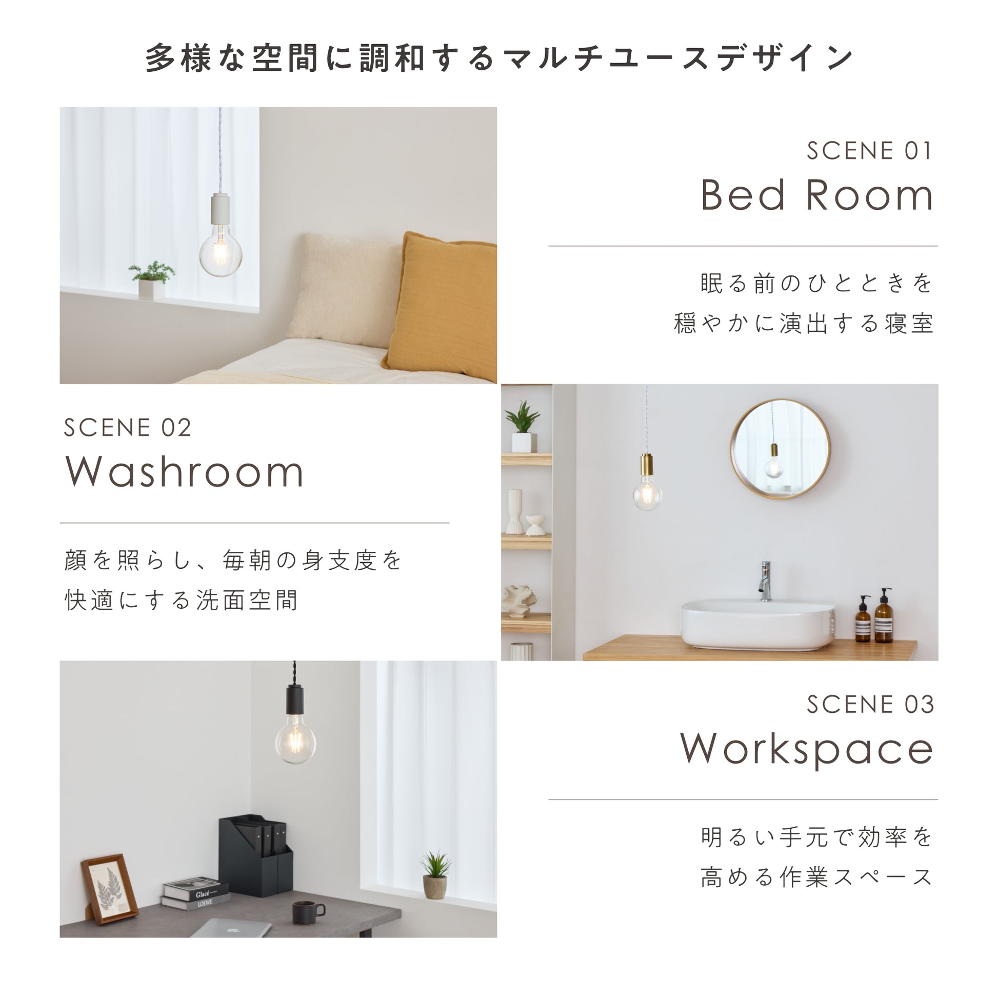 寝室や洗面所、作業場などさまざまな場所に取り入れやすい、シンプルなデザイン。複数並べて使っても住まい全体を統一感のある雰囲気に整えられます。コンパクトなサイズ設計で、限られたスペースにも圧迫感なく設置可能。模様替えやライフスタイルの変化にも柔軟に対応し、長く使い続けられるペンダントライトです。